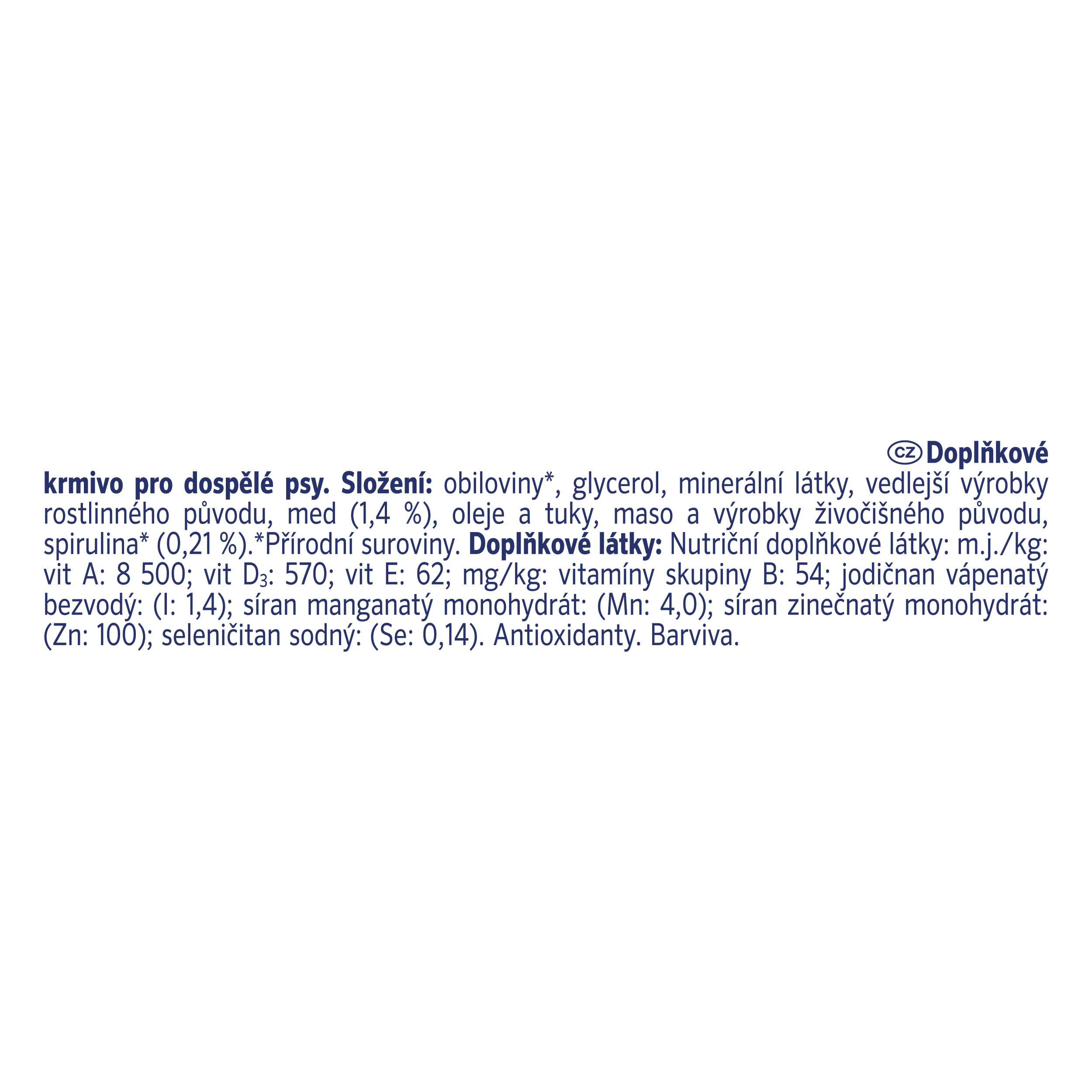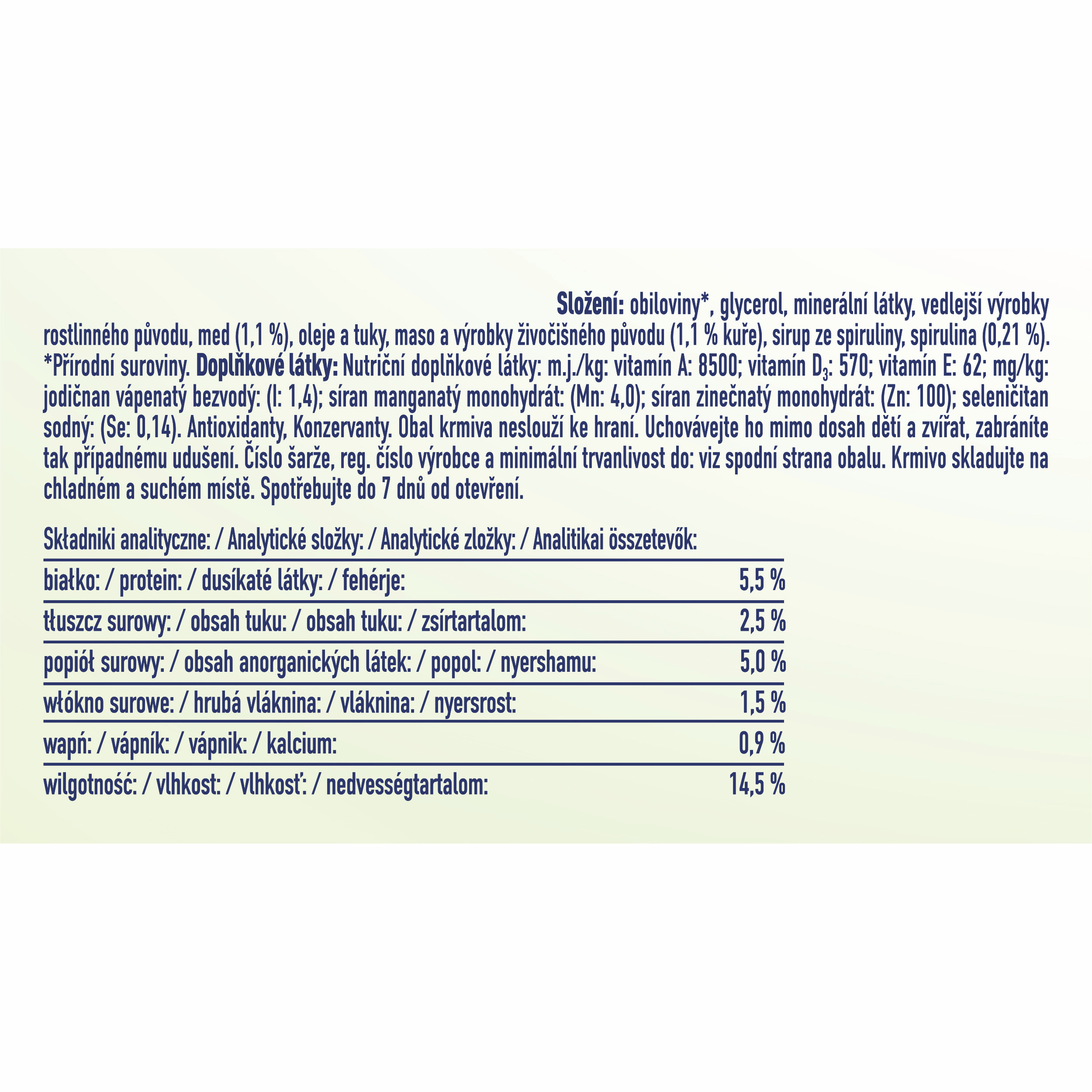 Obiloviny*, glycerol, minerální látky, vedlejší výrobky rostlinného původu, med (1,1 %), oleje a tuky, maso a výrobky živočišného původu (1,1 % kuře), sirup ze spiruliny, spirulina* (0,21 %)