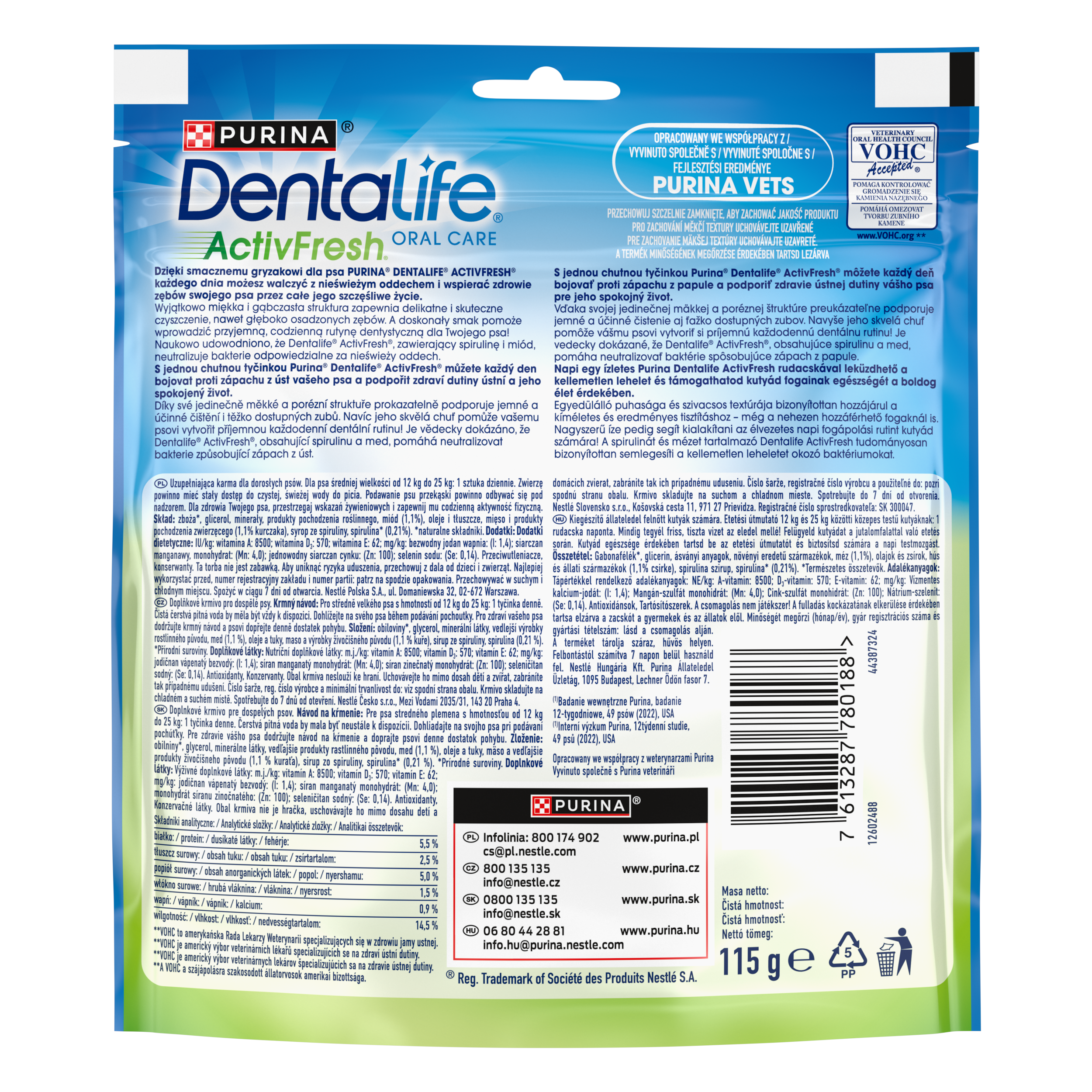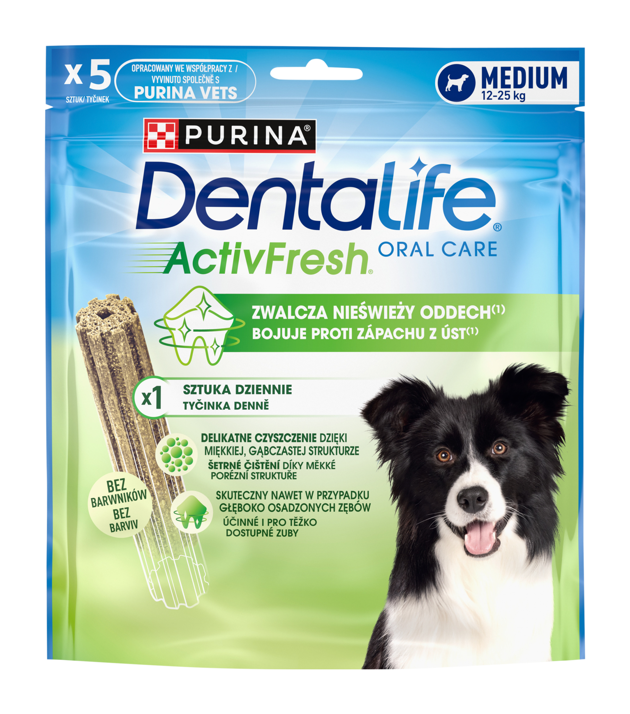 Doplňkové krmivo pro dospělé psy. S jednou chutnou tyčinkou Purina® Dentalife® ActivFresh® můžete každý den bojovat proti zápachu z úst vašeho psa a podpořit zdraví dutiny ústní a jeho spokojený život. Díky své jedinečně měkké a porézní struktuře prokazatelně podporuje jemné a účinné čištění i těžko dostupných zubů. Navíc jeho skvělá chuť pomůže vašemu psovi vytvořit příjemnou každodenní dentální rutinu! Je vědecky dokázáno, že Dentalife® ActivFresh®, obsahující spirulinu a med, pomáhá neutralizovat bakterie způsobující zápach z úst.