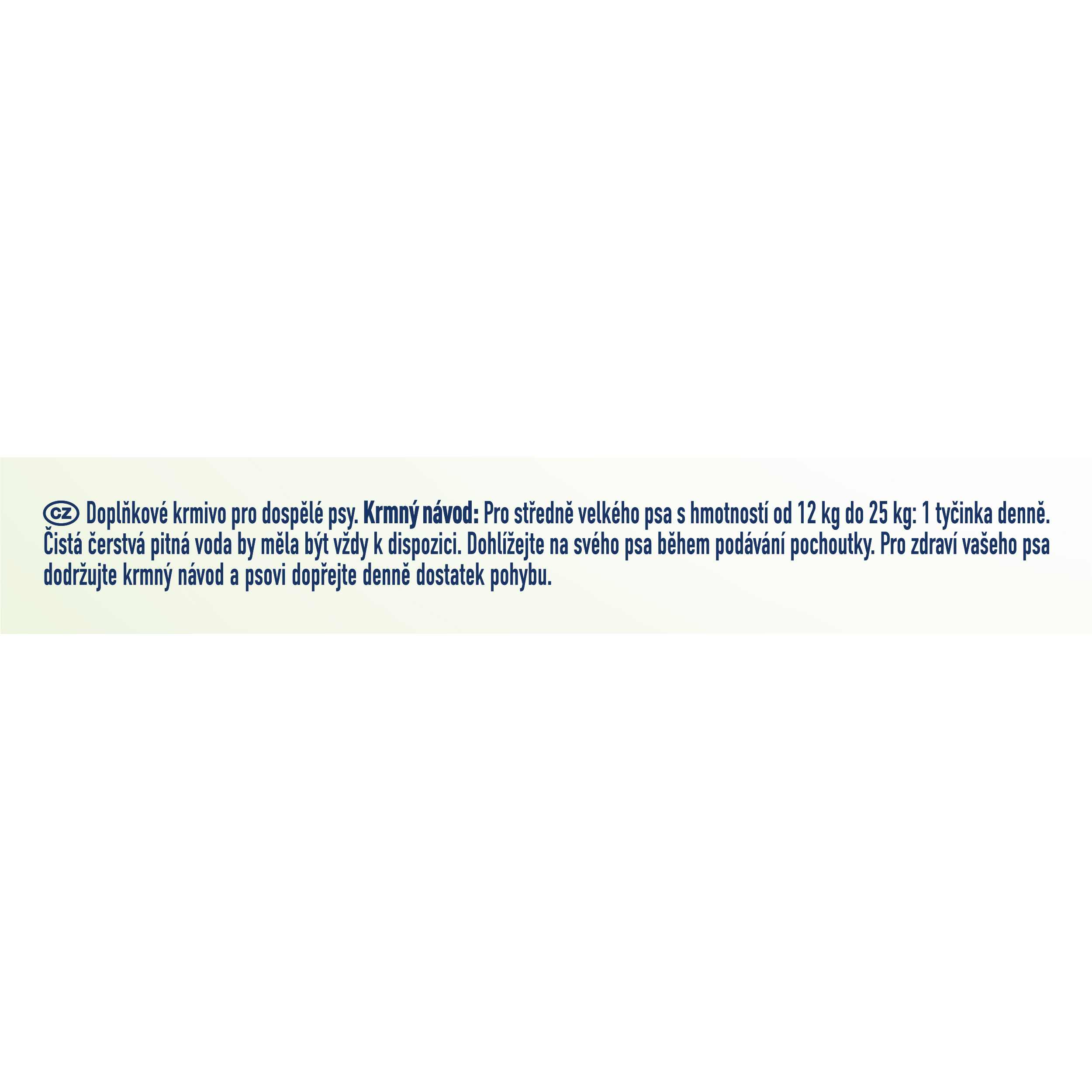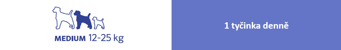 Krmný návod: Pro středně velkého psa s hmotností od 12 kg do 25 kg: 1 tyčinka denně. Čistá čerstvá pitná voda by měla být vždy k dispozici. Dohlížejte na svého psa během podávání pochoutky. Pro zdraví vašeho psa dodržujte krmný návod a psovi dopřejte denně dostatek pohybu.