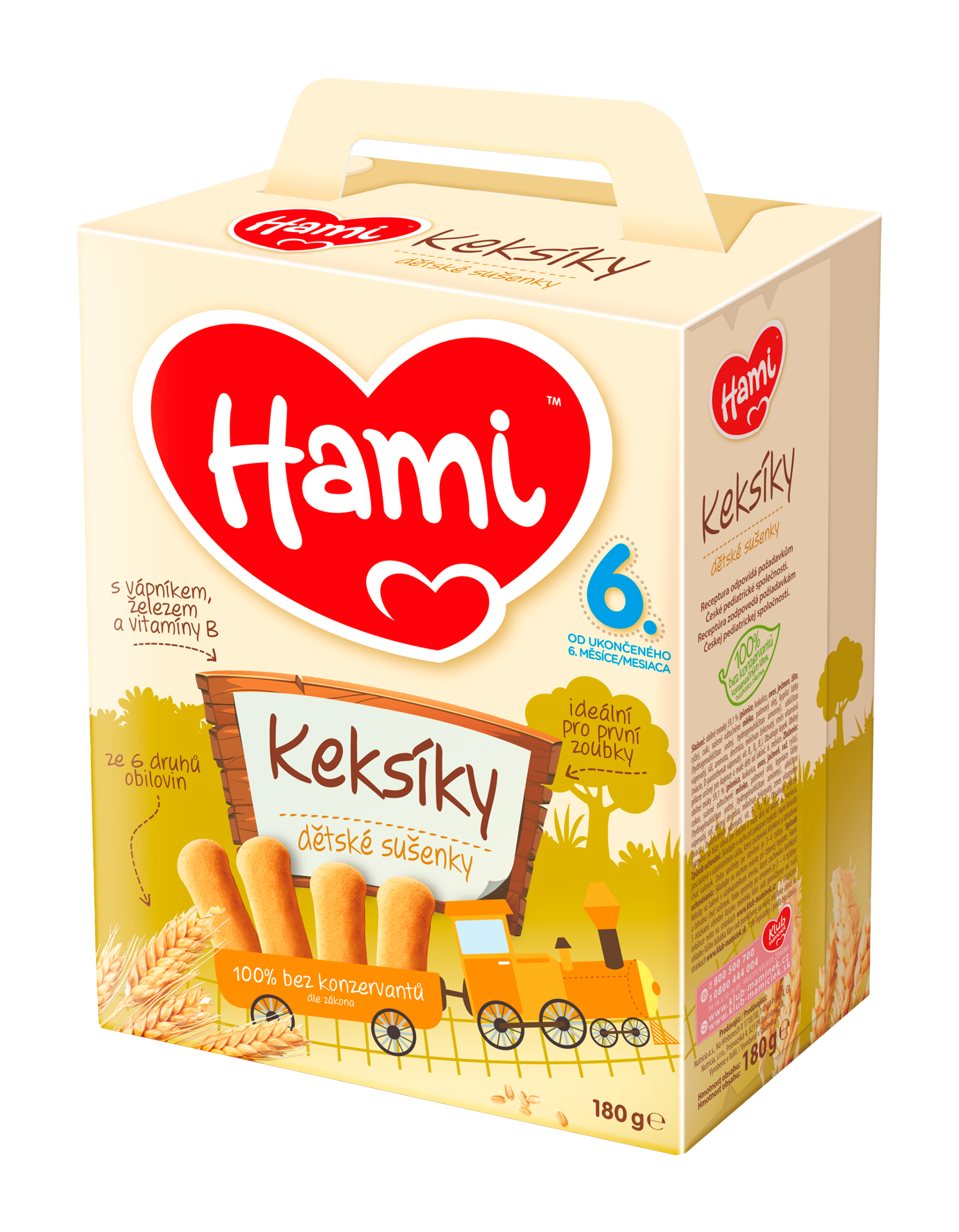 Obilné křupavé sušenky Hami Keksíky od ukončeného 6. měsíce obsahují vápník, železo a vybrané vitamíny skupiny B. Tvarem a velikostí jsou speciálně uzpůsobeny do malých dětských ručiček a jsou vhodné pro prořezávání prvních zoubků. Receptura odpovídá požadavkům České pediatrické společnosti.