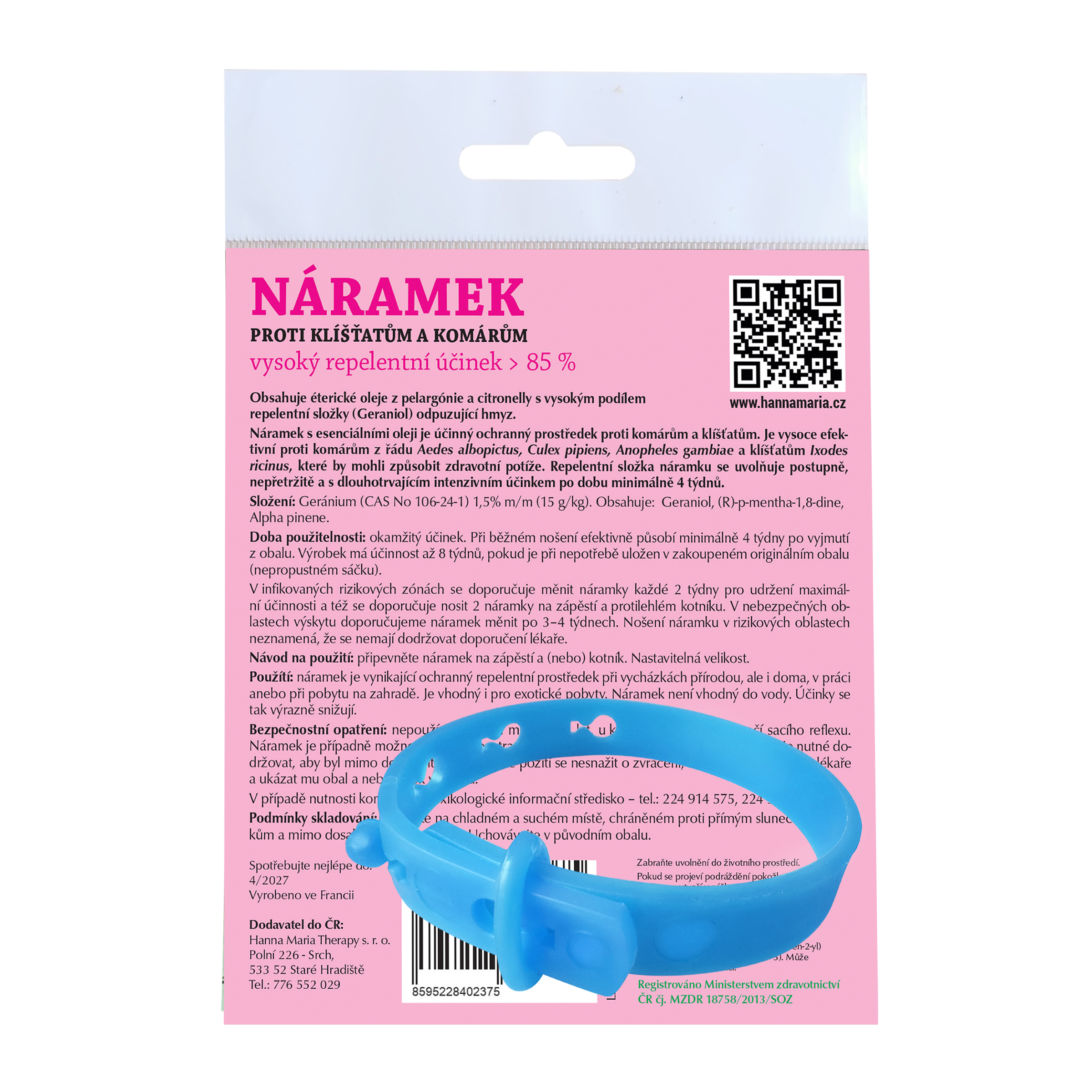 Náramek s esenicálními oleji je účinný ochranný prostředek propti komárům a klíšťatům. Repelentní složka náramku se uvolňuje postupně, nepřetržitě a s dlouhotrvajícím intenzivním účinkem po dobu minimálně 4 týdnů. Výrobek má účinnost až 8 týdnů, pokud je uložen v nepropustném sáčku.