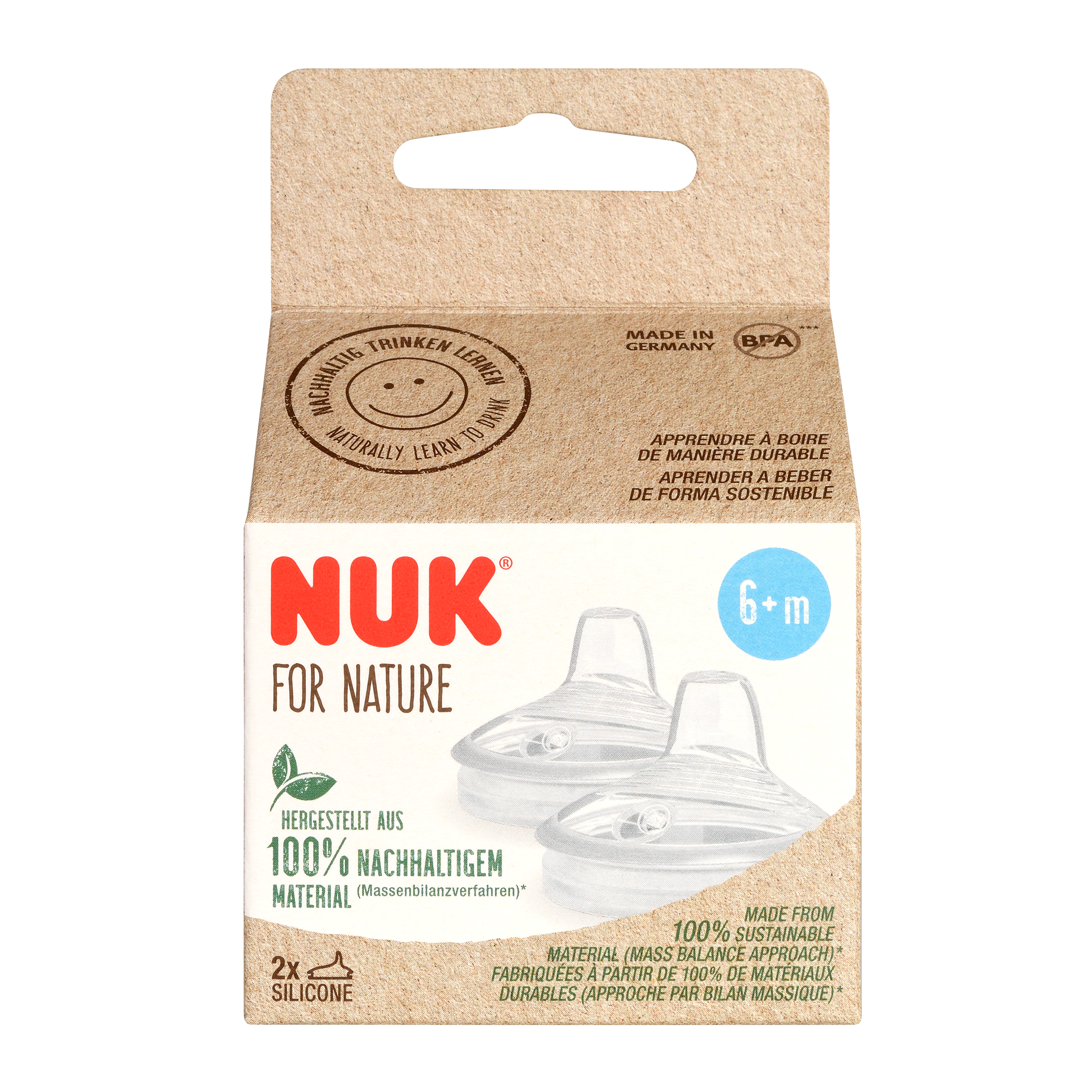 - Nekapající, pro děti od 6 měsíců, neobsahuje BPA, lze kombinovat s lahvičkou na učení NUK for Nature, baleno pouze do papíru s certifikací FSC.