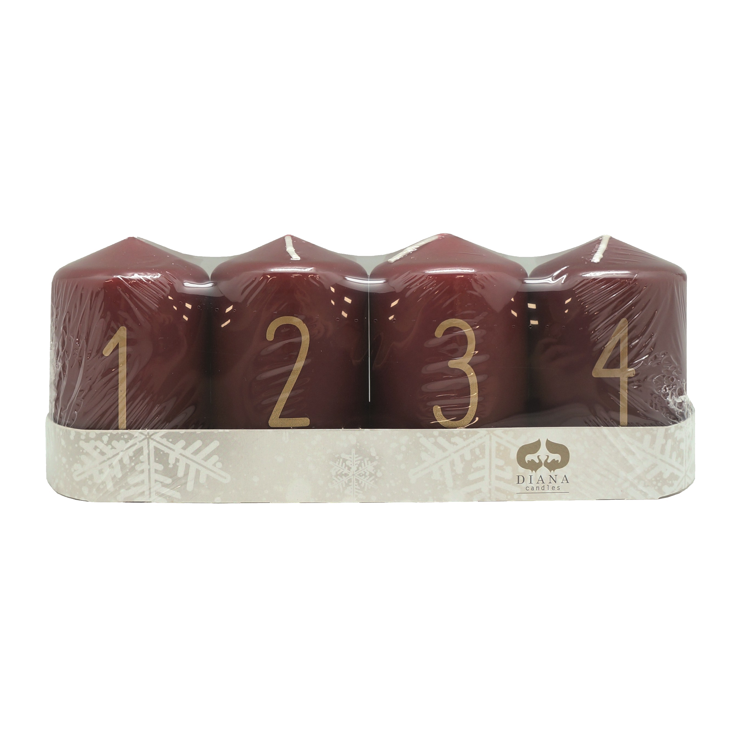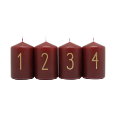 Připravte se na kouzelný čas adventu s elegantní sadou čtyř adventních svíček v tmavě červené barvě. Každá svíčka má válcovitý tvar a je označena zlatým číslem od 1 do 4, což dodává slavnostní nádech každé neděli adventu. Ideální pro tradiční adventní věnce i samostatné dekorace.