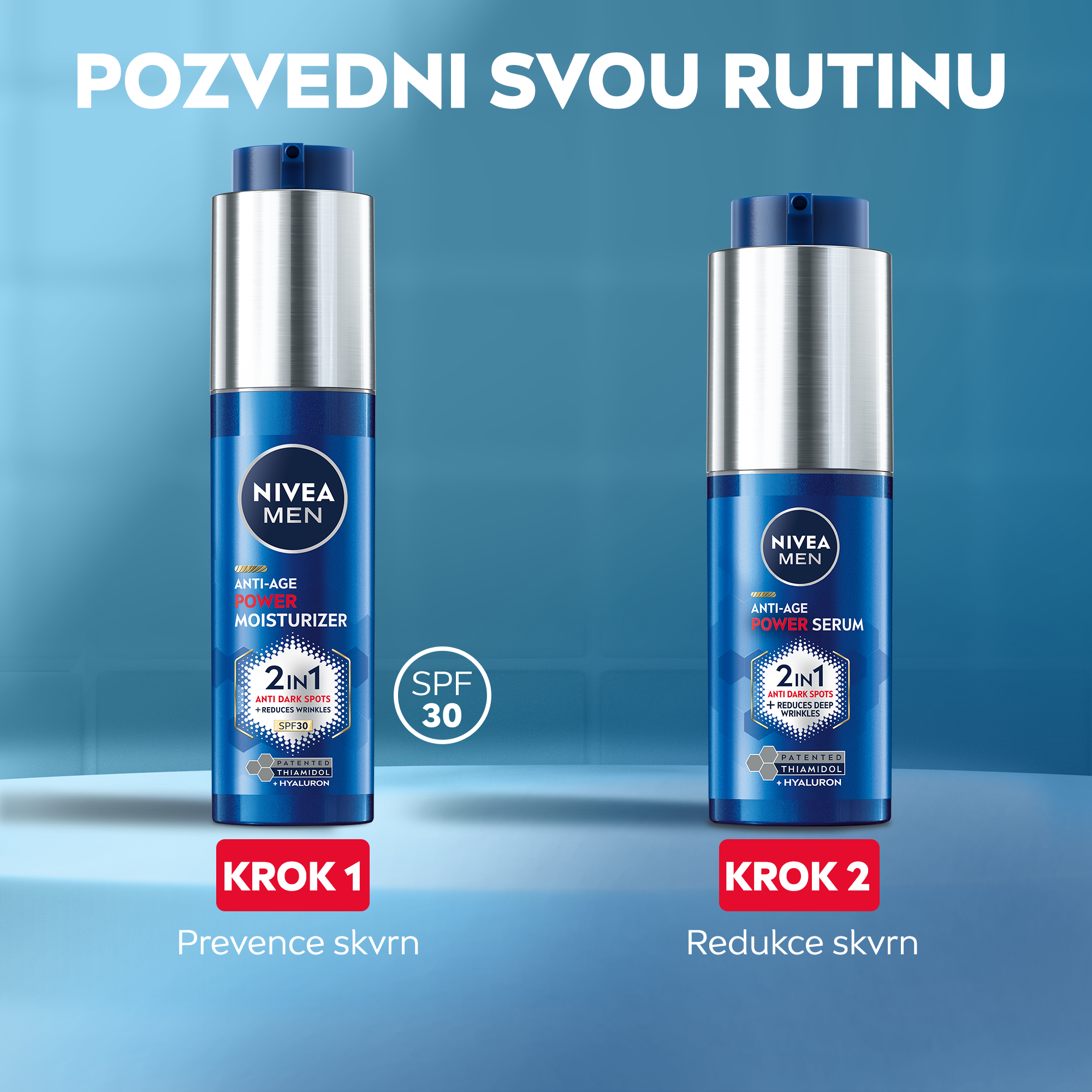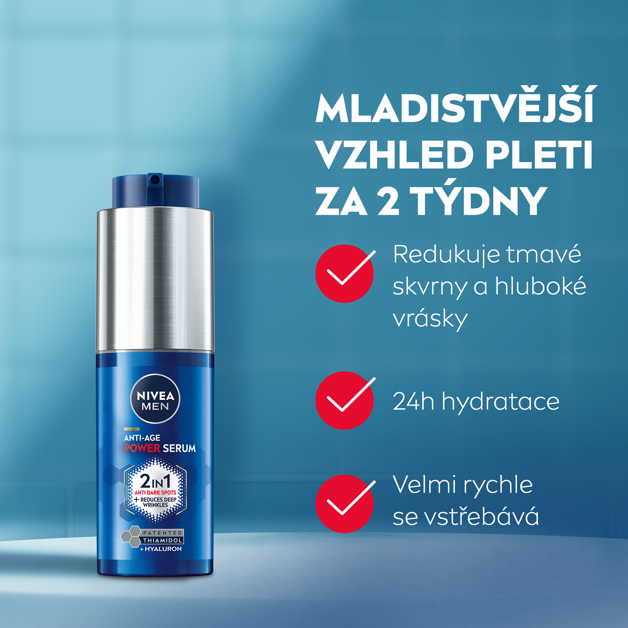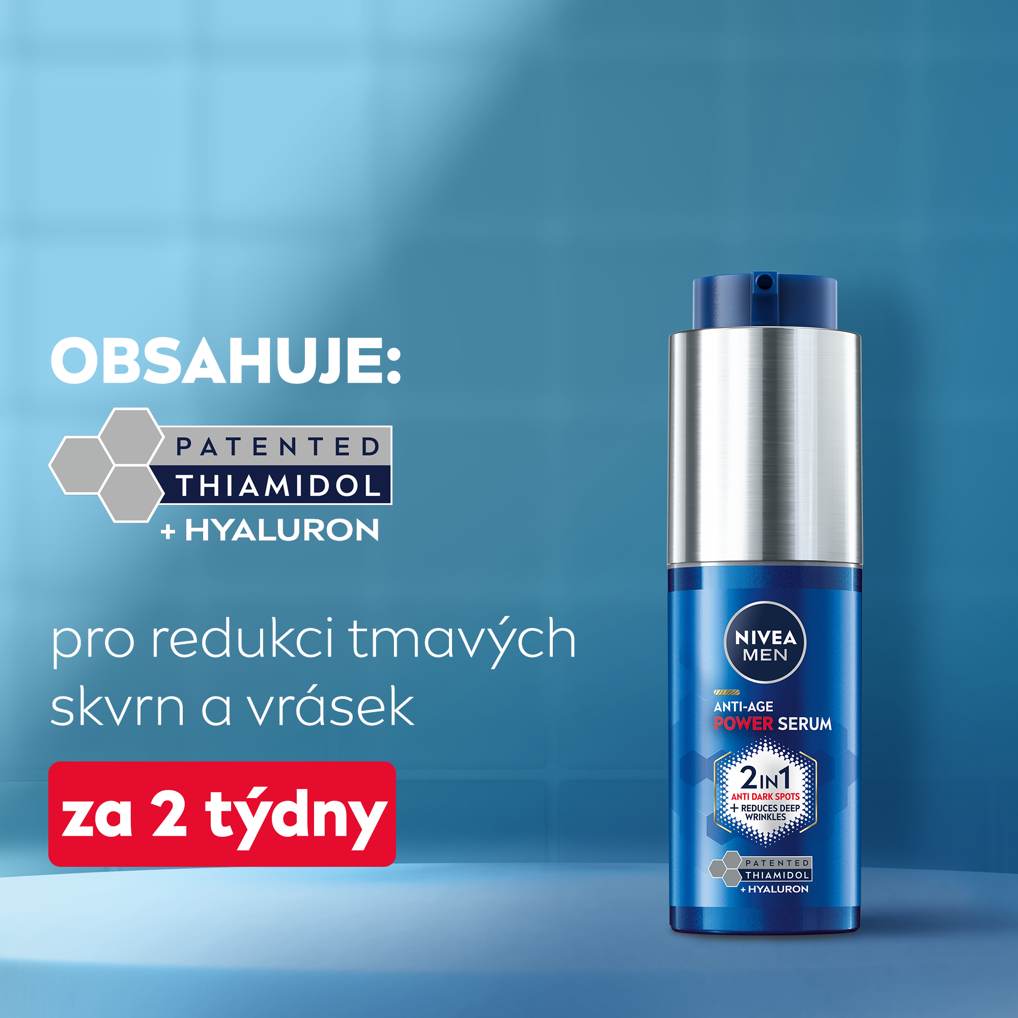 Ultra lehké, rychle se vstřebávající složení bylo vyvinuto speciálně pro mužskou pleť a dodá jí 24 h hydrataci. Obsahuje nejvyšší koncentraci látky Thiamidol® v řadě Nivea® Men Hyaluron. Mladší vzhled pleti již za 2 týdny. 94 % mužů potvrdilo viditelnou redukci tmavých skvrn.* *sebehodnocení, 12 týdnů, 34 mužů, 2022.