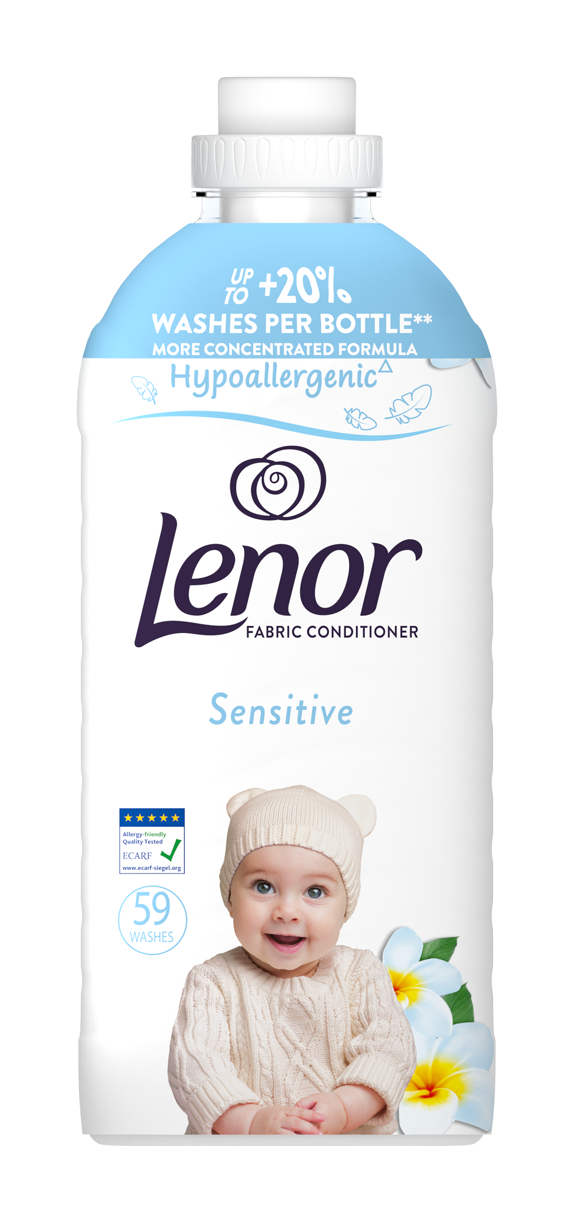 Hypoalergenní aviváž Lenor Sensitive dodává prádlu neutrální vůni a nebeskou hebkost. Složení je navrženo pro citlivou pokožku, dermatologicky testováno (testováno na pokožce, která je v kontaktu s vypranou tkaninou) a certifikováno Evropským centrem pro výzkum alergií ECARF.