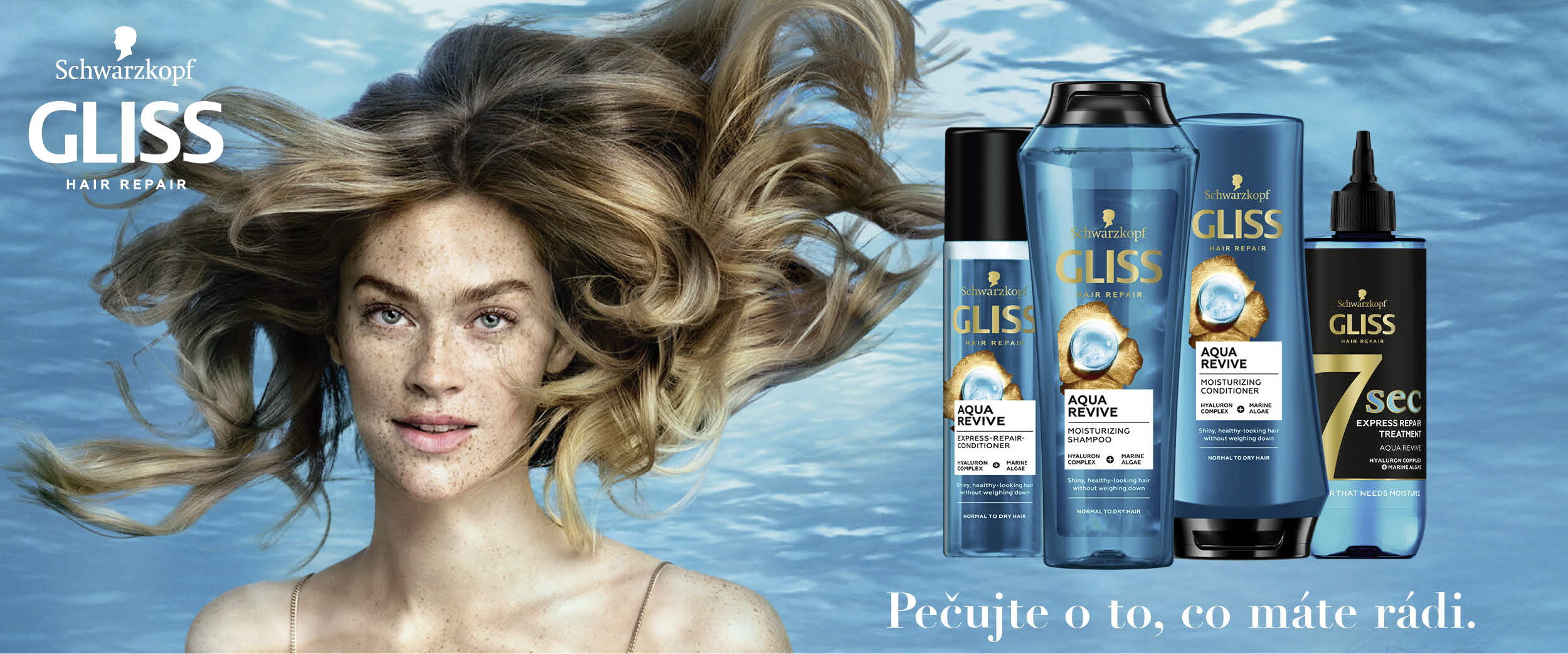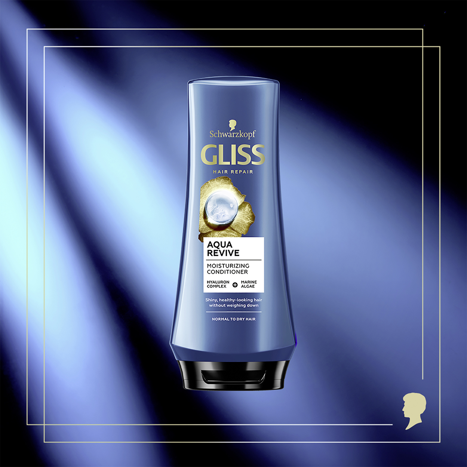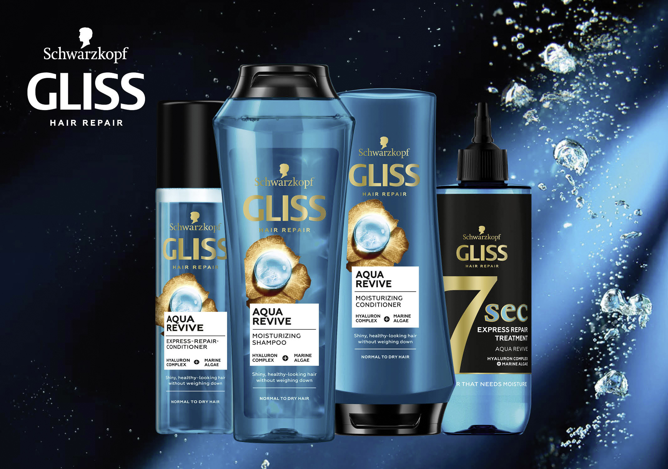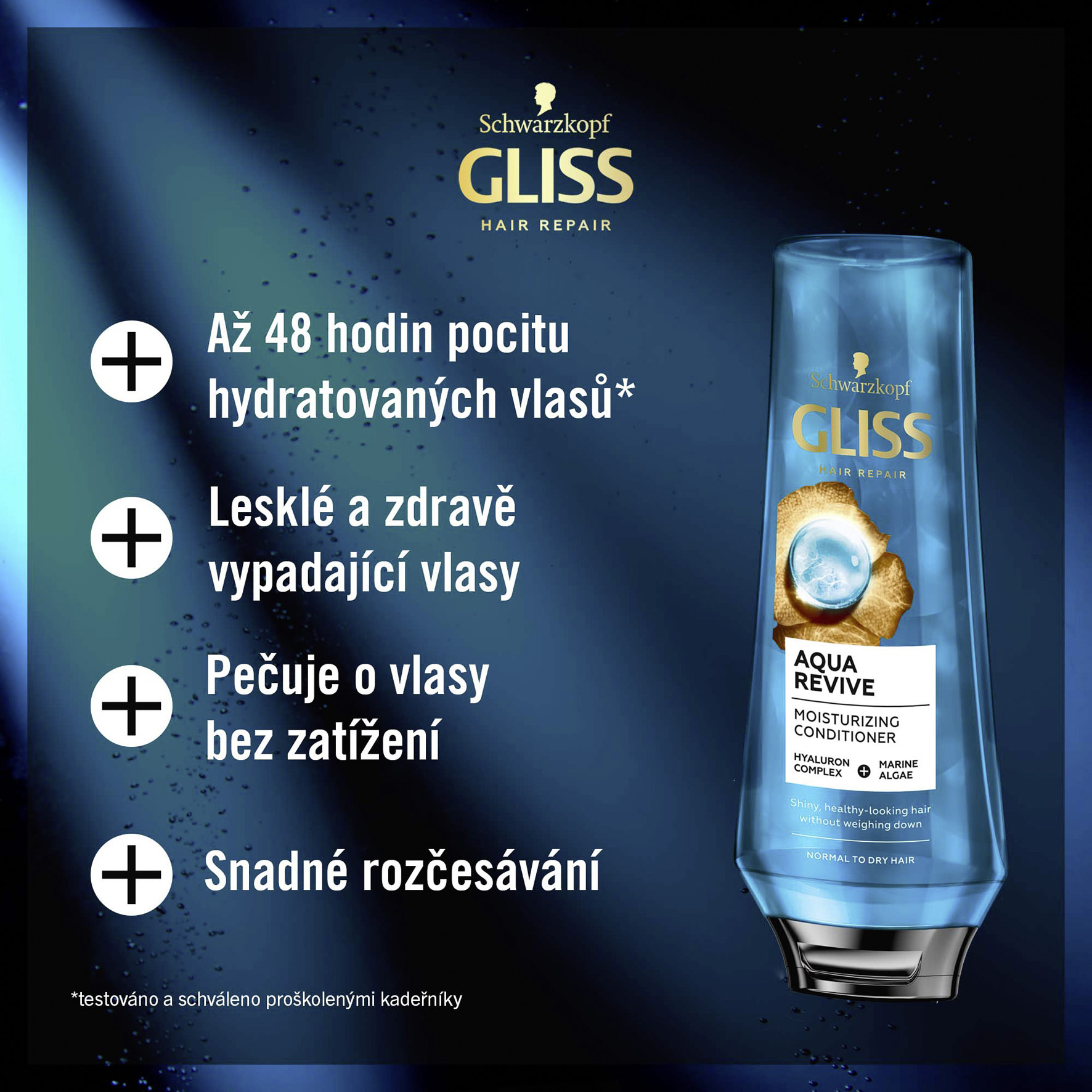 - Kondicionér Gliss Aqua Revive s hyaluronovým komplexem + mořskými řasami pro normální až suché vlasy. Smývatelný. Zdravě vypadající vlasy. Dokonalá rozčesatelnost a vlasy hydratované až na 48 hodin po jedné aplikaci.