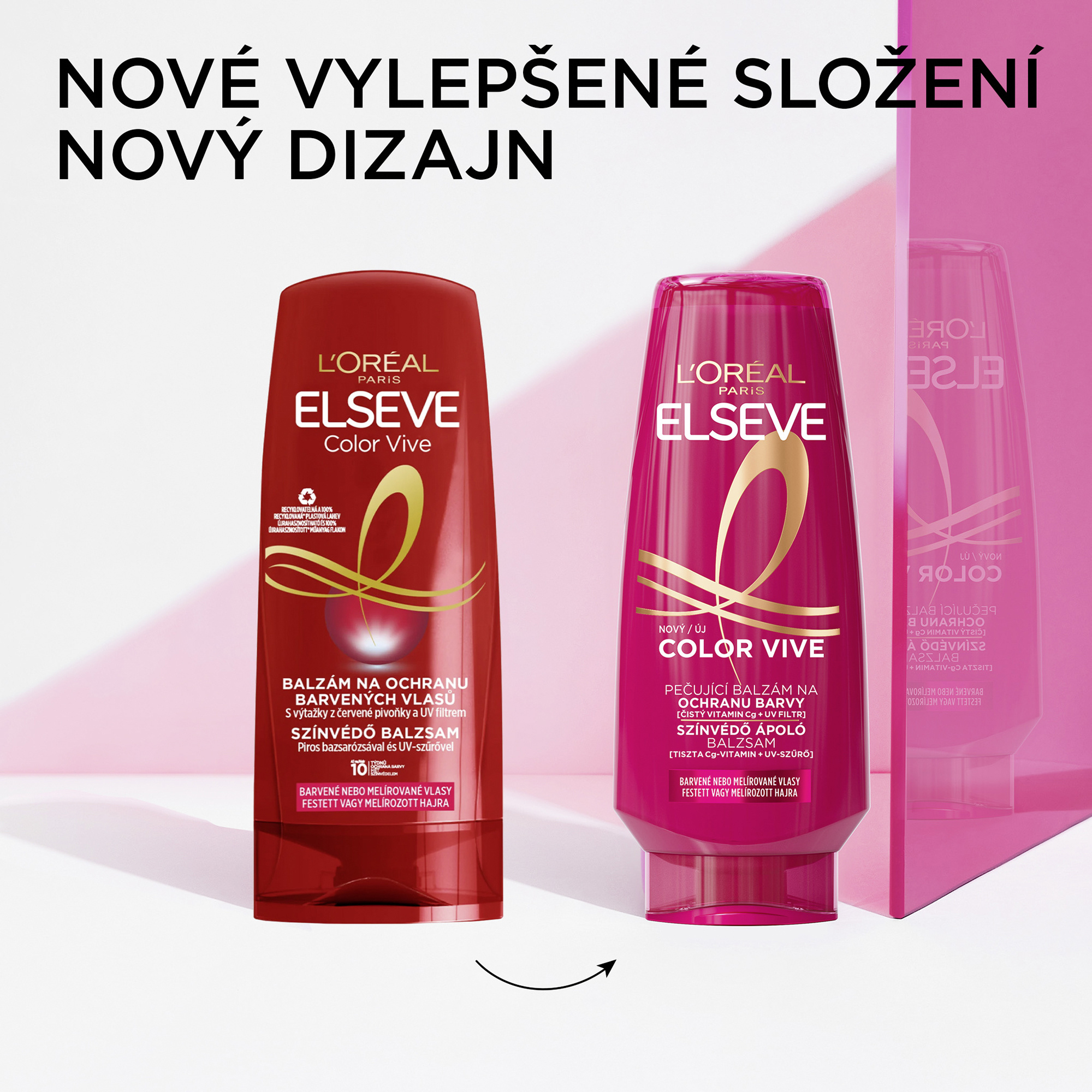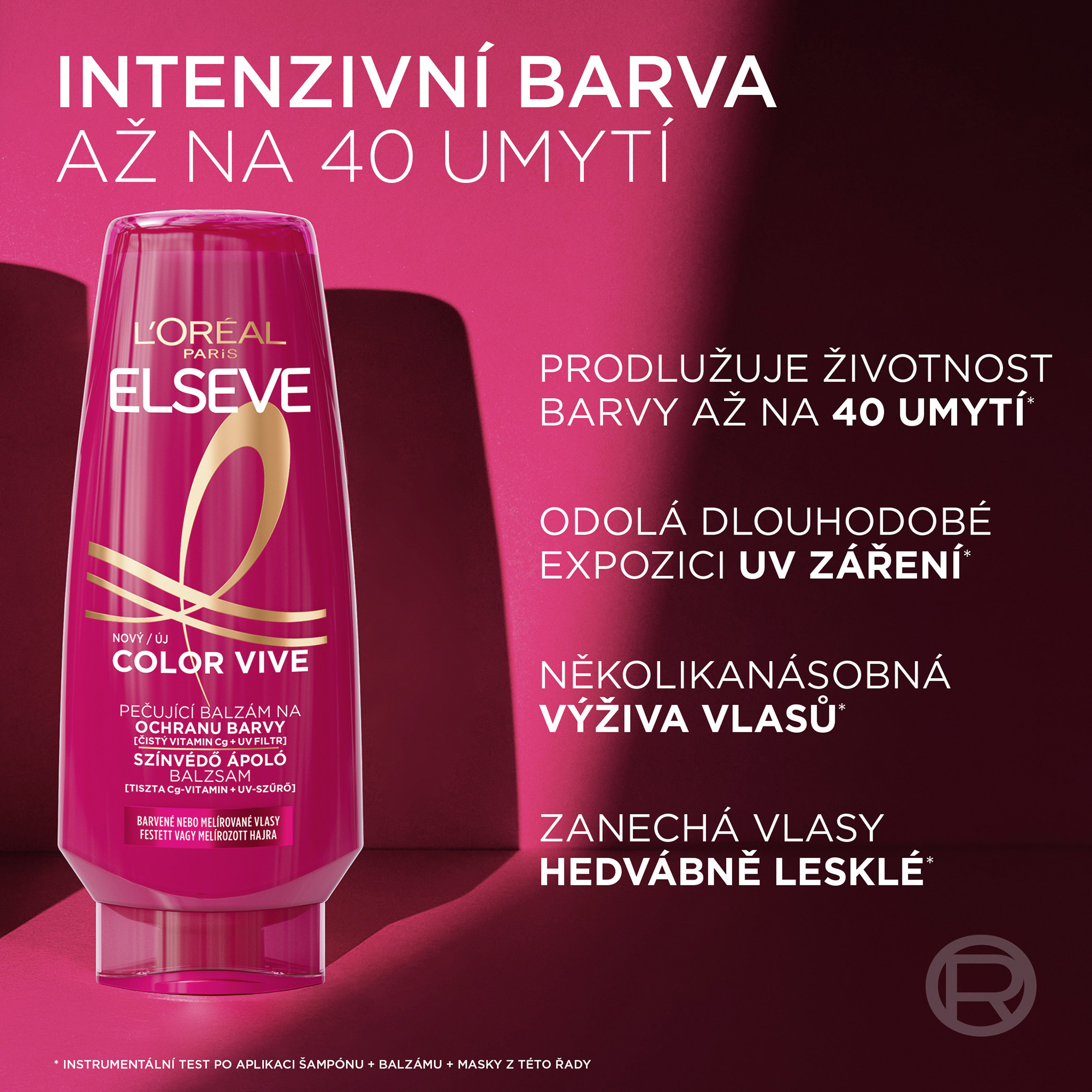Balzám Elseve Color Vive chrání barvené a melírované vlasy před vnějšími vlivy a prodlužuje životnost barvy a lesk vlasů.