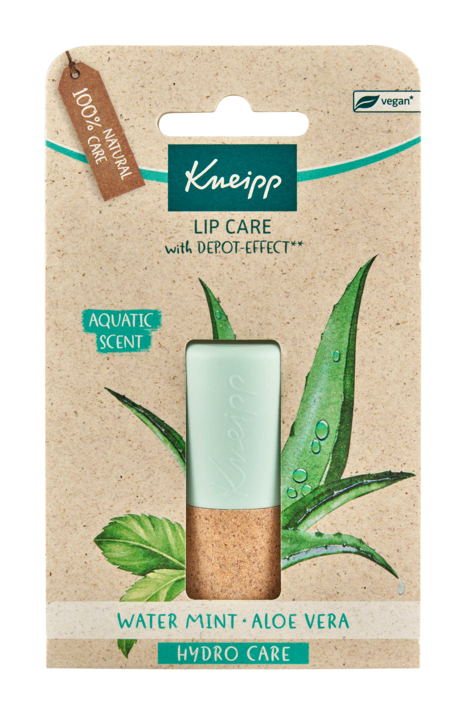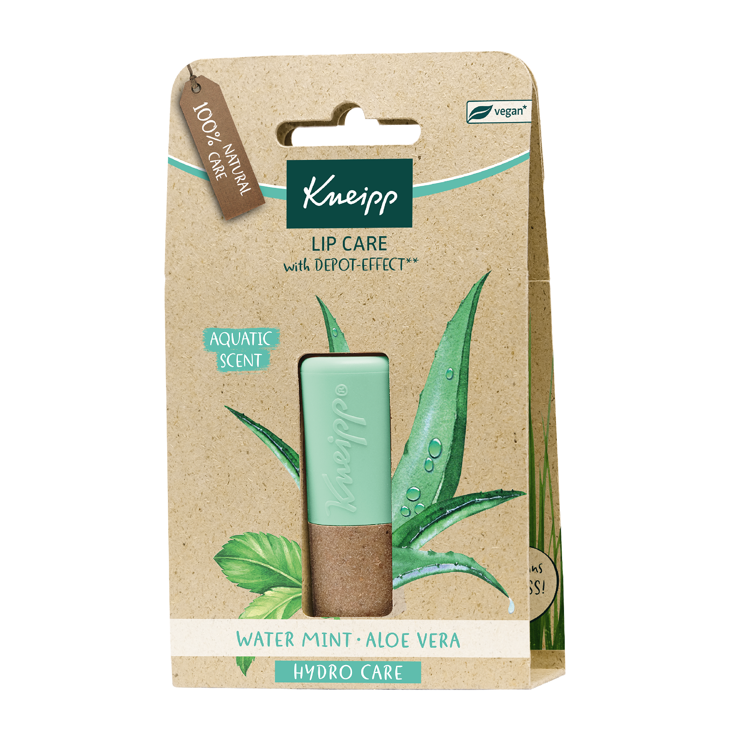 Kneipp® balzám na rty s cenným extraktem z aloe vera a máty. Kosmetický přípravek. Do tohoto výrobku nebyly přidány žádné přísady živočišného původu. Hýčká rty dlouhodobě a intenzivně díky prokazatelnému postupnému vstřebávání.