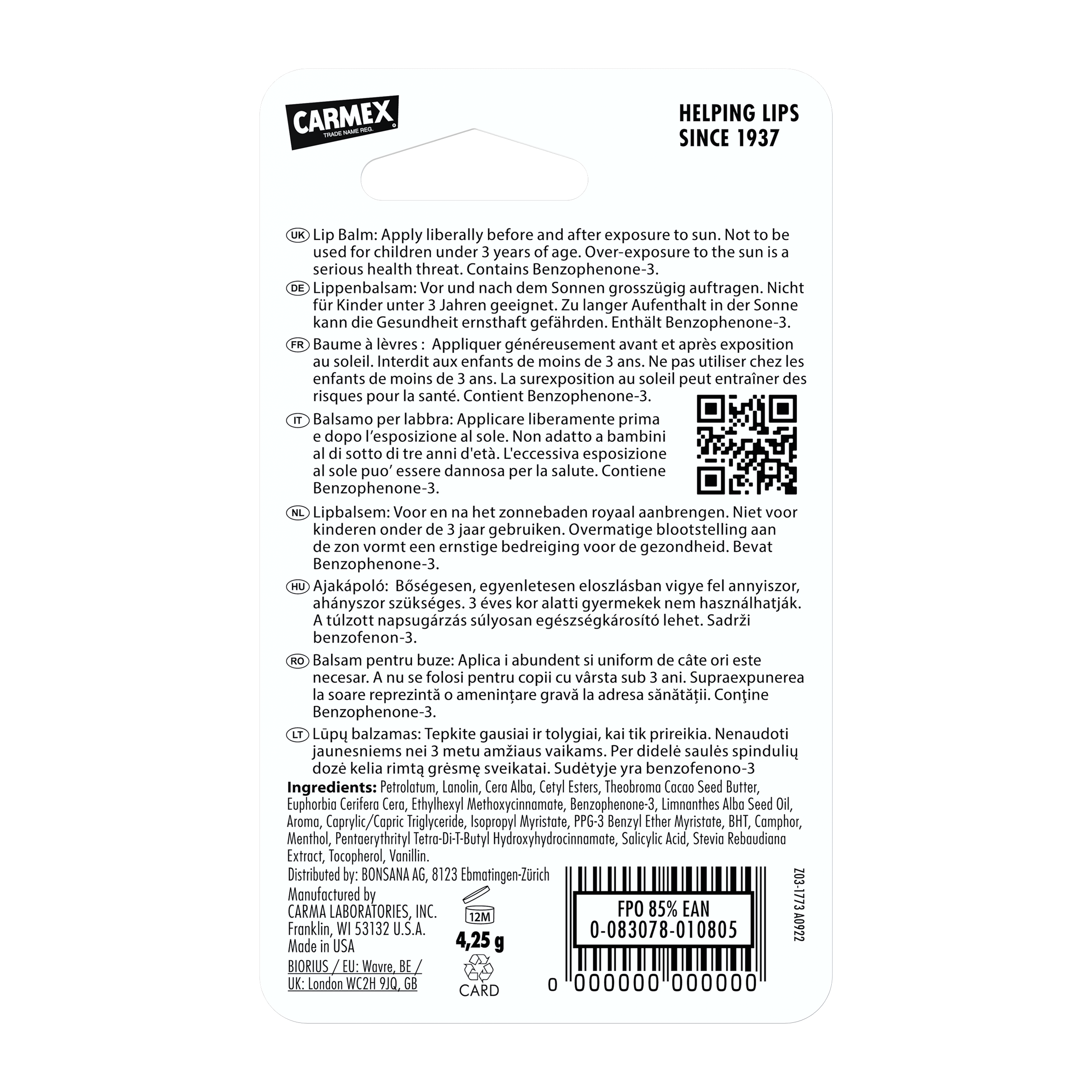 petrolatum lanolin euphobija cerifera cera,ethylhexyl, methoxycinnamate, benzophenone-3, ozorekite, cetyl esters,theobroma cacao,seed butter, cera alba, paraffin, camphor, menthol, salicylic acid, parfum, vanilin hydroxycitronelal, limonene, linalool, geraniol,citronello