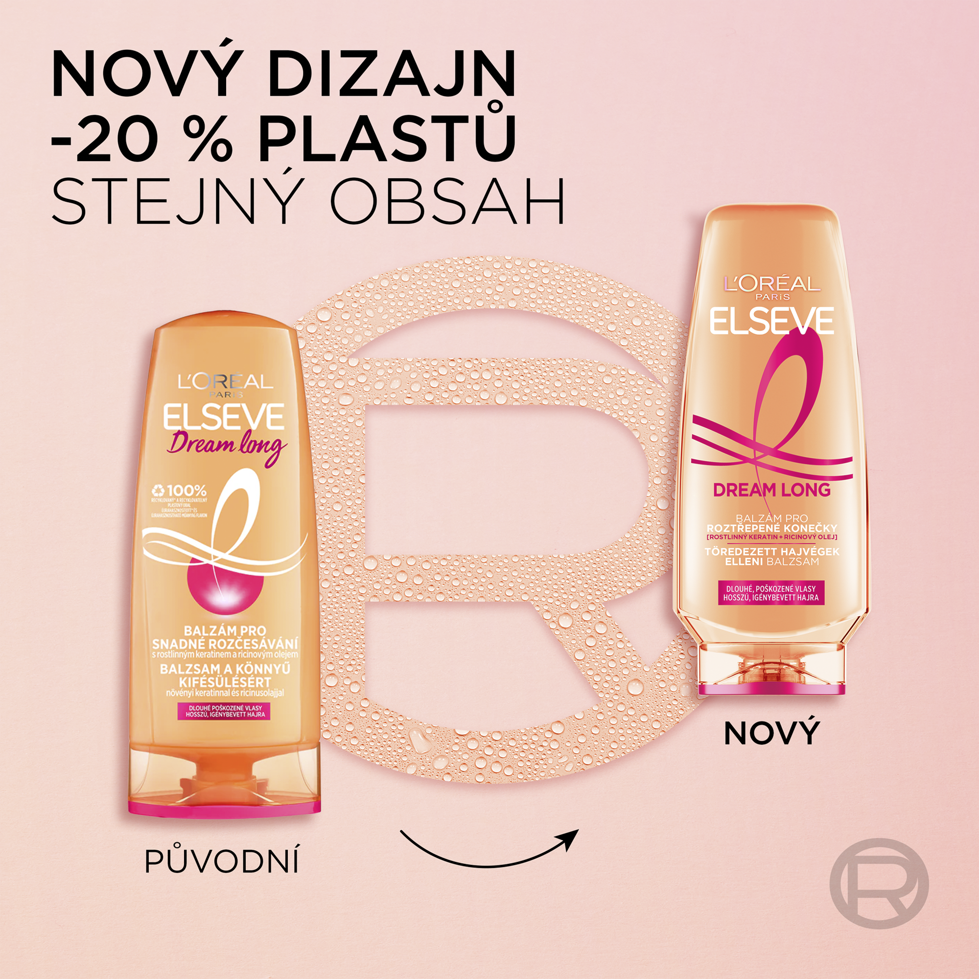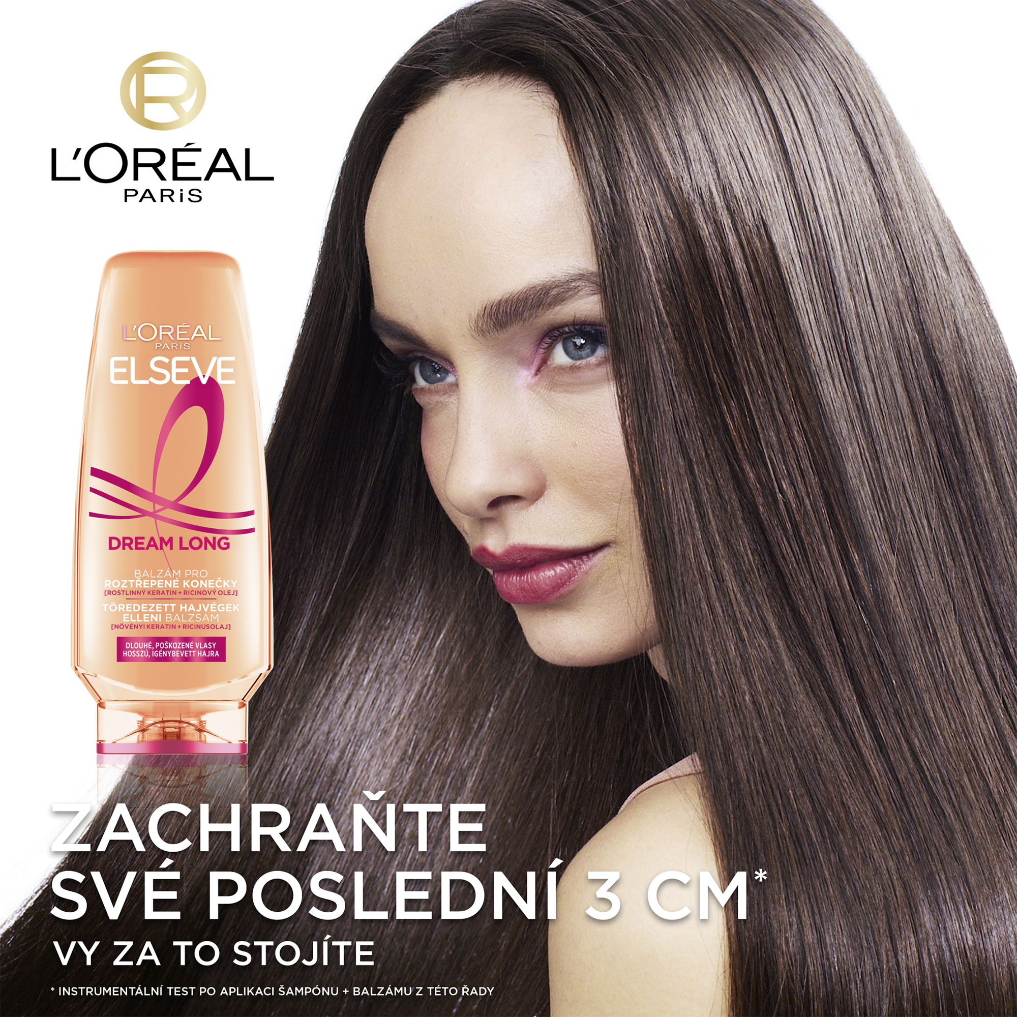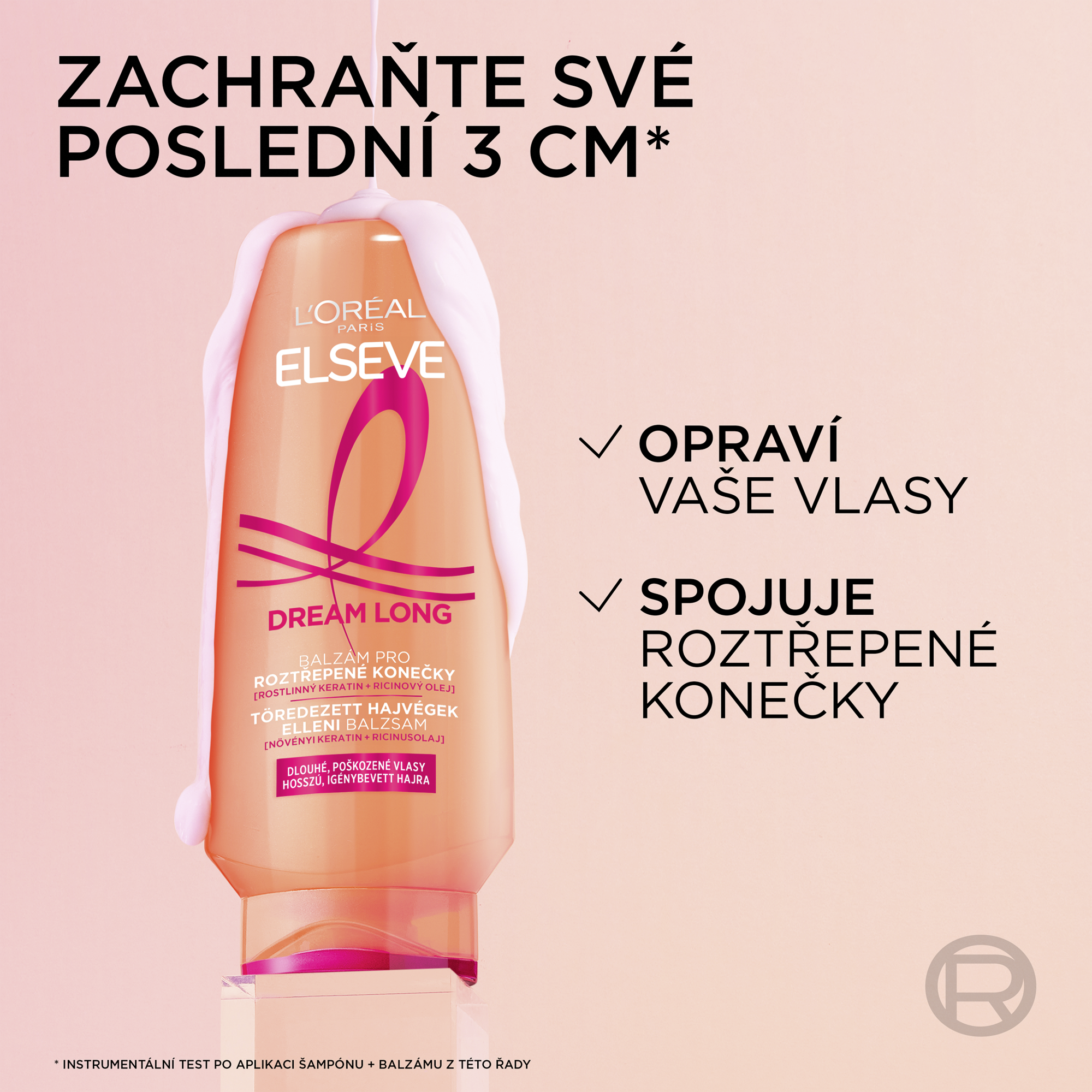 Jak mít dlouhé vlasy? Dream Long je první komplexní řada od Elseve pro dosažení dlouhých vlasů jako z vašich snů. Rozlučte se s poškozenými délkami a roztřepenými konečky díky jedinečnému složení s ricinovým olejem a vitamíny. Řada Dream Long regeneruje a vyživuje vlasy, posiluje vlasová vlákna a stimuluje růst vlasů. Balzám pro snadné rozčesávání vlasů pomáhá předcházet poškození vlasů způsobené česáním, při které se vlasy lámou a třepí. ZACHRAŇ POSLEDNÍ 3 CM* *Instrumentální test šamponu + balzámu z produktové řady Dream Long