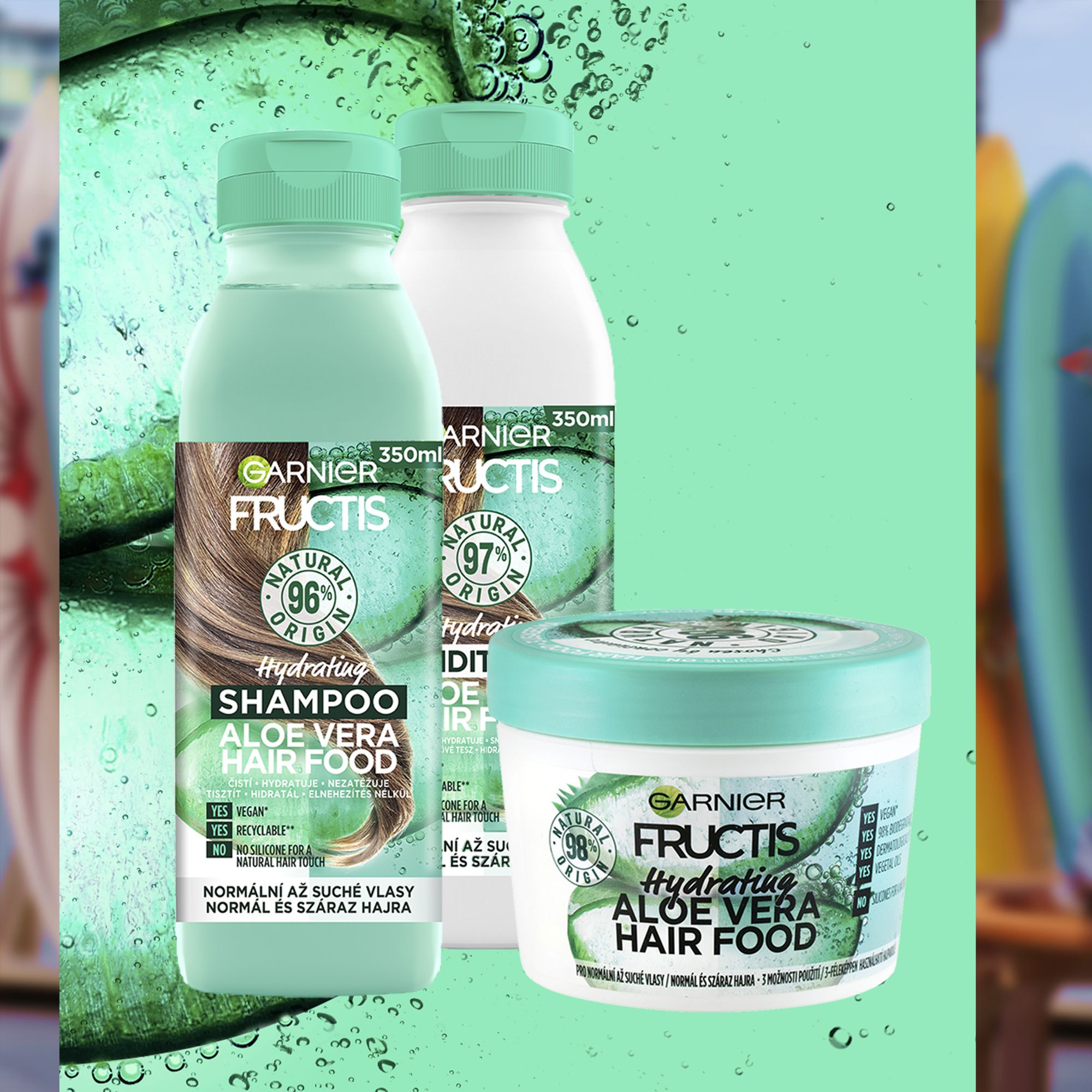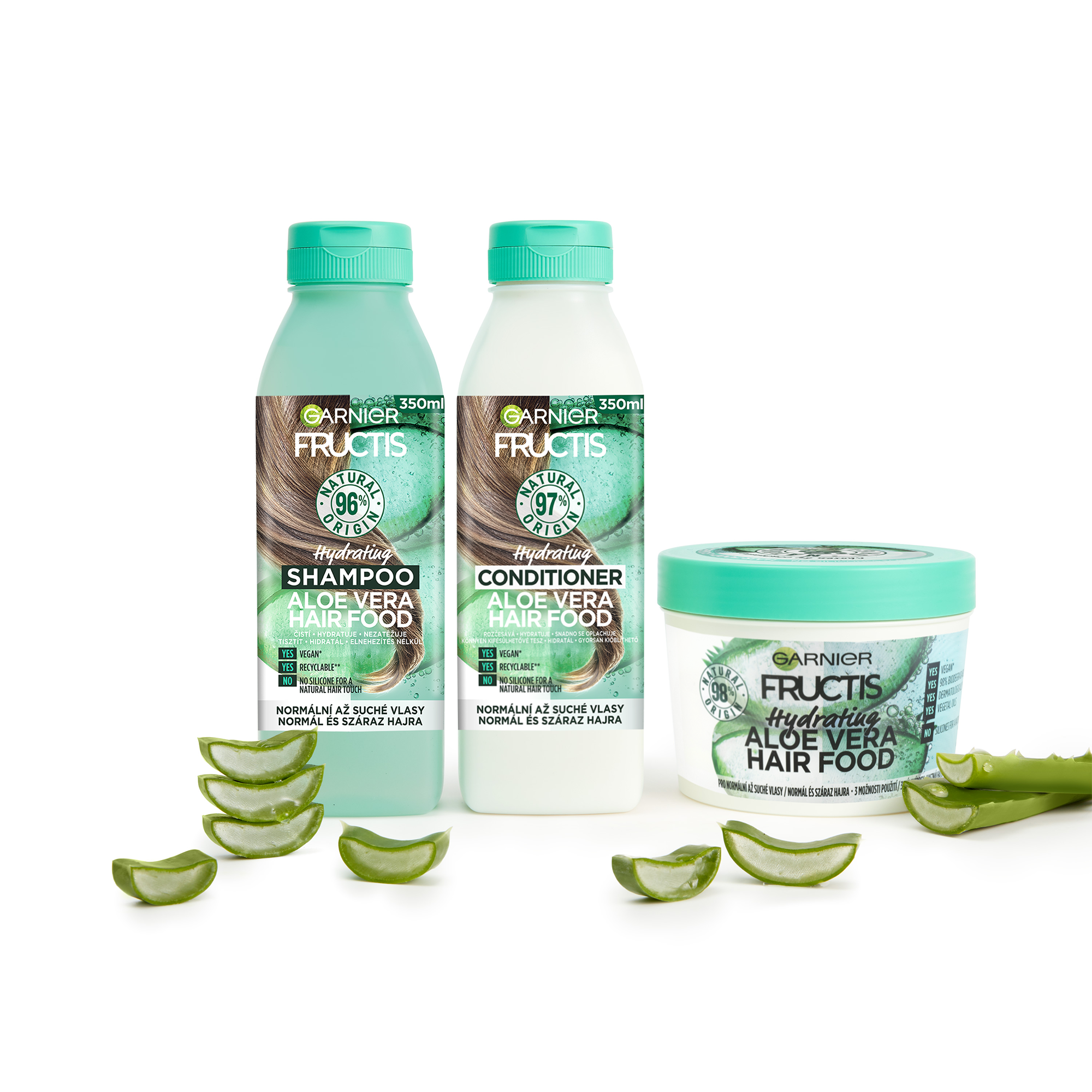 Kondicionér pro dehydratované vlasy a suchou pokožku hlavy, až 100h hydratace (1).hydratační kondicionér Hair Food Aloe vera rozčesává vlasy bez zatížení. Složení je z 97% přírodního původu. Zbývající 3% zaručují senzorické vlastnosti a stabilitu produktu. (1) Instrumentální test po použití šamponu a kondicionéru.