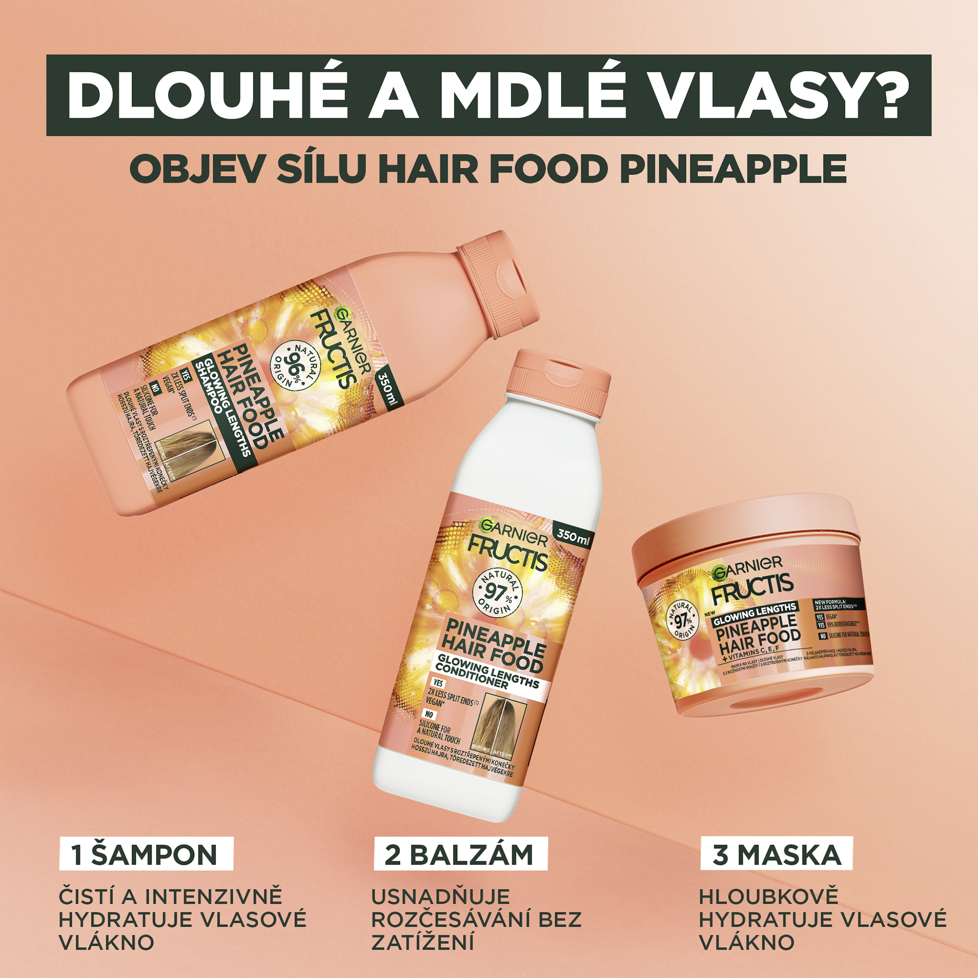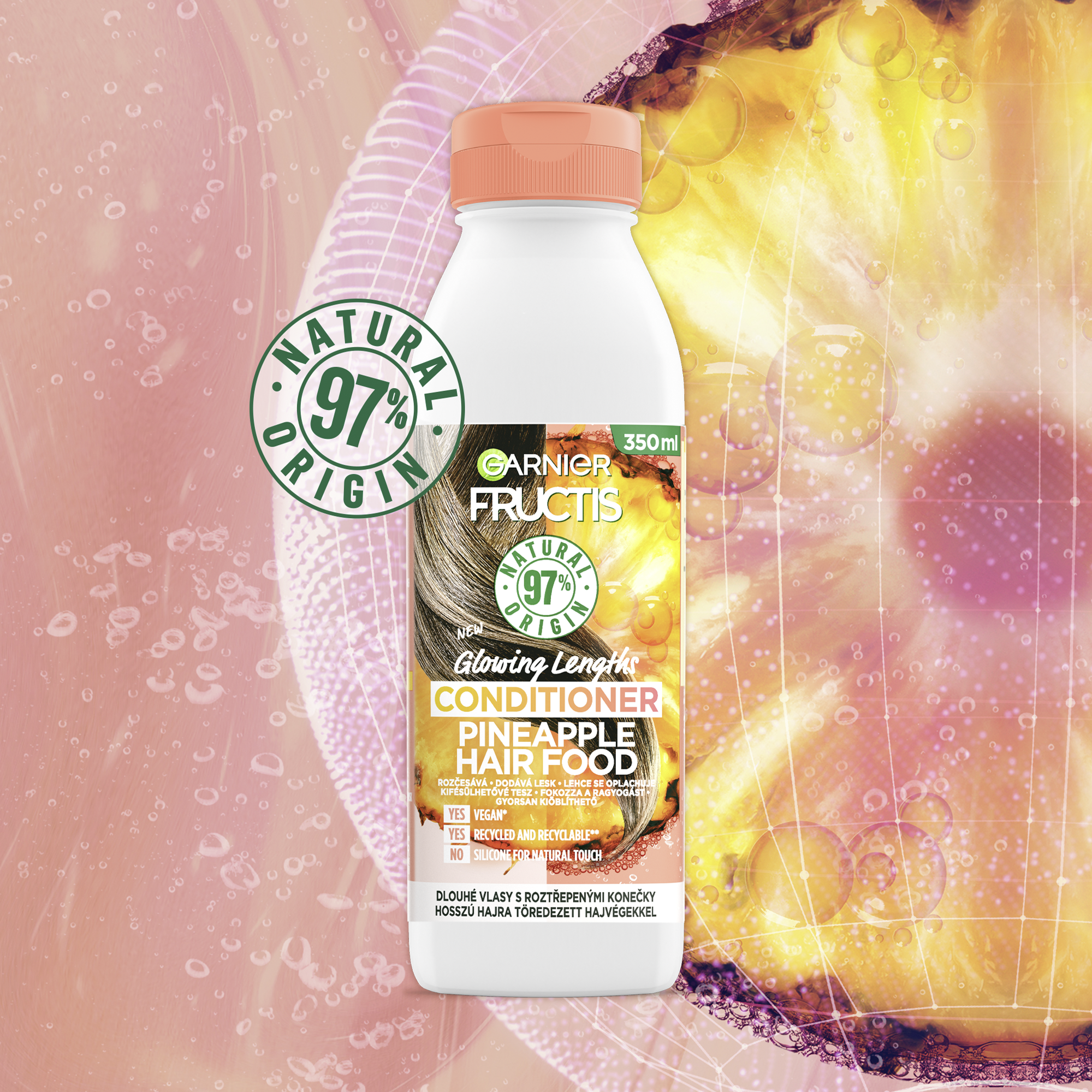 Rozjasnění a posilnění vlasů: Fructis přináší veganský Hair Food kondicionér z 97% přírodního původu. Jeho lehká pěna a vyživující lipidy tvoje vlasy jemně umyjí a vyživí konečky vlasů bez zatížení.