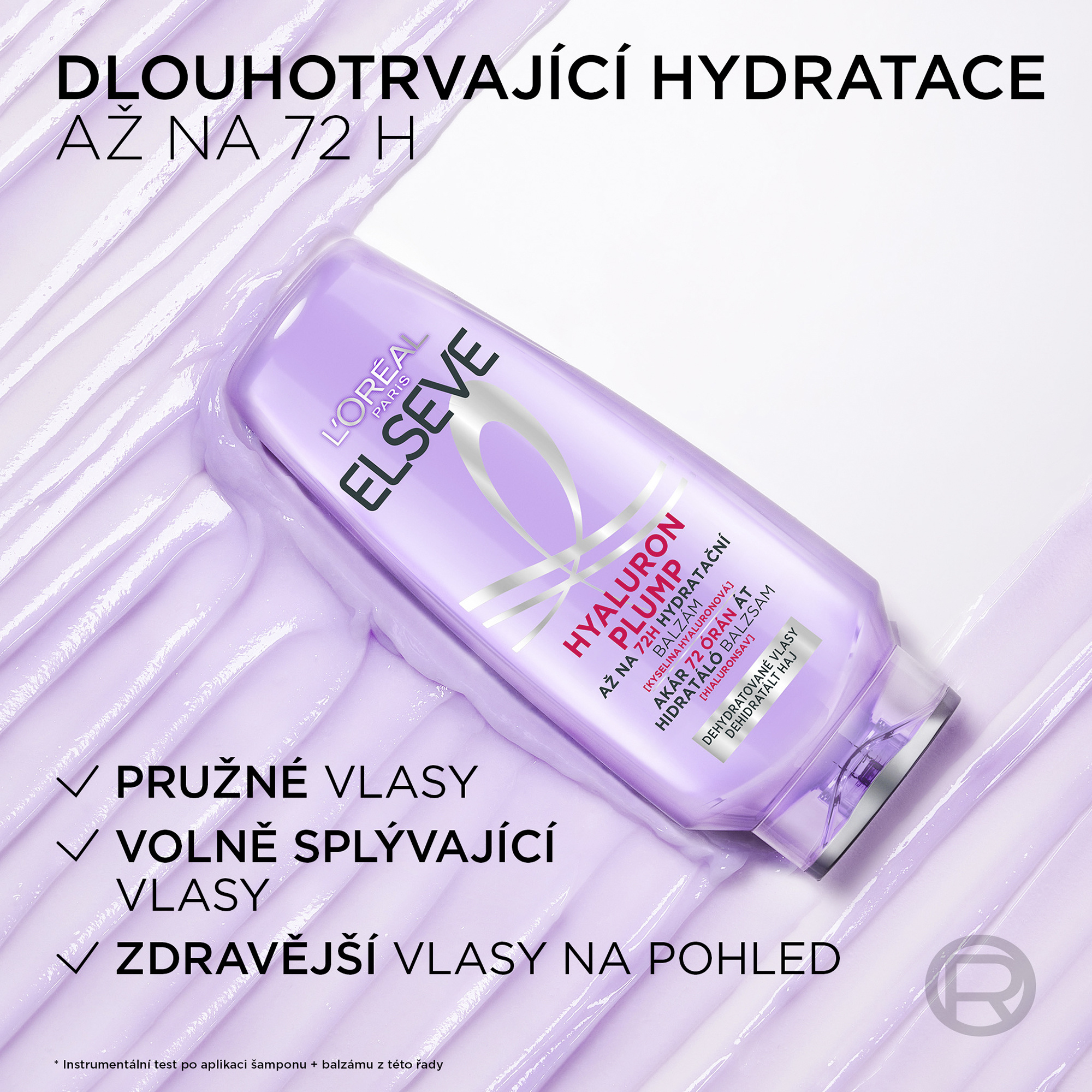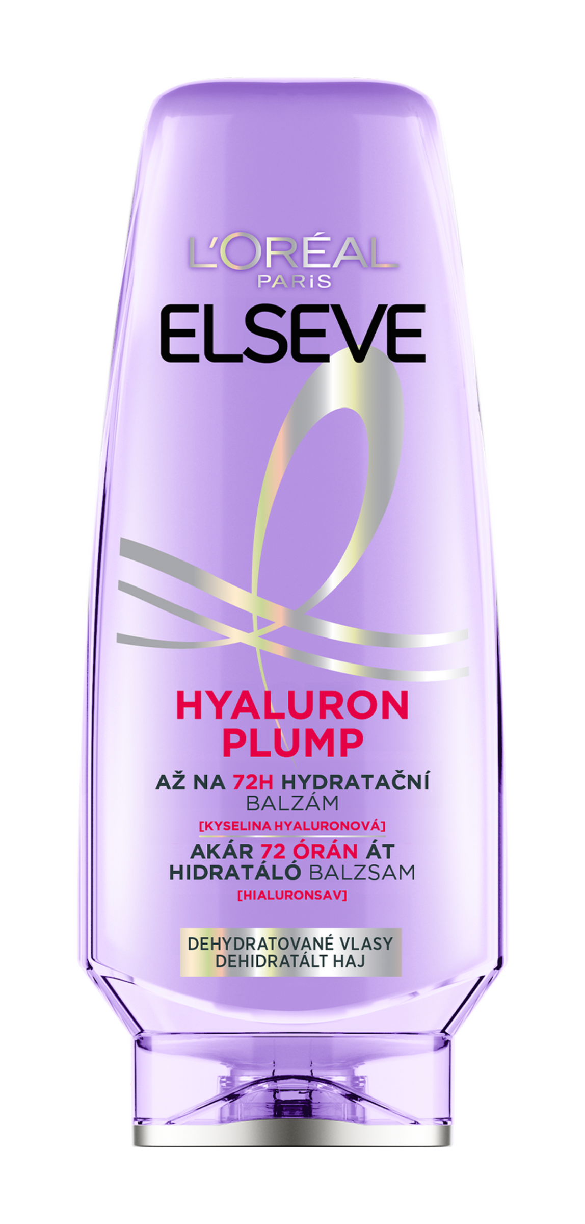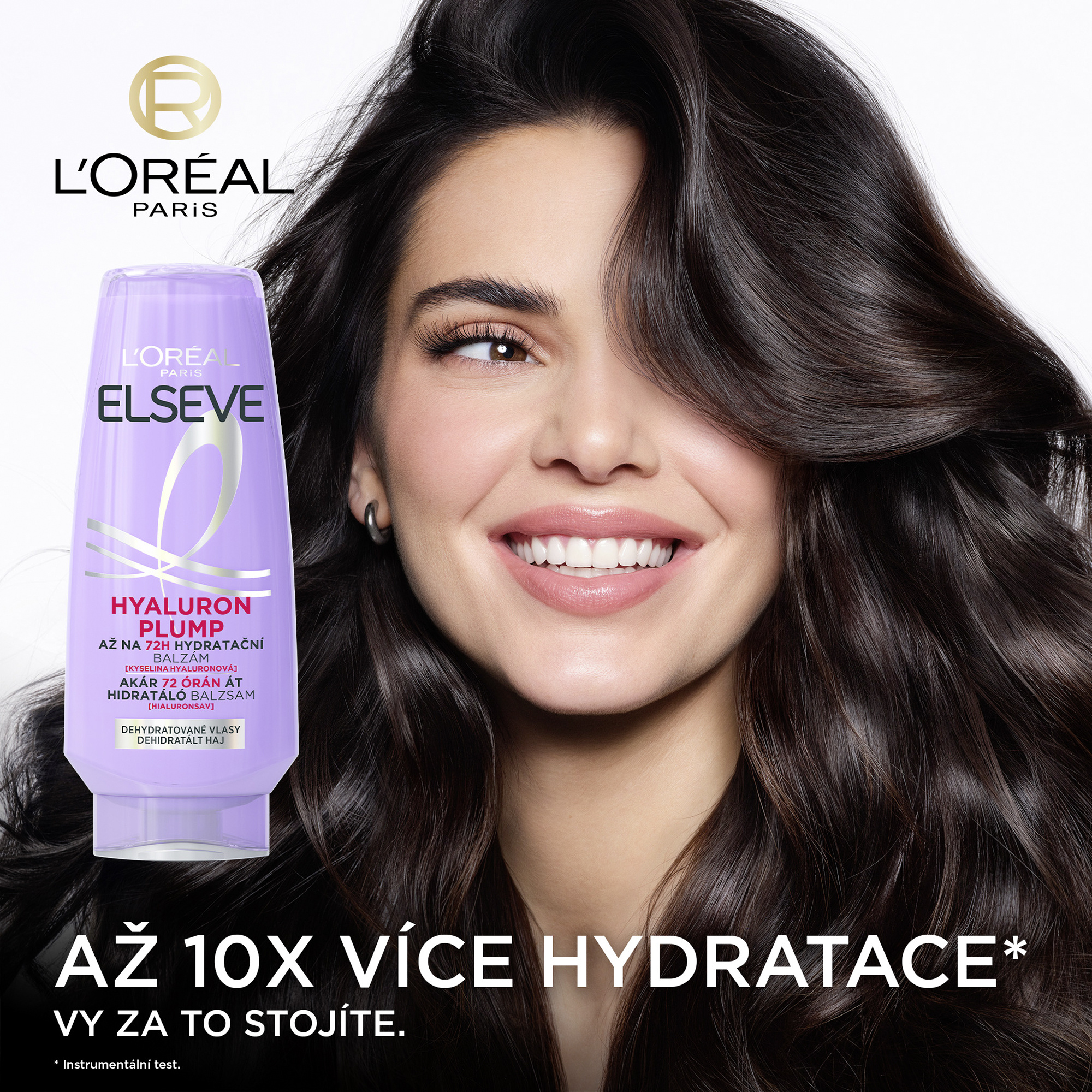 Vlasy jako bez života? To je známka dehydratovaných vlasů. Hydratační balzám Elseve Hyaluron Plump okamžitě rozčesává vlasy a hydratuje je až po dobu 72 hodin**, pro lesklejší, 10x více hydratované** vlasy plné života bez zatížení. Kyselina hyaluronová se nachází přirozeně v těle, je schopná vázat až 1000x více vody, než sama váží a pomáhá vlasům znovu dodat hydrataci. **Instrumentální test na šamponu + balzámu.