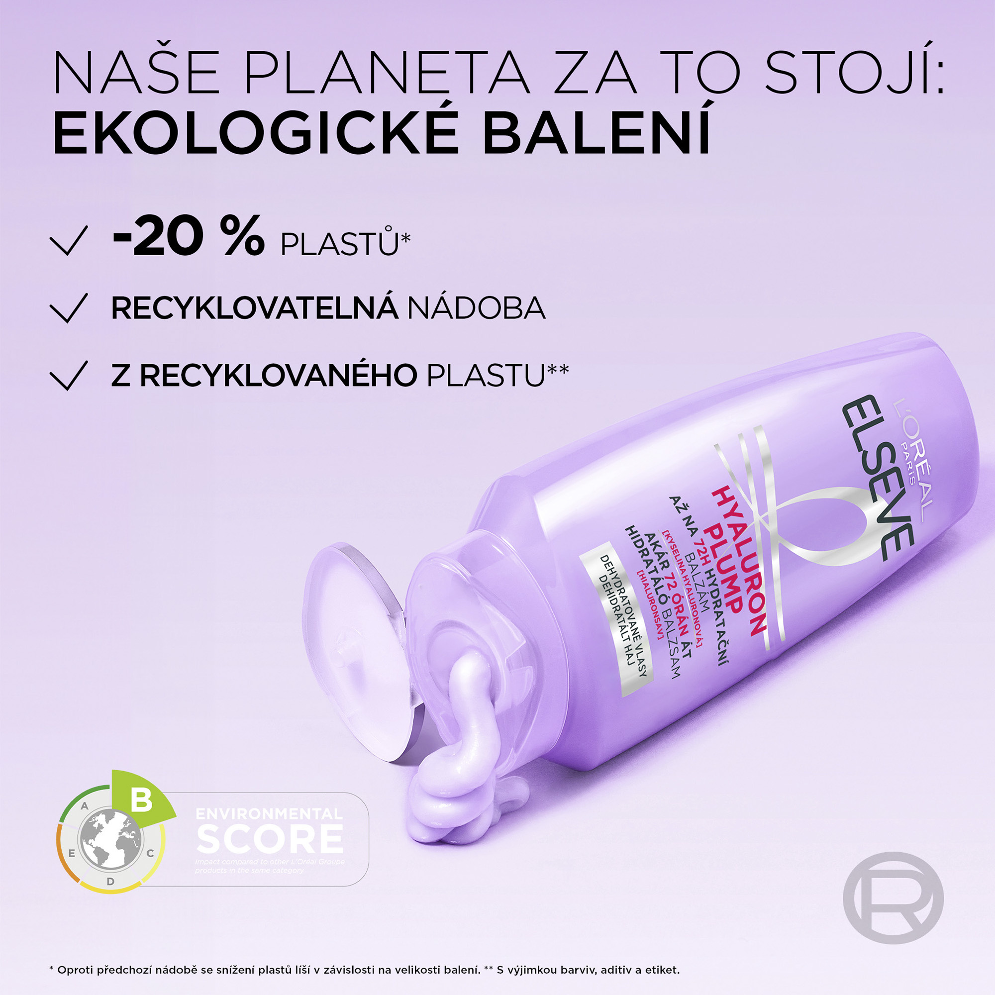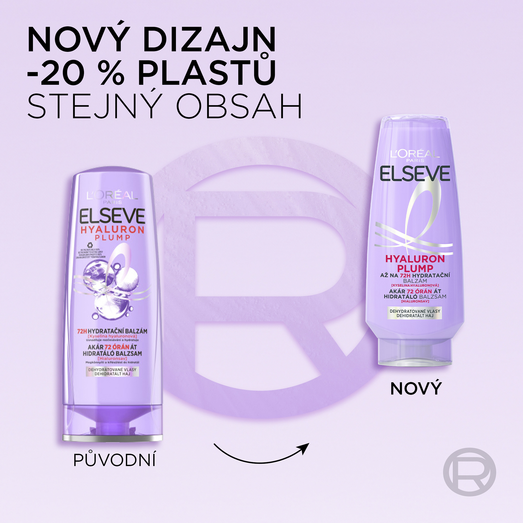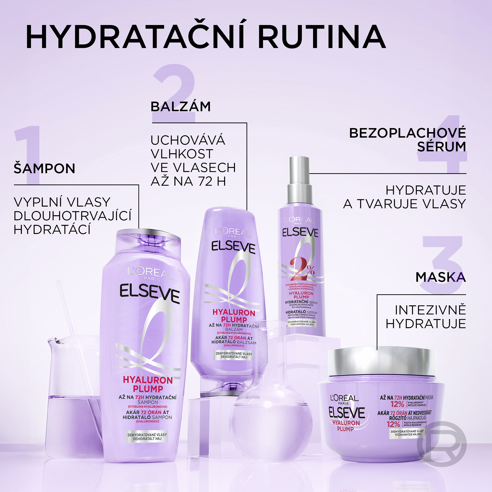 Vlasy jako bez života? To je známka dehydratovaných vlasů. Hydratační balzám Elseve Hyaluron Plump okamžitě rozčesává vlasy a hydratuje je až po dobu 72 hodin**, pro lesklejší, 10x více hydratované** vlasy plné života bez zatížení. Kyselina hyaluronová se nachází přirozeně v těle, je schopná vázat až 1000x více vody, než sama váží a pomáhá vlasům znovu dodat hydrataci. **Instrumentální test na šamponu + balzámu.