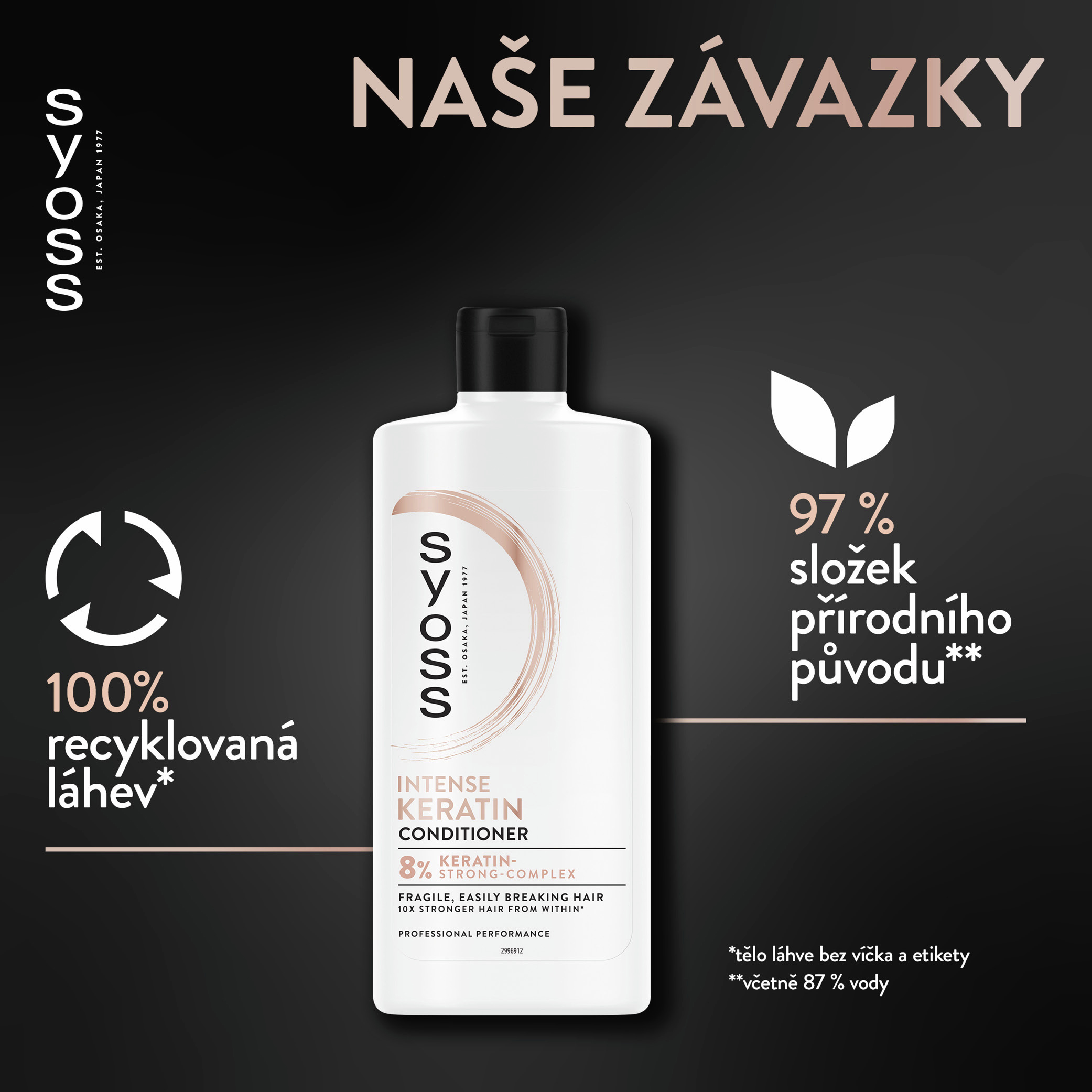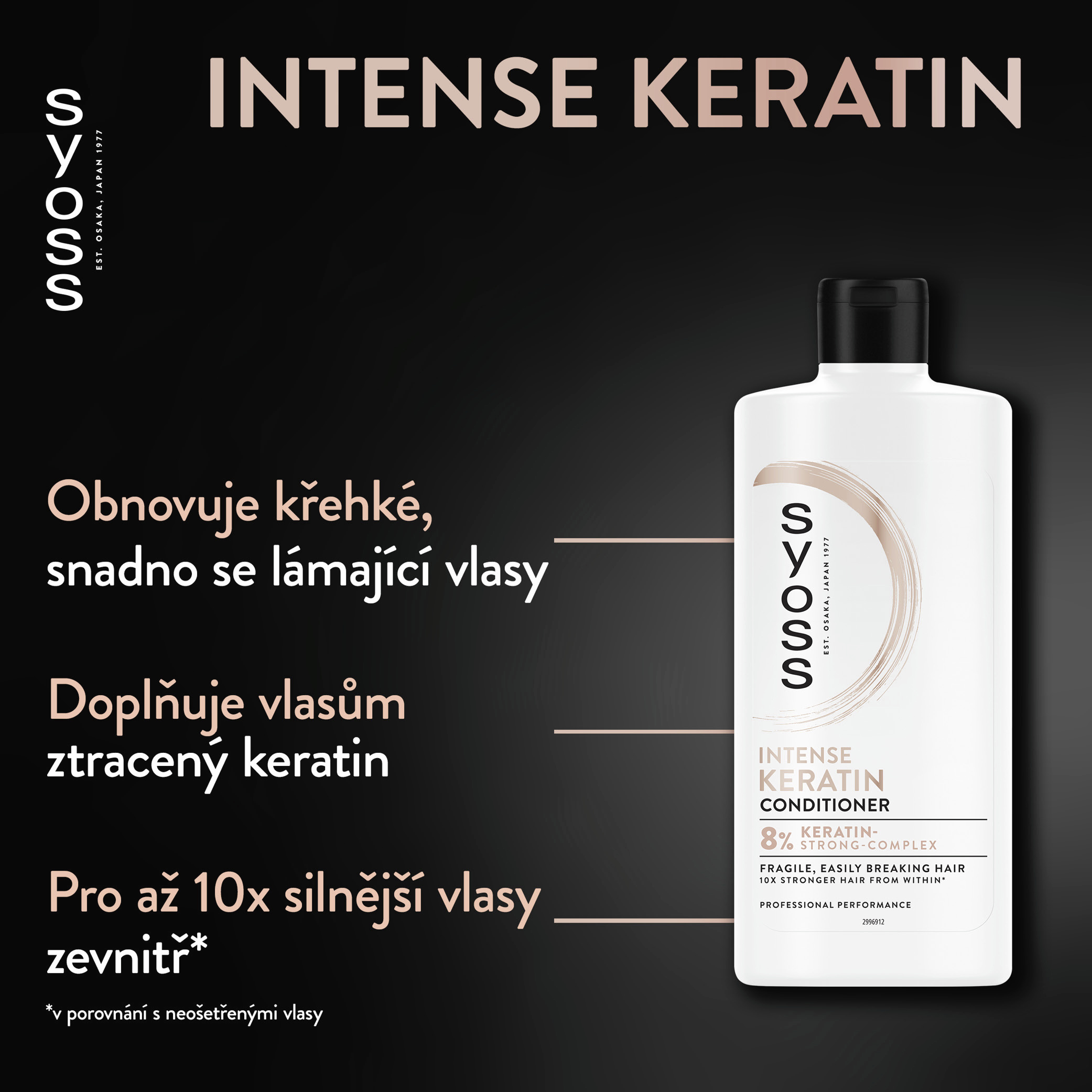 Kondicionér pro křehké, snadno se lámající vlasy s 8% keratinovým posilujícím komplexem. Vlasové produkty Syoss, s více než 45letou kadeřnickou historií, jsou navrženy pro profesionální výkon. Tento kondicionér Syoss s hloubkově pečujícím složením obsahujícím posilující 8% keratinový komplex posiluje vlasy zevnitř a zanechává je krásné a zdravě vypadající. Tento kondicionér obnovuje křehké, snadno se lámající vlasy, uhlazuje je, usnadňuje jejich rozčesávání a zároveň doplňuje vlasům ztracený keratin pro až 10× silnější vlasy*. Složky tohoto kondicionéru jsou z 97 % přírodního původu**. Lahev kondicionéru je vyrobena ze 100 % z recyklovaných materiálů***.