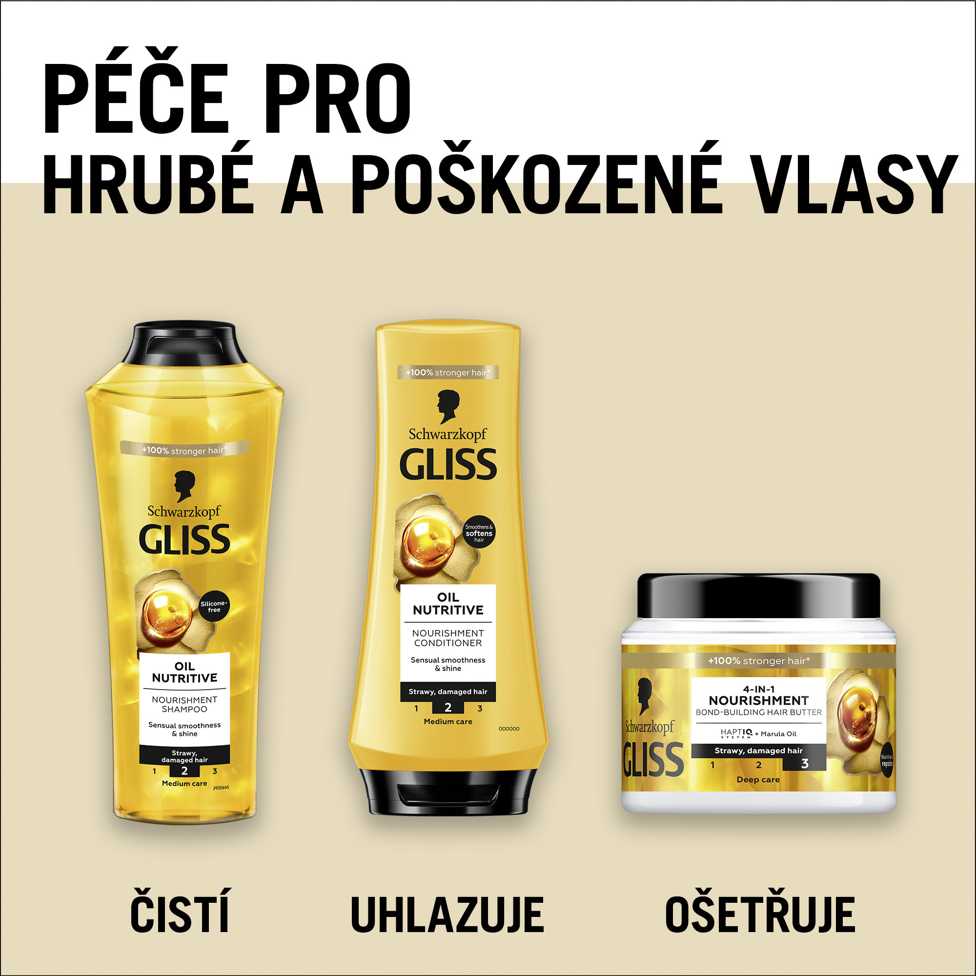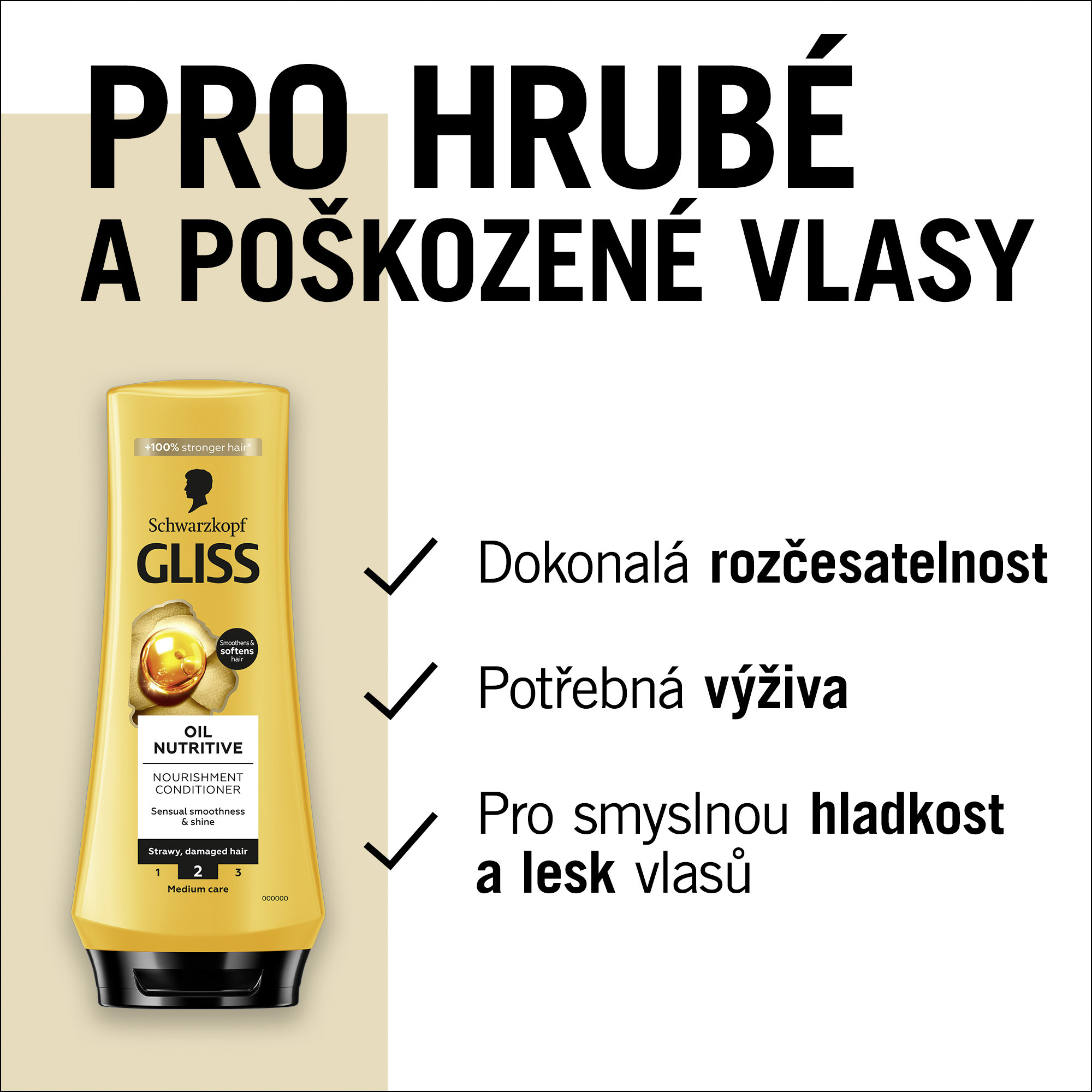- Kondicionér Gliss Oil Nutritive s omega 9 + marulovým olejem pro lámavé, poškozené vlasy. Smývatelný. Smyslná hladkost a lesk. Dokonalá rozčesatelnost a výživa