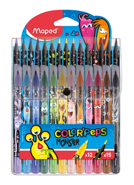 Souprava 27 kusů výtvarných potřeb. Sada obsahuje 12 barevných fixů a 15 barevných bezdřevých pastelek v černém provedení s motivy příšerek v praktickém, opakovaně použitelném pouzdře.