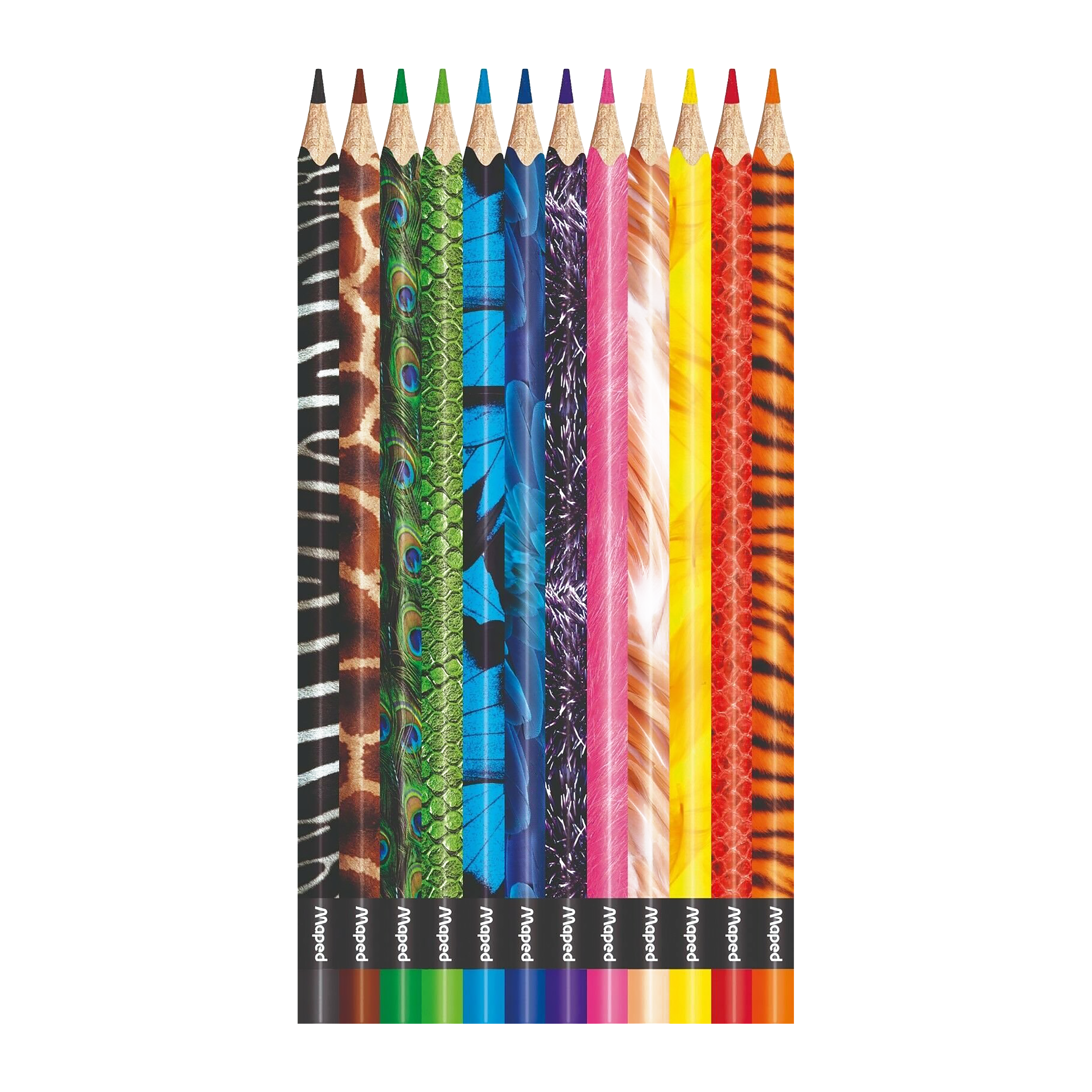 Souprava 12 kusů pastelek v atraktivních zvířecích motivech. Pastelky mají ergonomické trojhranné tělo, měkkou odolnou tuhu o tloušťce 2,9 mm, jasné barvy.