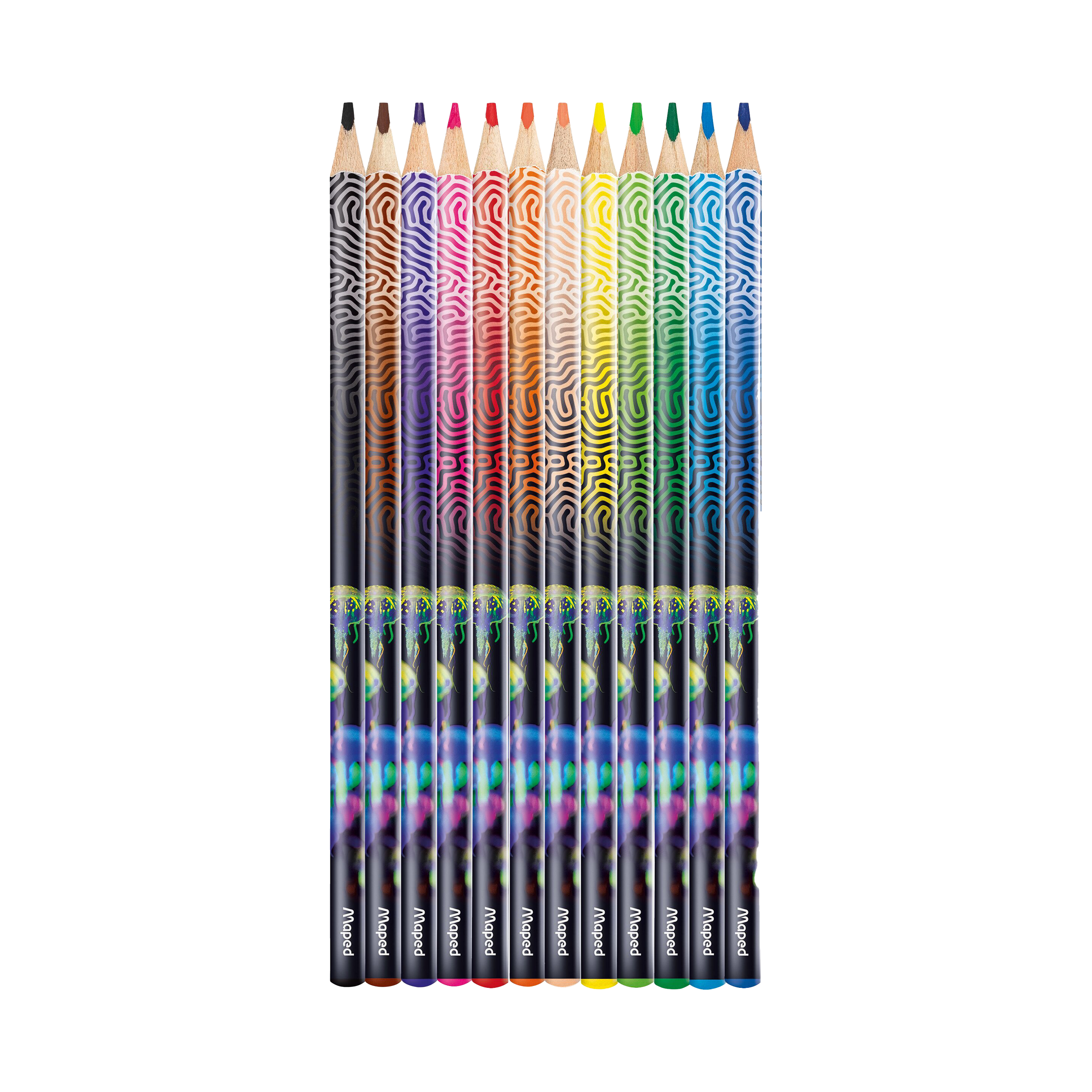 Sada 12 kusů bezdřevých pastelek pro praváky i leváky v atraktivním motivu Deepsea. Pastelky mají ergonomické trojhranné tělo pro snadný úchop, měkkou odolnou tuhu o tloušťce 2,9 mm, jasné barvy.