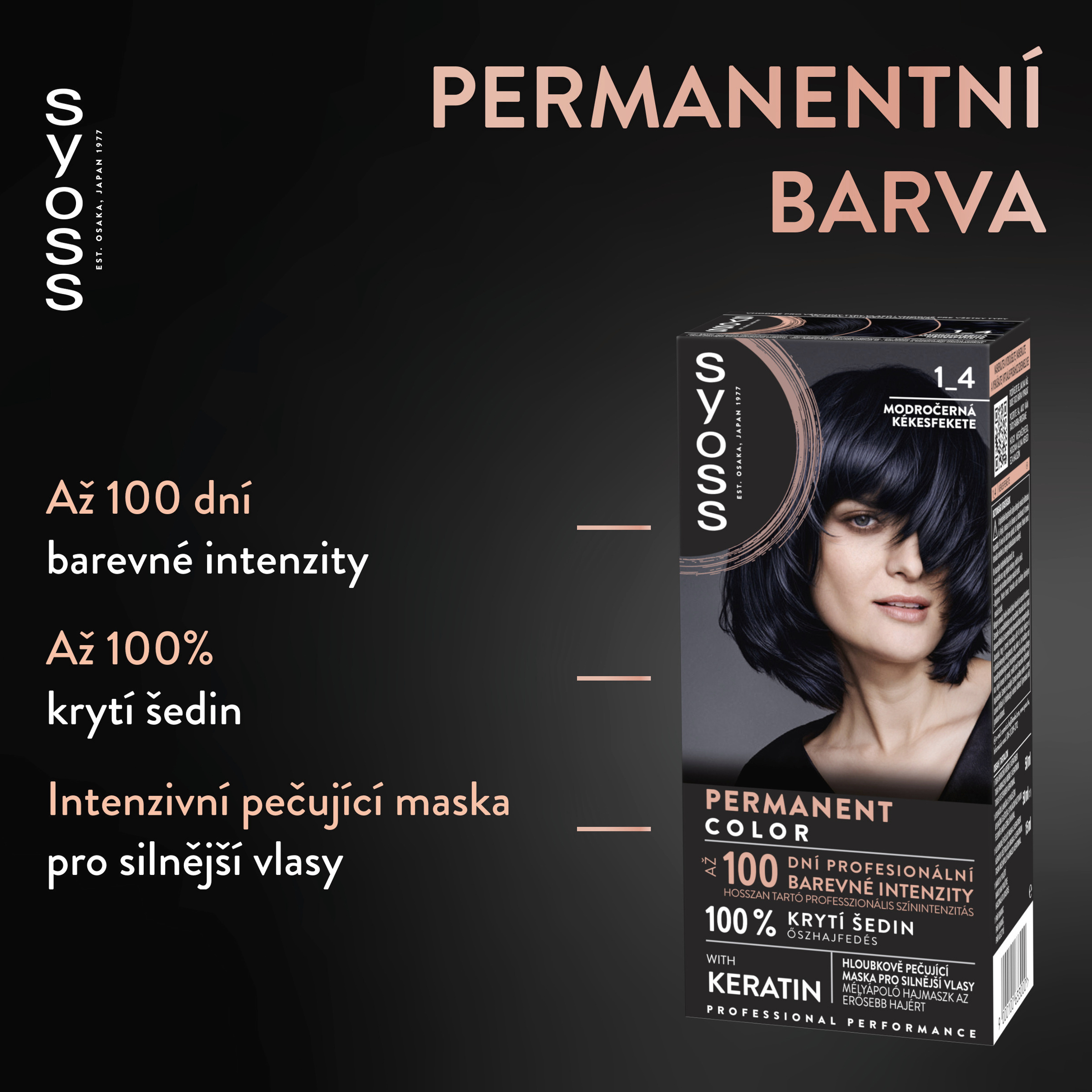 Permanentní barva na vlasy se 100% krytím šedin. Permanentní barvy na vlasy Syoss, s více než 45letou historií, jsou navrženy pro profesionální výkon. Vaše vlasy budou díky Syoss vypadat a působit plné života. Barvicí krém s bohatými barevnými pigmenty a keratinem proniká hluboko do vlasového vlákna a dodává vlasům profesionální barevnou intenzitu až na 100 dní a 100% krytí šedin. Součástí balení je také hloubkově pečující maska obohacená o keratin, která hloubkově posiluje vlasy zevnitř a vyhlazuje jejich povrch. Díky této masce jsou pigmenty uzamčeny ve vlasovém vlákně, a tím přináší ty nejjasnější a nejsytější Syoss barvy. Tato modročerná barva na vlasy se doporučuje pro středně hnědé až černé vlasy.