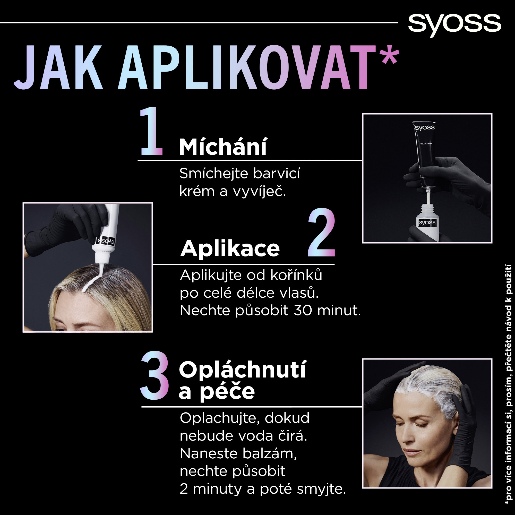 Aplikace: Přesná aplikace bez stékání pro profesionální barevné výsledky. Před barvením vždy proveďte test citlivosti na alergie a pečlivě dodržujte pokyny. 1. Příprava 2. Míchání 3. Aplikace 4. Oplachování a následná péče