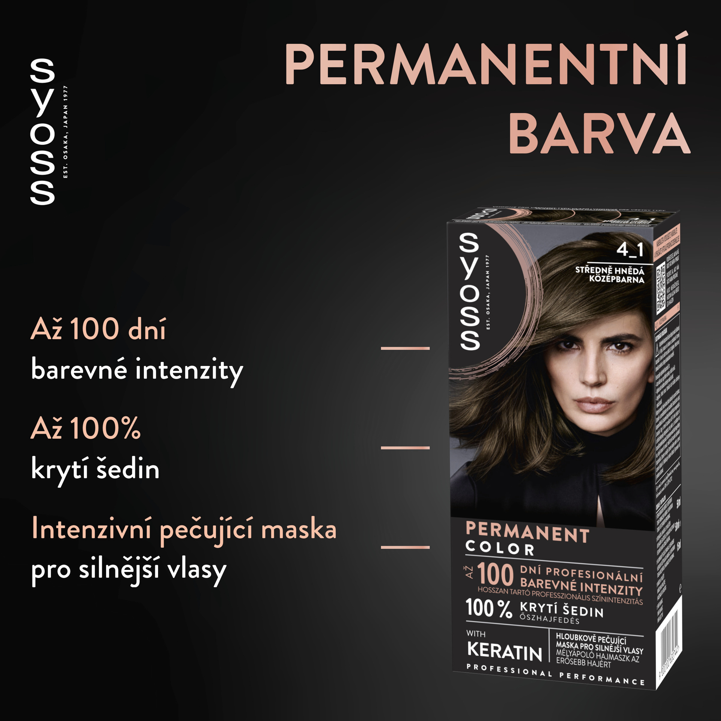 Permanentní barva na vlasy se 100% krytím šedin. Permanentní barvy na vlasy Syoss, s více než 45letou historií, jsou navrženy pro profesionální výkon. Vaše vlasy budou díky Syoss vypadat a působit plné života. Barvicí krém s bohatými barevnými pigmenty a keratinem proniká hluboko do vlasového vlákna a dodává vlasům profesionální barevnou intenzitu až na 100 dní a 100% krytí šedin. Součástí balení je také hloubkově pečující maska obohacená o keratin, která hloubkově posiluje vlasy zevnitř a vyhlazuje jejich povrch. Díky této masce jsou pigmenty uzamčeny ve vlasovém vlákně, a tím přináší ty nejjasnější a nejsytější Syoss barvy. Tato středně hnědá barva na vlasy se doporučuje pro světle hnědé až tmavě hnědé vlasy.