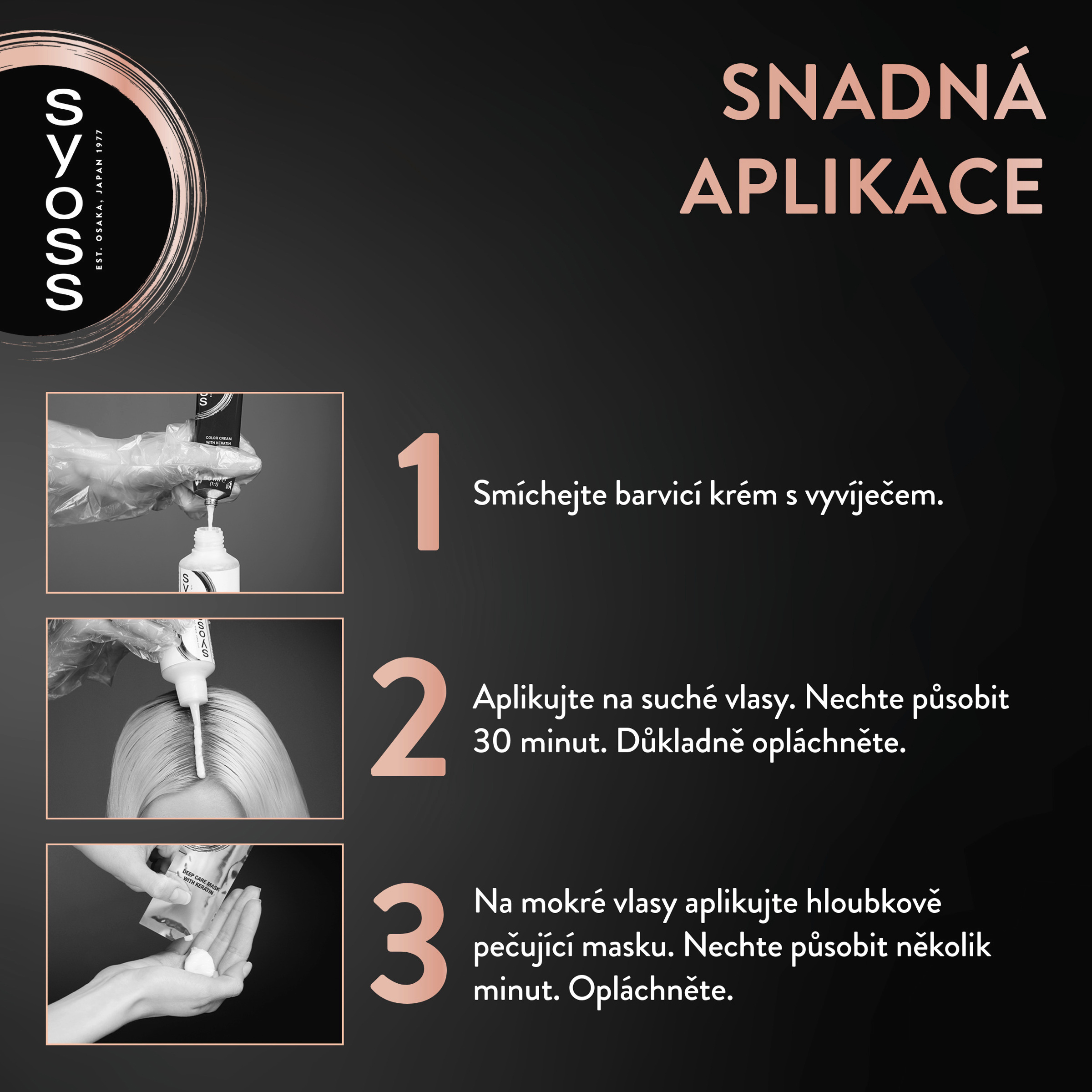 Aplikace: Přesná aplikace pro profesionální barevné výsledky. 1. Příprava 2. Míchání 3. Aplikace 4. Oplachování a následná péče