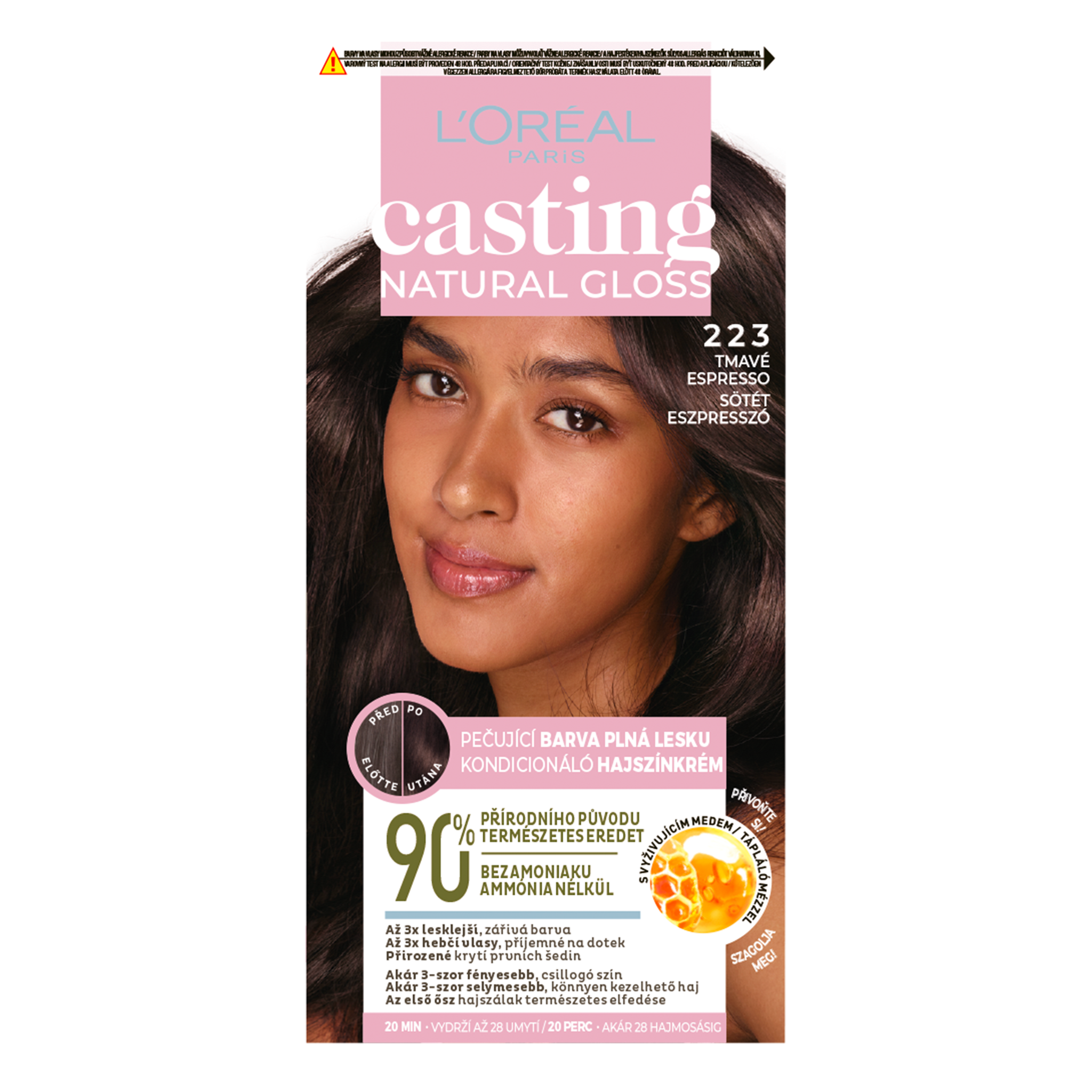 Casting Natural Gloss od L'oreal Paris má z 90 % přírodní složení, které přirozeně kryje první šediny. Pečuje o každý pramen a vyhlazuje ho, navíc zanechává vlasy až 3x lesklejší a hebčí. Barvy jsou vyvinuty pro všechny typy vlasů. Barva se postupně vymývá až k vašemu přirozenému odstínu po dobu 28 umytí.