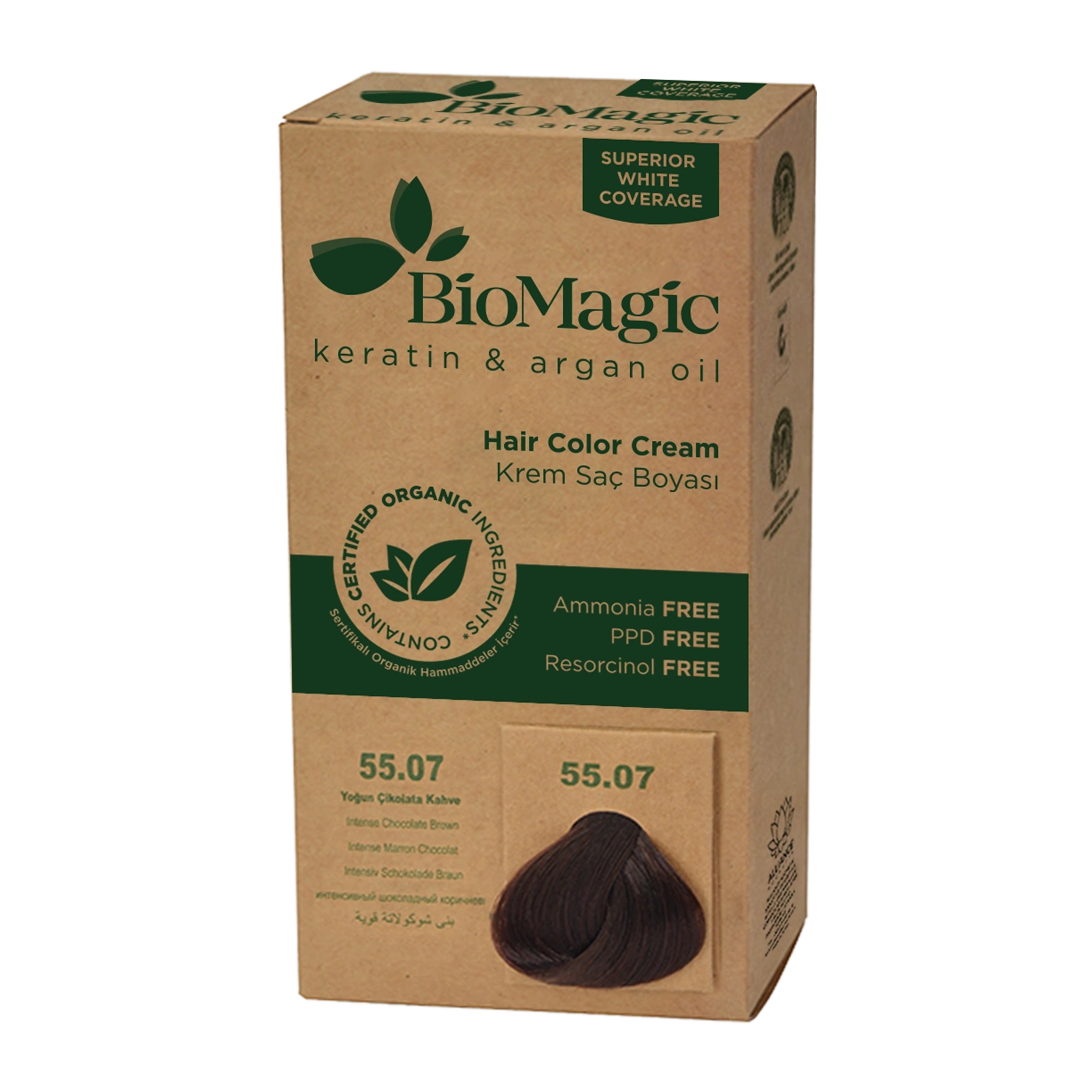 Objevte sílu přírody s BioMagic 55.07 Intense Chocolate Brown. Naše barva na vlasy, obohacená o keratin, arganový olej a heliogenolový extrakt, hýčká vaše vlasy a pokožku hlavy. Díky organickému složení dodá vašim vlasům přirozený odstín a zářivý lesk. Její jemná formule je ideální pro citlivou pokožku a zaručuje pohodlné barvení.
