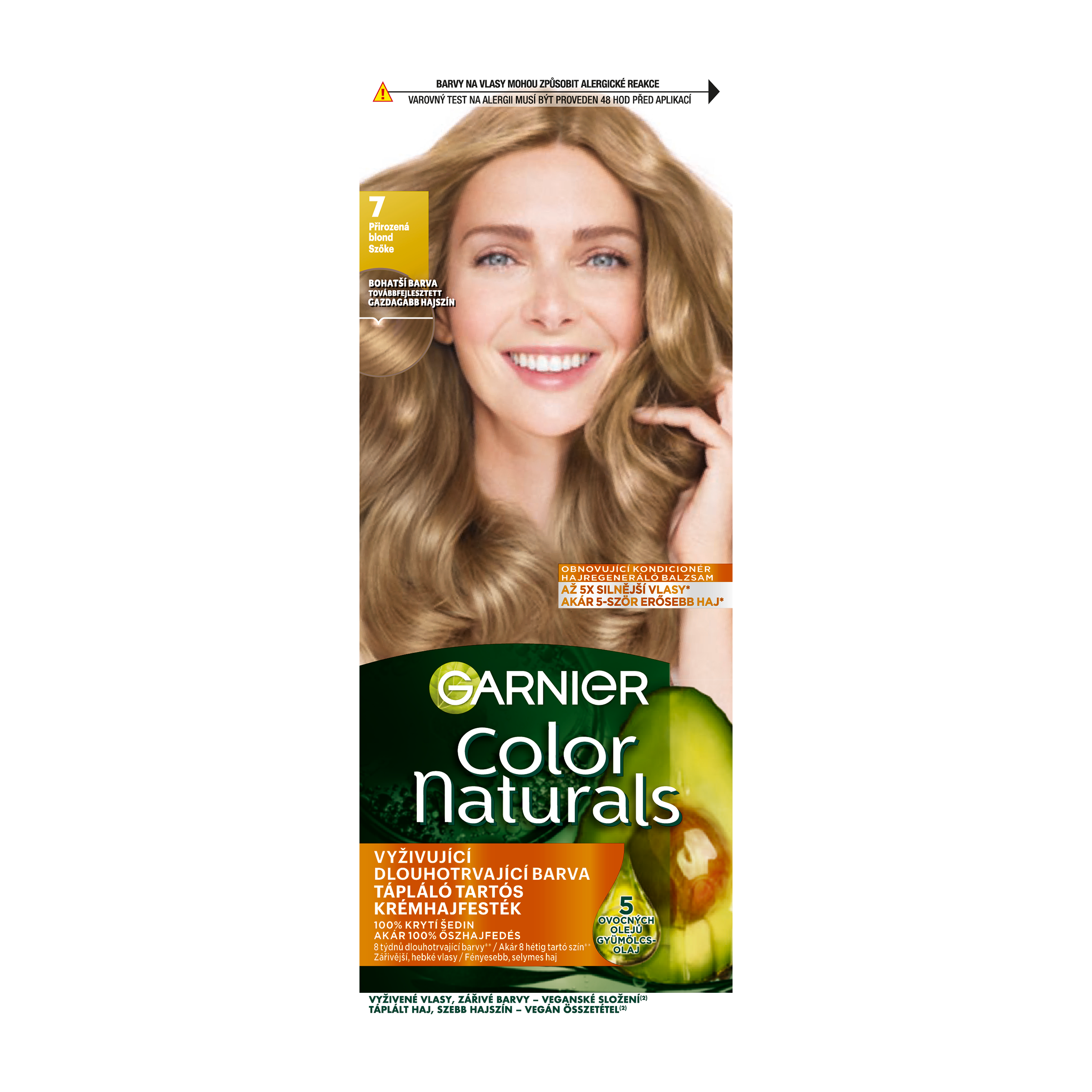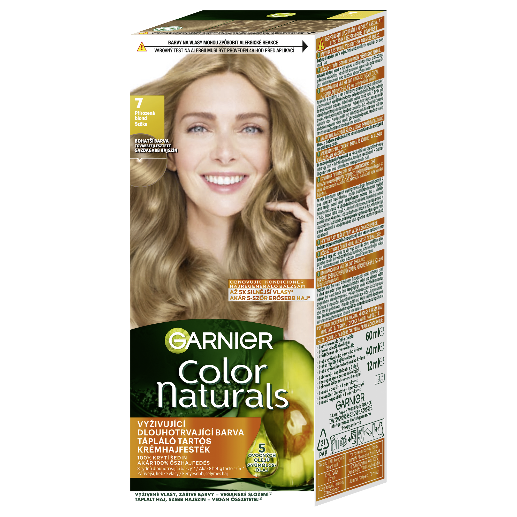 Barva na vlasy Garnier Color Naturals je vyživující permanentní barvou od Garnier. Díky složení vyživující péče obohacené o 5 olejů – olivy, avokádo, karité, kokos a argan budou vaše vlase lesklejší a hebčí. Péče intenzivně vyživuje vlasy, uhlazuje povrch vlasového vlákna a vytváří ochrannou vrstvu. Technologie „Color boost“ pro sytější a déle trvající barvu proniká do vlasových vláken a vyplňuje je sytou bohatou barvou. Díky závěrečné péči s 5 oleji je barva bohatá a dlouhotrvající. Výsledkem jsou 5x silnější vlasy, 100% krytí šedin a ochrana vlasů před vysušováním až na 8 týdnů, (*Instrumentální test). Zesvětlující barvy dokáží přirozeně odbarvit vlasy až o 4 odstíny. Studené pigmenty obsažené ve vybraných studených odstínech eliminují nežádoucí oranžové a žluté odlesky.