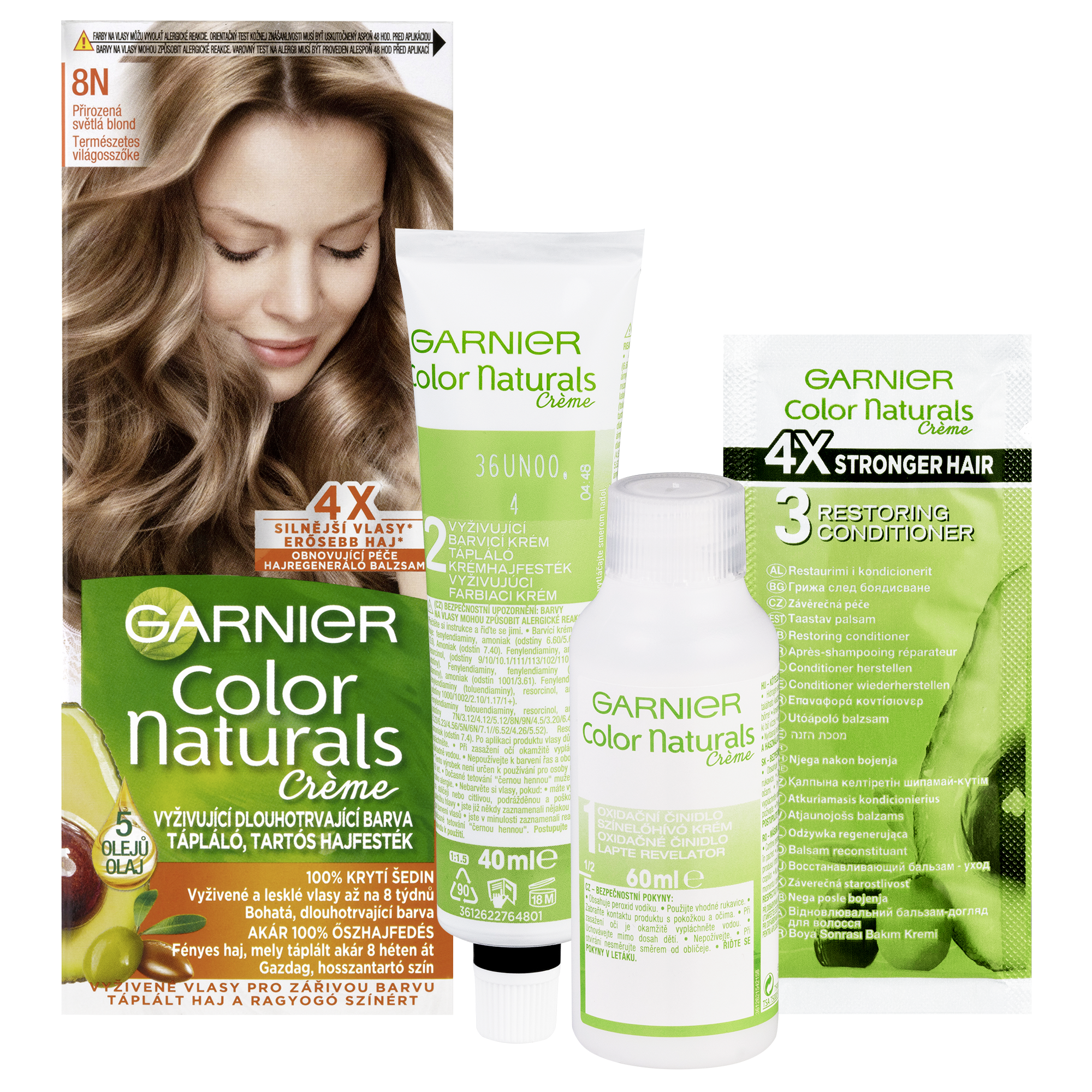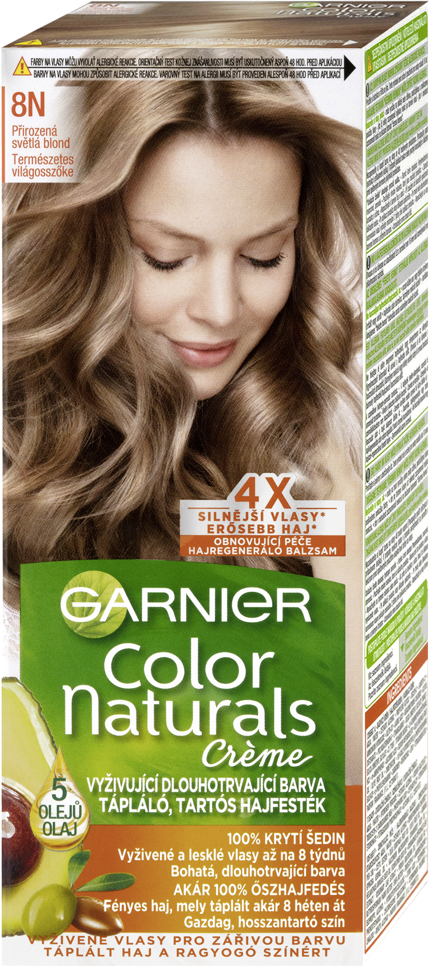 Barva na vlasy Garnier Color Naturals je vyživující permanentní barvou od Garnier. Díky složení vyživující péče obohacené o 5 olejů – olivy, avokádo, karité, kokos a argan budou vaše vlase lesklejší a hebčí. Péče intenzivně vyživuje vlasy, uhlazuje povrch vlasového vlákna a vytváří ochrannou vrstvu. Technologie „Color boost“ pro sytější a déle trvající barvu proniká do vlasových vláken a vyplňuje je sytou bohatou barvou. Díky závěrečné péči s 5 oleji je barva bohatá a dlouhotrvající. Výsledkem jsou 5x silnější vlasy, 100% krytí šedin a ochrana vlasů před vysušováním až na 8 týdnů, (*Instrumentální test). Zesvětlující barvy dokáží přirozeně odbarvit vlasy až o 4 odstíny. Studené pigmenty obsažené ve vybraných studených odstínech eliminují nežádoucí oranžové a žluté odlesky.