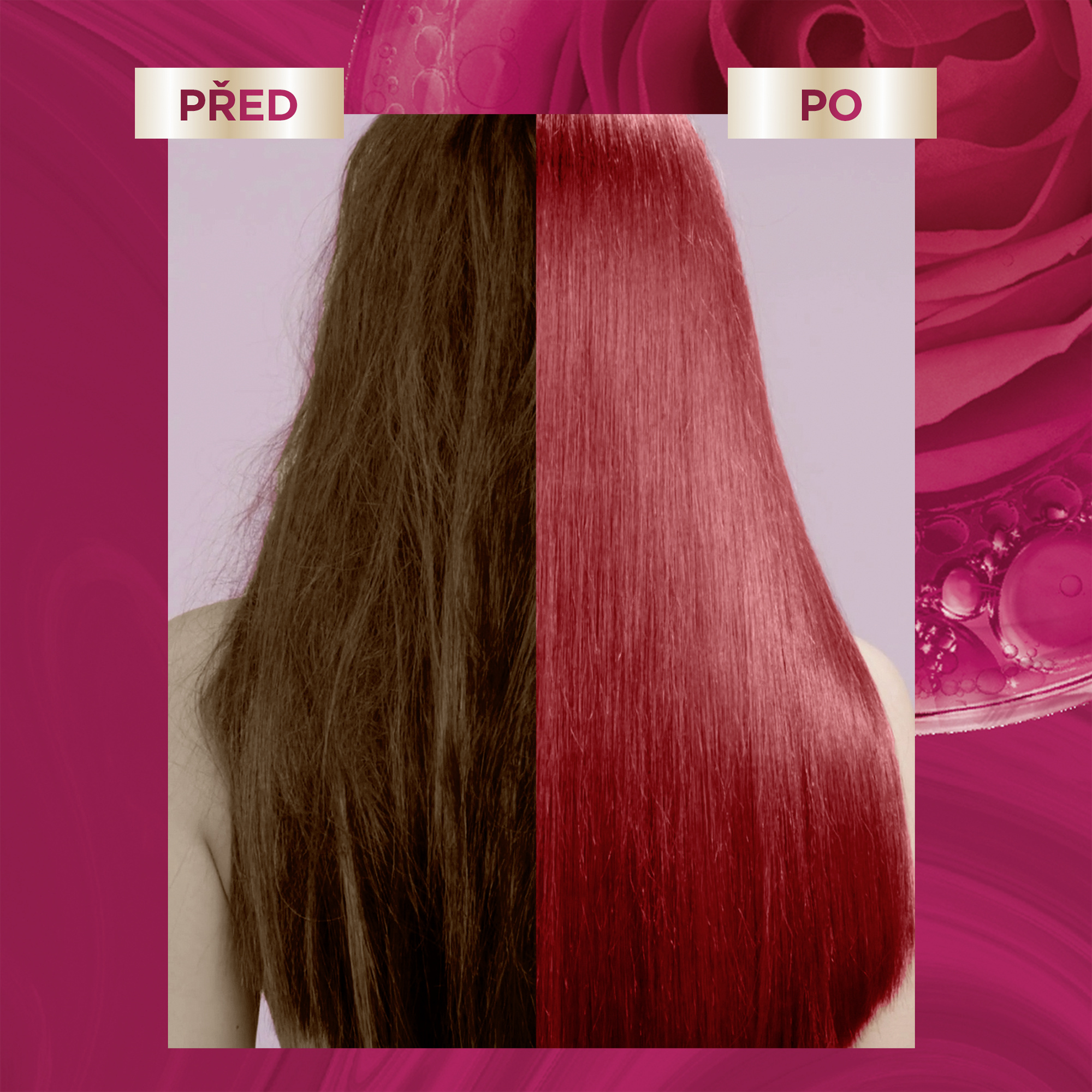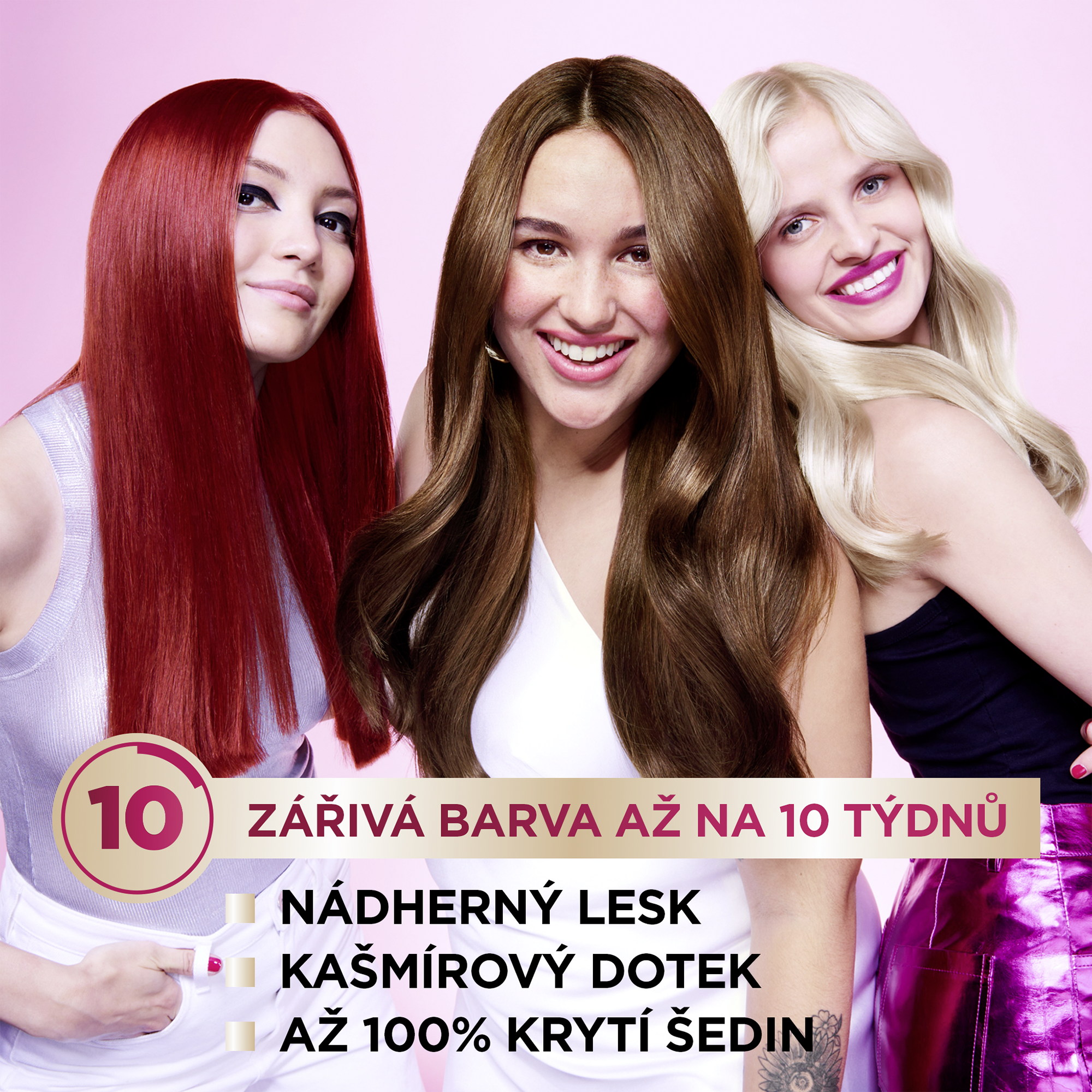 Barvicí krém: aqua/water, paraffinum liquidum/mineral oil, cetearyl alcohol, ethanolamine, steareth-20, ammonium hydroxide, steareth-2, 4-amino-2-hydroxytoluene, 2,4-diaminophenoxyethanol HCI, m-aminophenol, tocopherol, sodium metabisulfite, polyquaternium-6, camellia oleifera seed oil, p-phenylenediamine, EDTA, erythorbic acid, parfum/fragrance. Oxidační činidlo: aqua/water, hydrogen peroxide, cetearyl alcohol, sodium salicylate, trideceth-2 carboxamide MEA, phosphoric acid, ceteareth-25, tetrasodium etidronate, tetrasodium pyrophosphate, glycerin. Závěrečná péče: aqua/water, cetearyl alcohol, amodimethicone, behentrimonium chloride, rosa canina fruit oil, triedeceth-6, dodecene, poloxamer 407, isopropyl alcohol, propylene glycol, nacre powder, citric acid, lauryl PEG/PPG-18/18 methicone, isostearyl alcohol, cetyl esters, propyl gallate, chlorhexidine digluconate, cetrimonium chloride, CI 17200/red 33, CI 19140/yellow 5, parfum/fragrance.