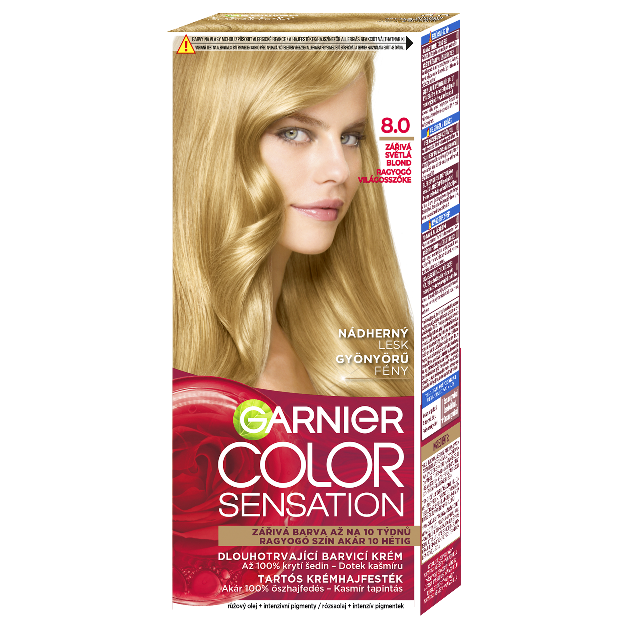 Intenzivní pečující barva na vlasy Garnier Color Sensation až 100% kryje šediny, díky obsažené perleti dodává vlasům lesk a má vysokou odolnost barvy po dobu 6 až 8 týdnů.