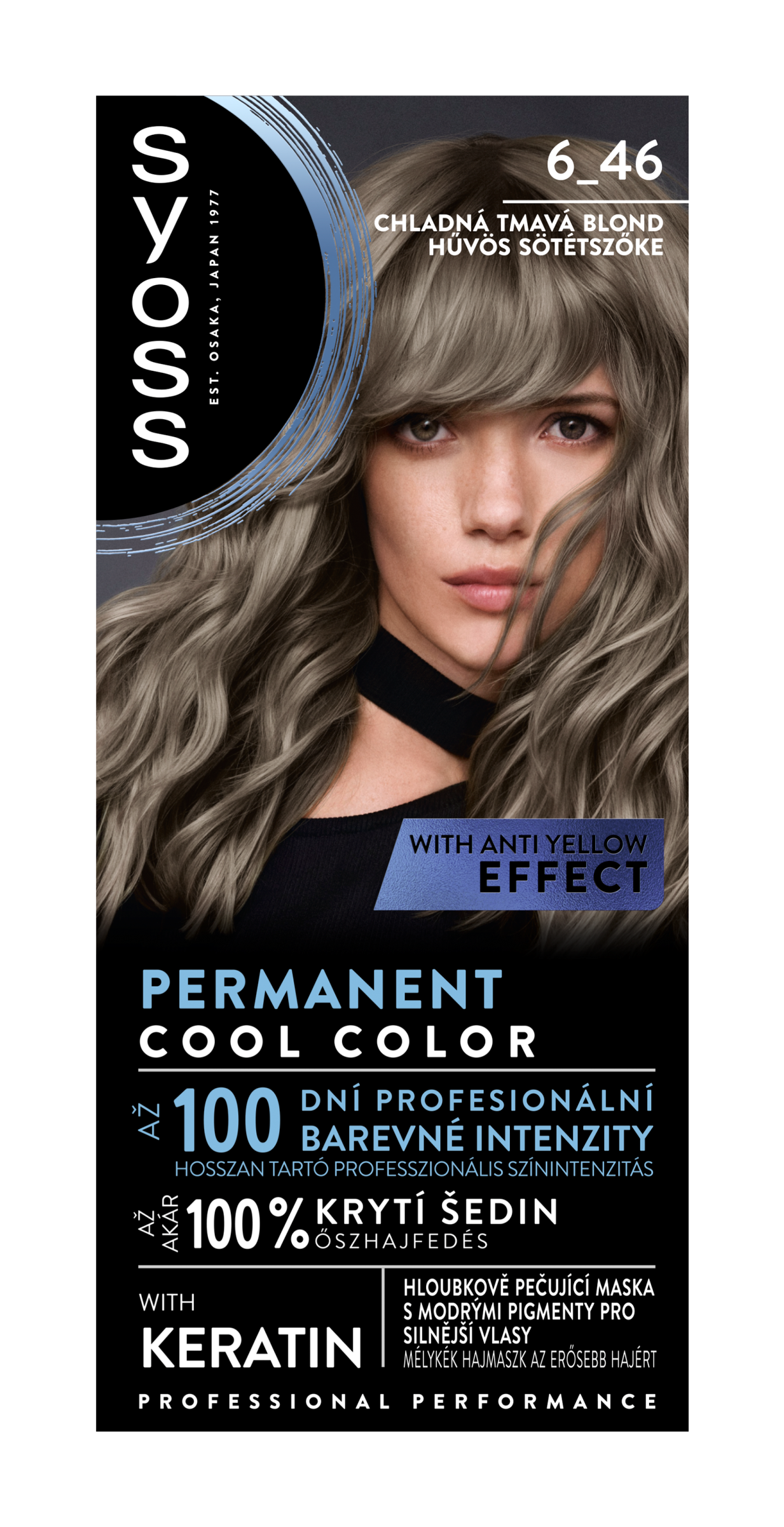 Permanentní barvy na vlasy Syoss, s více než 45letou historií jsou navrženy pro profesionální výkon. Díky této chladné barvě na vlasy budou vaše vlasy dlouhodobě působit plné života díky neutralizační síle barevných pigmentů. Barvicí krém s chladnými barevnými odlesky a keratinem proniká hluboko do vlasového vlákna, neutralizuje nežádoucí žluté tóny a odhaluje chladné odstíny s až 100 dny profesionální barevné intenzity a až 100% krytím šedin. Součástí balení je také hloubkově pečující modrá maska obohacená o keratin, která hloubkově posiluje vlasy zevnitř, zatímco její modré pigmenty odstraňují teplé tóny pro ledové odlesky. Tato chladná tmavá blond barva na vlasy se doporučuje pro středně blond až tmavě blond vlasy.
