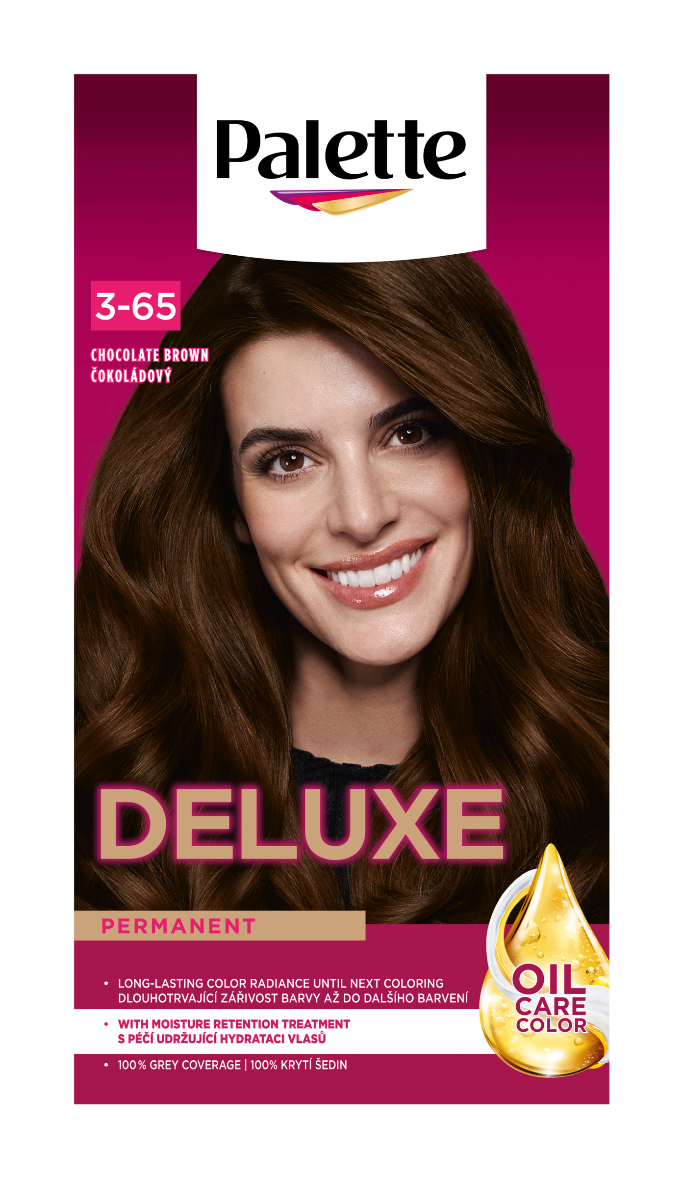 Palette Deluxe Oil Care barva na vlasy 3-65 Čokoládový - Radost z barev s Deluxe. Permanentní barva na vlasy se 100% krytím šedin Radujte se z barev s Palette Deluxe Oil Care: Bohaté složení Oil-in-creme s vysoce koncentrovanými pigmenty proniká do vlasů pro 100% krytí šedin a poskytuje dlouhotrvající zářivost barvy až do dalšího barvení. Speciálně vyvinutá péče, která udržuje hydrataci vlasů, přináší pocit hloubkové hydratace a hedvábně hladkých a zdravě vypadajících vlasů. Složení bez silikonů také zlepšuje hebkost vlasů, usnadňuje jejich rozčesávání a dodává jim neodolatelný lesk. Složení Palette Deluxe je až z 93 % přírodního původu*. Krabička má certifikaci FSC. Hliníková tuba a příbalový leták jsou recyklované. Společně vytváříme krásné okamžiky pro barevný a udržitelný svět.