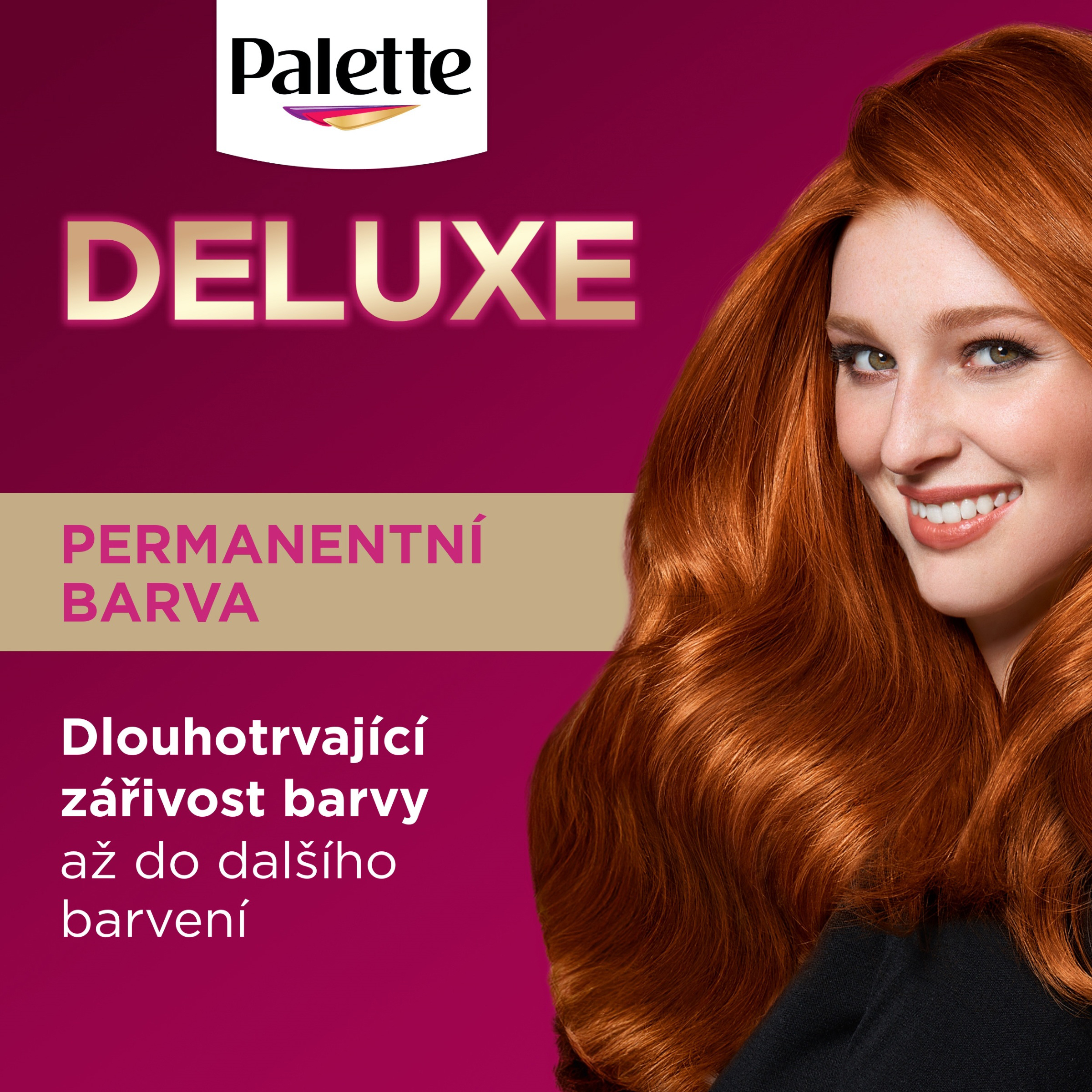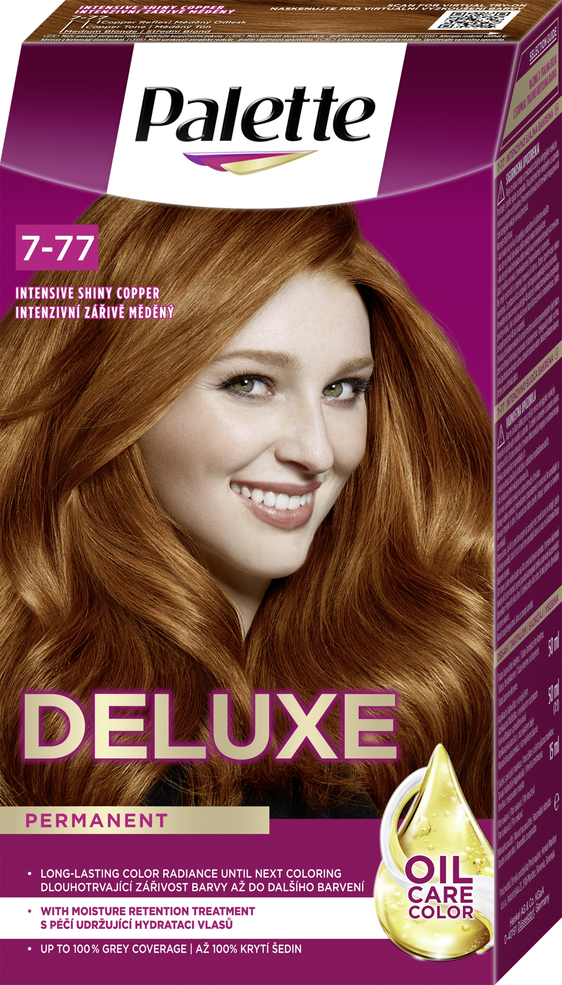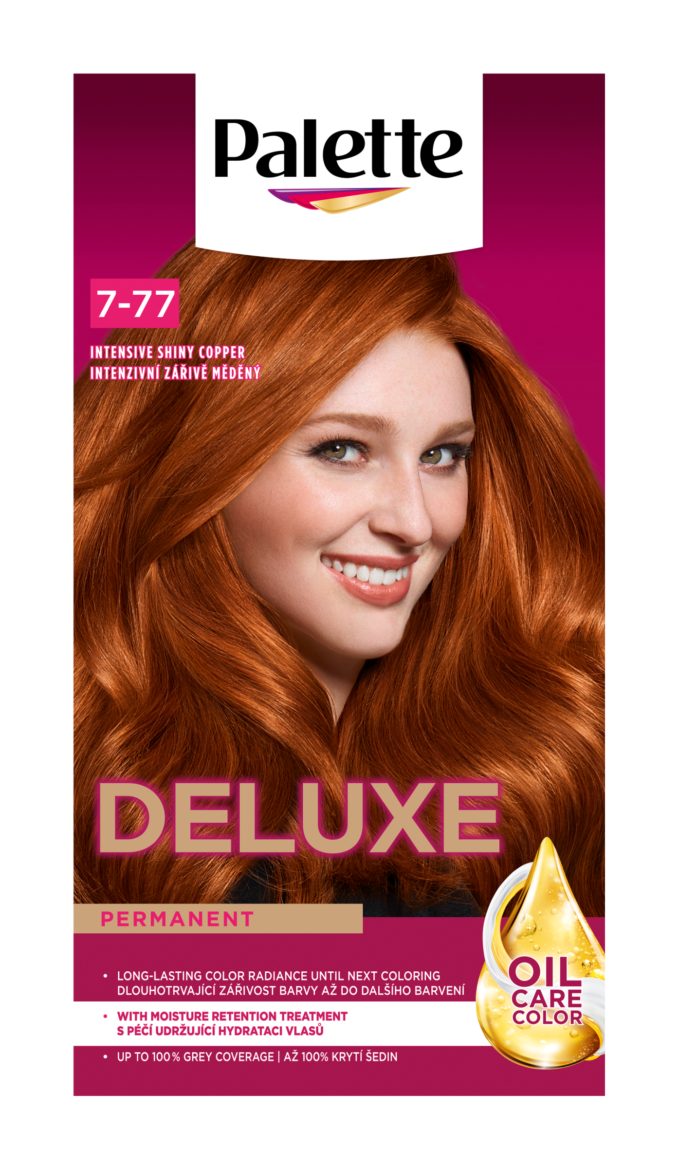 Palette Deluxe Oil Care barva na vlasy 7-77 Intenzivní zářivě měděný - Radost z barev s Deluxe. Permanentní barva na vlasy s až 100% krytím šedin Radujte se z barev s Palette Deluxe Oil Care: Bohaté složení Oil-in-creme s vysoce koncentrovanými pigmenty proniká do vlasů pro až 100% krytí šedin a poskytuje dlouhotrvající zářivost barvy až do dalšího barvení. Speciálně vyvinutá péče, která udržuje hydrataci vlasů, přináší pocit hloubkové hydratace a hedvábně hladkých a zdravě vypadajících vlasů. Složení bez silikonů také zlepšuje hebkost vlasů, usnadňuje jejich rozčesávání a dodává jim neodolatelný lesk. Složení Palette Deluxe je až z 93 % přírodního původu*. Krabička má certifikaci FSC. Hliníková tuba a příbalový leták jsou recyklované. Společně vytváříme krásné okamžiky pro barevný a udržitelný svět.