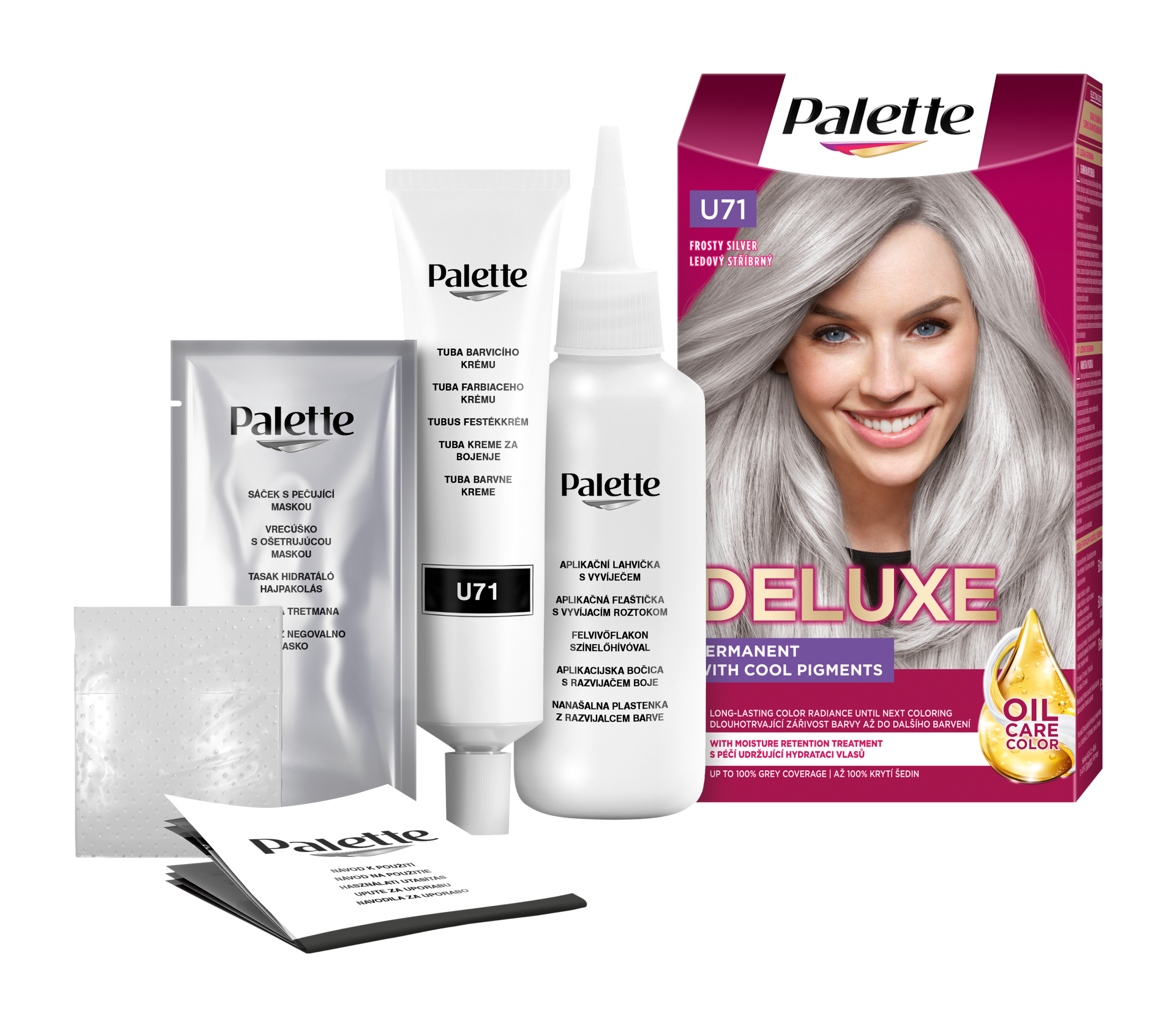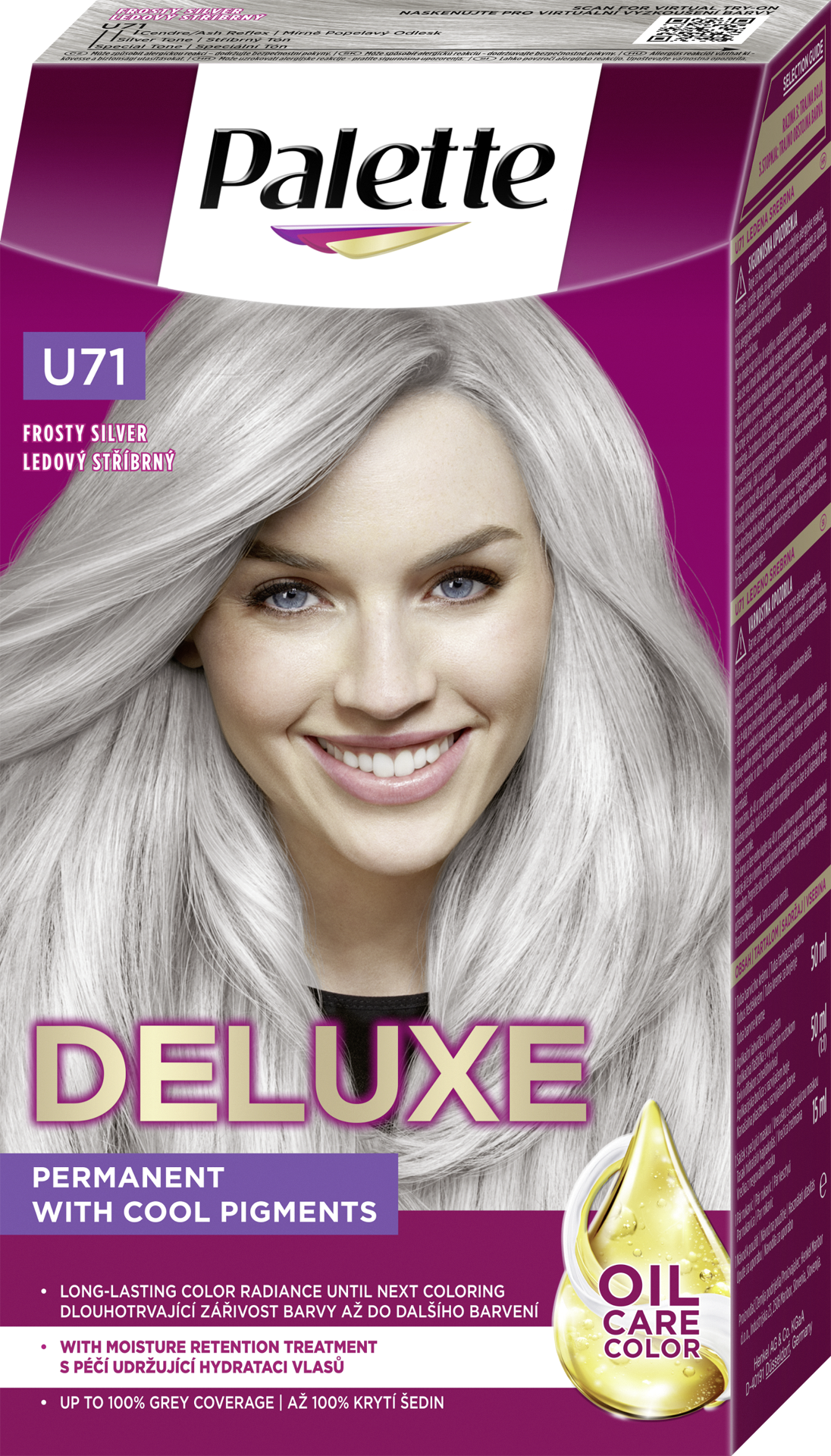 Palette Deluxe Oil Care barva na vlasy U71 Ledový stříbrný - Radost z barev s Deluxe. Permanentní barva na vlasy s až 100% krytím šedin Radujte se z barev s Palette Deluxe Oil Care: Bohaté složení Oil-in-creme s vysoce koncentrovanými pigmenty proniká do vlasů pro až 100% krytí šedin a poskytuje dlouhotrvající zářivost barvy až do dalšího barvení. Speciálně vyvinutá péče, která udržuje hydrataci vlasů, přináší pocit hloubkové hydratace a hedvábně hladkých a zdravě vypadajících vlasů. Složení bez silikonů také zlepšuje hebkost vlasů, usnadňuje jejich rozčesávání a dodává jim neodolatelný lesk. Složení Palette Deluxe je až z 93 % přírodního původu*. Krabička má certifikaci FSC. Hliníková tuba a příbalový leták jsou recyklované. Společně vytváříme krásné okamžiky pro barevný a udržitelný svět.