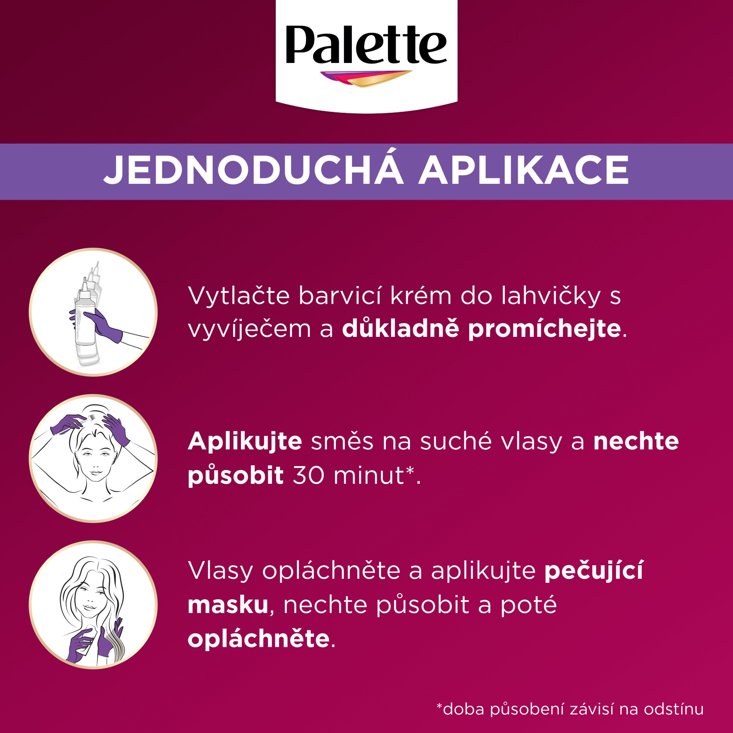 Jak postupovat: 1. Vytlačte obsah pečujícího barvicího krému Palette do lahvičky aplikátoru s vyvíječem a dobře promíchejte. 2. Směs rovnoměrně naneste pomocí aplikační lahvičky na suché předem nemyté vlasy a nechte působit 30-45 minut. 3. Oplachujte vlažnou vodou, dokud nepoteče zcela čirá. Poté použijte pečující masku, která je součástí balení.