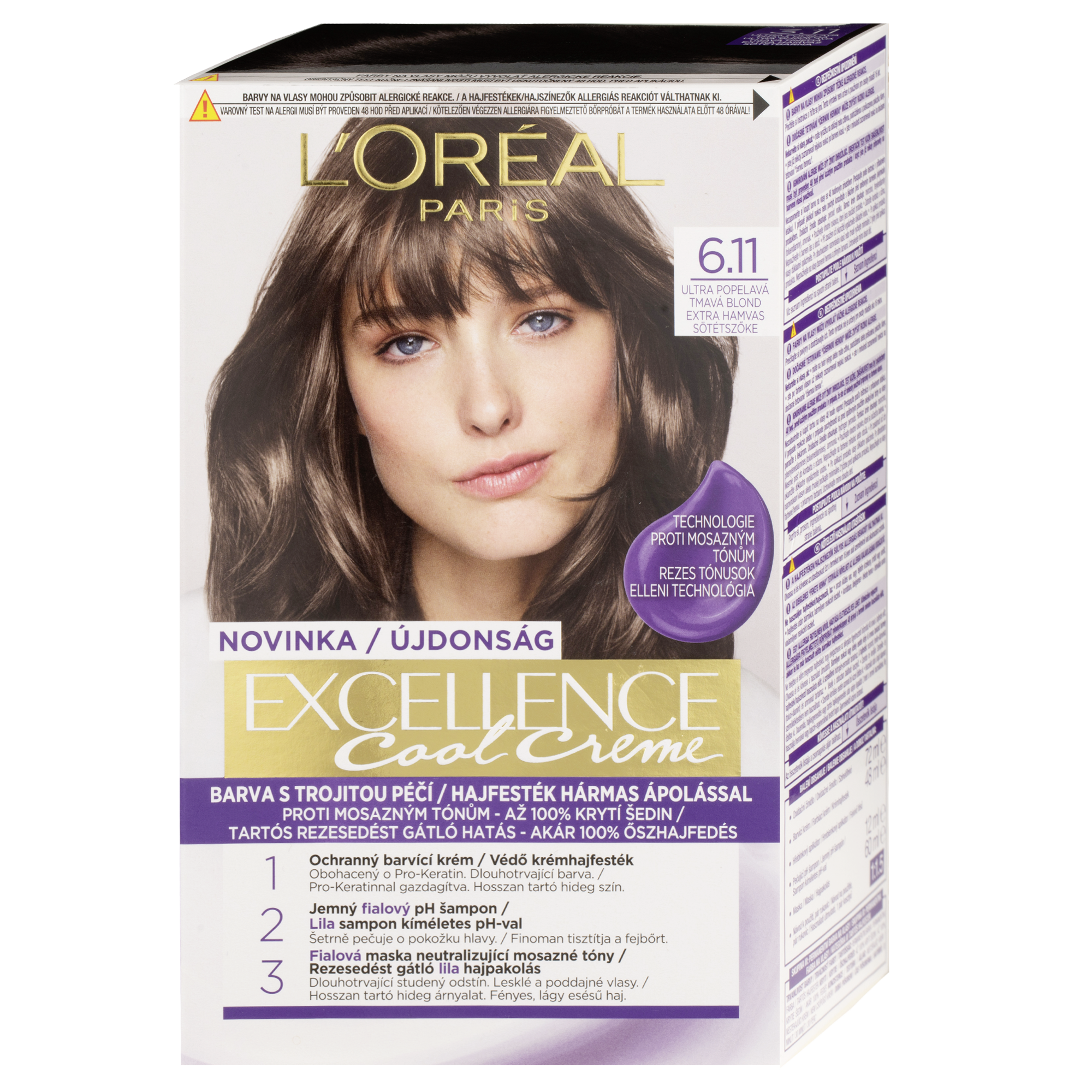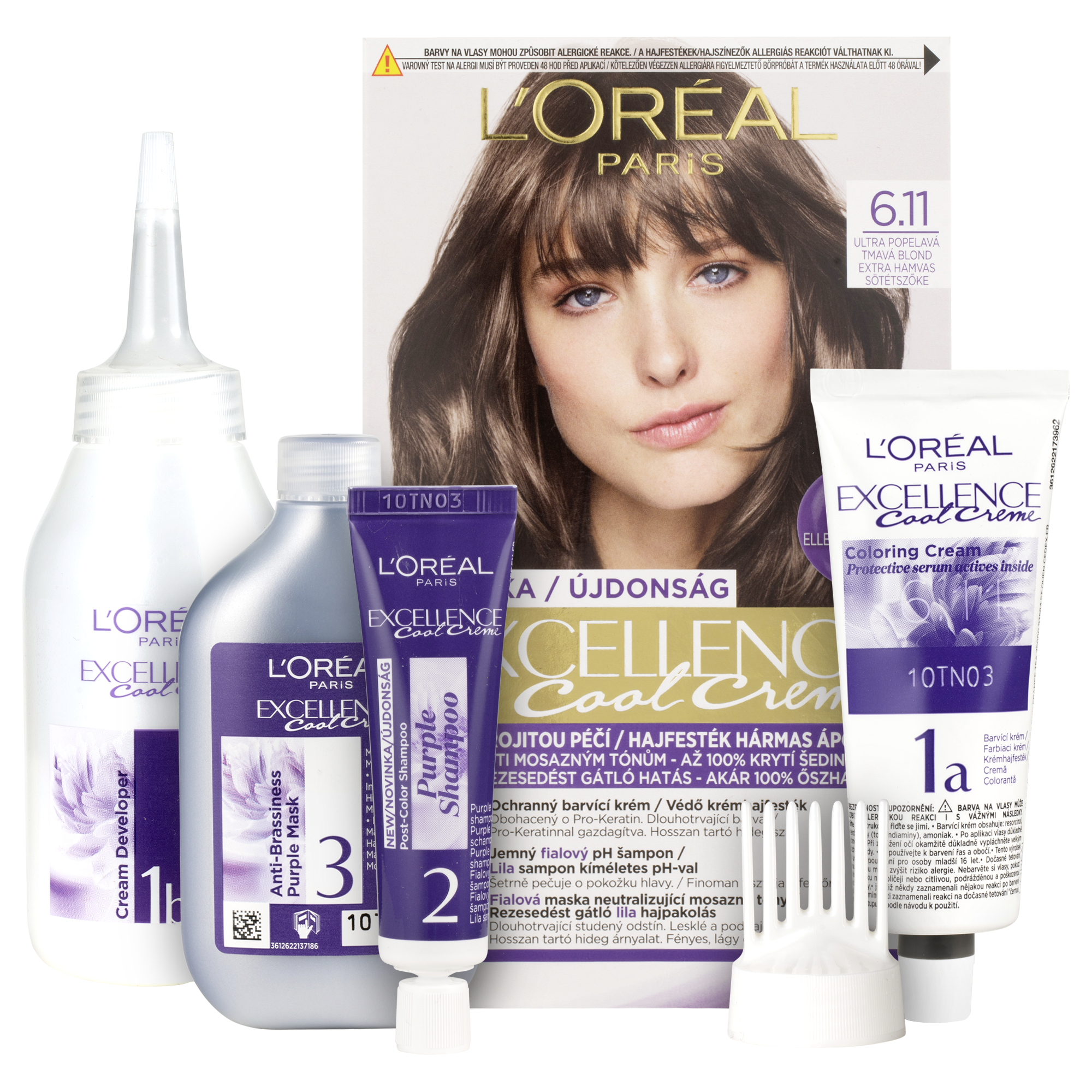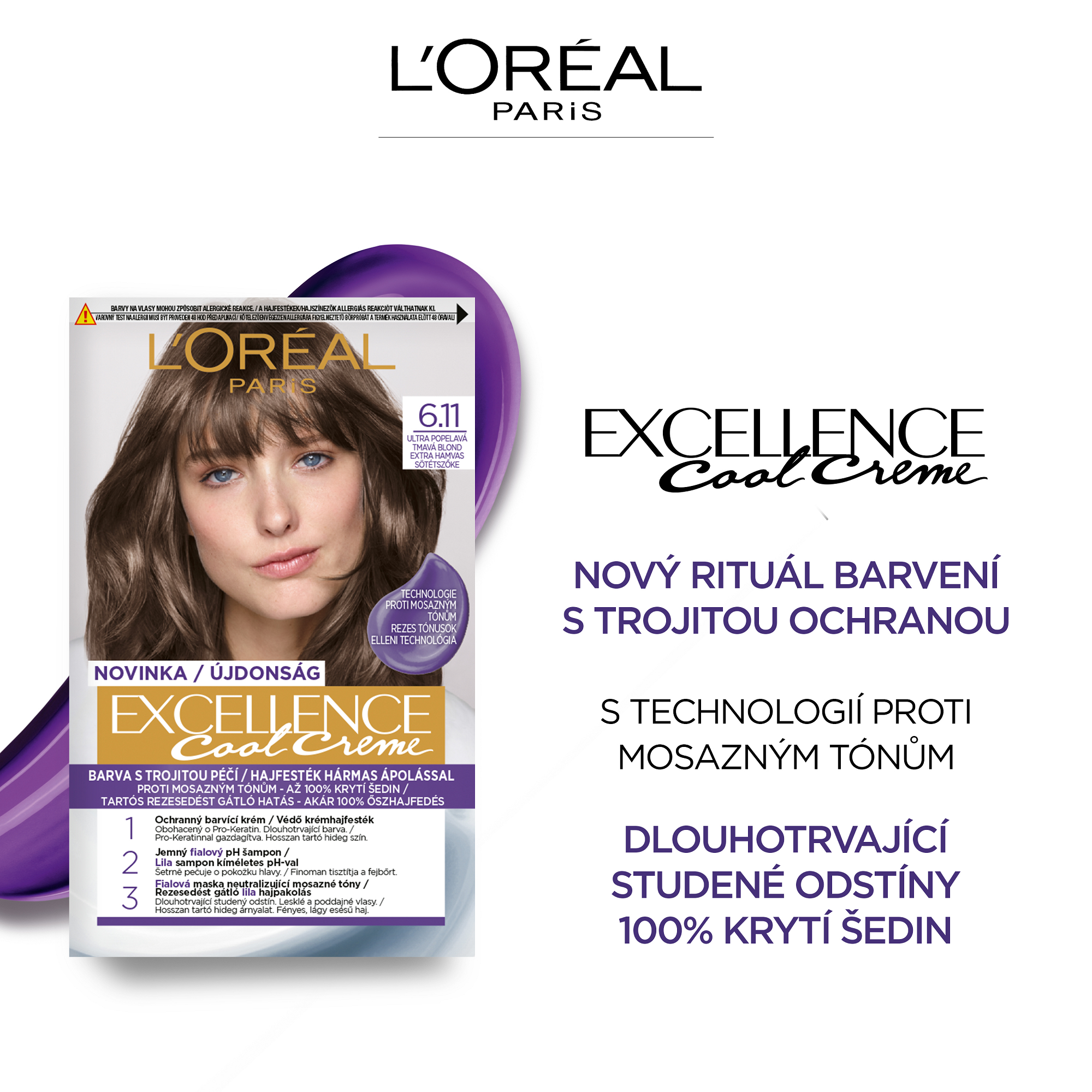 Jak funguje v barvách na vlasy? 1. V ochranném barvicím krému dodává vlasům hloubkovou hydrataci a až 2x bohatší barevný výsledek*. 2. Ve vyživující masce přináší až 5x větší hydrataci** pro dlouhodobou zářící barvu. Excellence Cool Creme má také šampon s jemným pH a masku proti mosazným tónům obohacenou o Purple technologii, pro studený barevný výsledek.