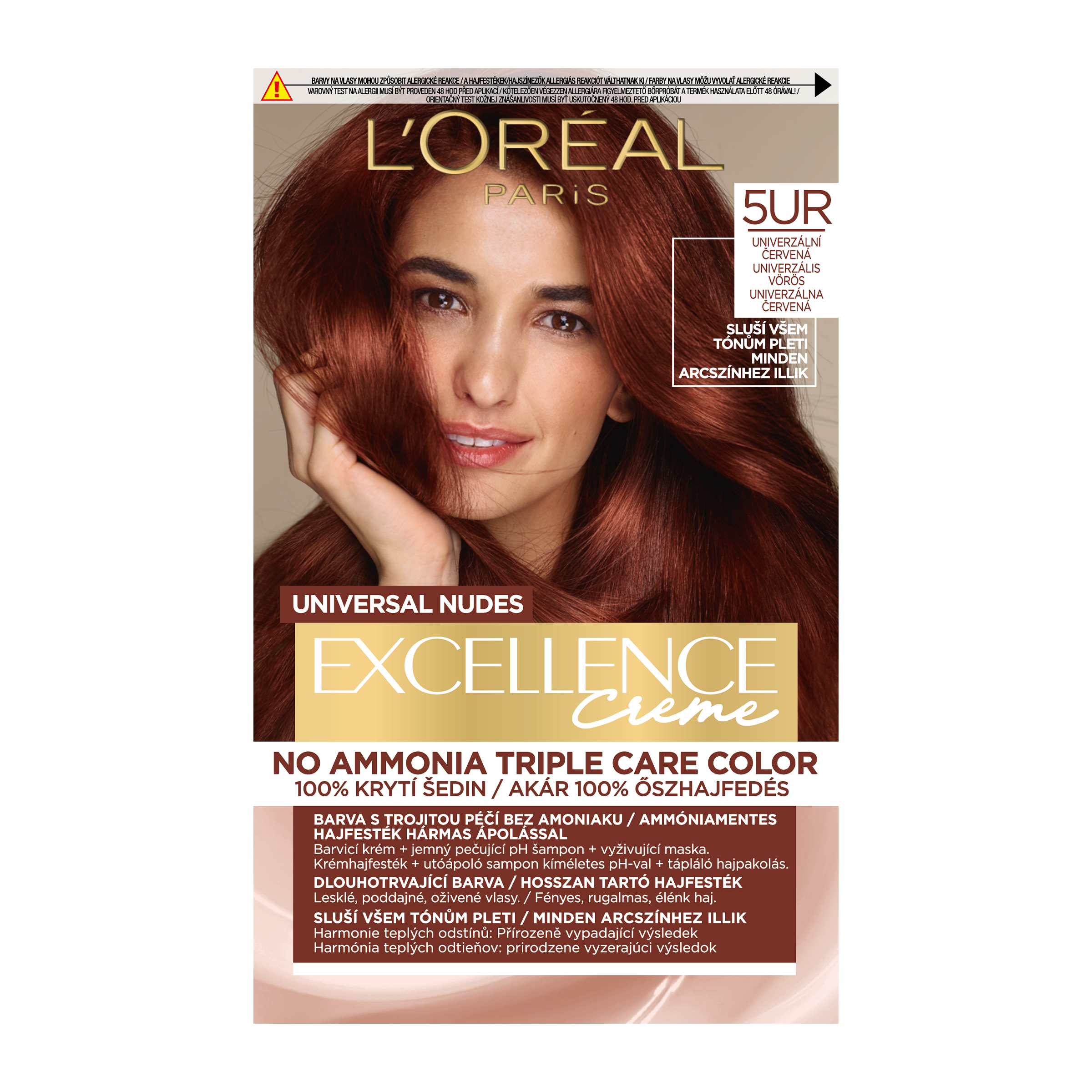 Intenzivní permanentní barva ve složení bez amoniaku, obohacené o ochranné složky. L'Oréal Paris Excellence přichází s rituálem barvení s trojí ochranou, který se stará o vaši barvu, pokožku hlavy i o vaše vlasy.To vše díky pečujícímu barvicímu krému, jemnému pečujícímu pH šamponu a vyživující masce. Vaše vlasy zanechá hladké a plné lesku s přirozeně vypadající barvou. Kryje až 100 % šedin. Excellence Nudes Copper navíc přináší odraz UR, který unikátně spojuje delikátní teplé odstíny pro barevný výsledek, který je harmonický s každým typem pleti a vypadá přirozeně*. *Testováno na přirozených kombinacích barvy vlasů a tónů pleti dle vědeckých publikací.