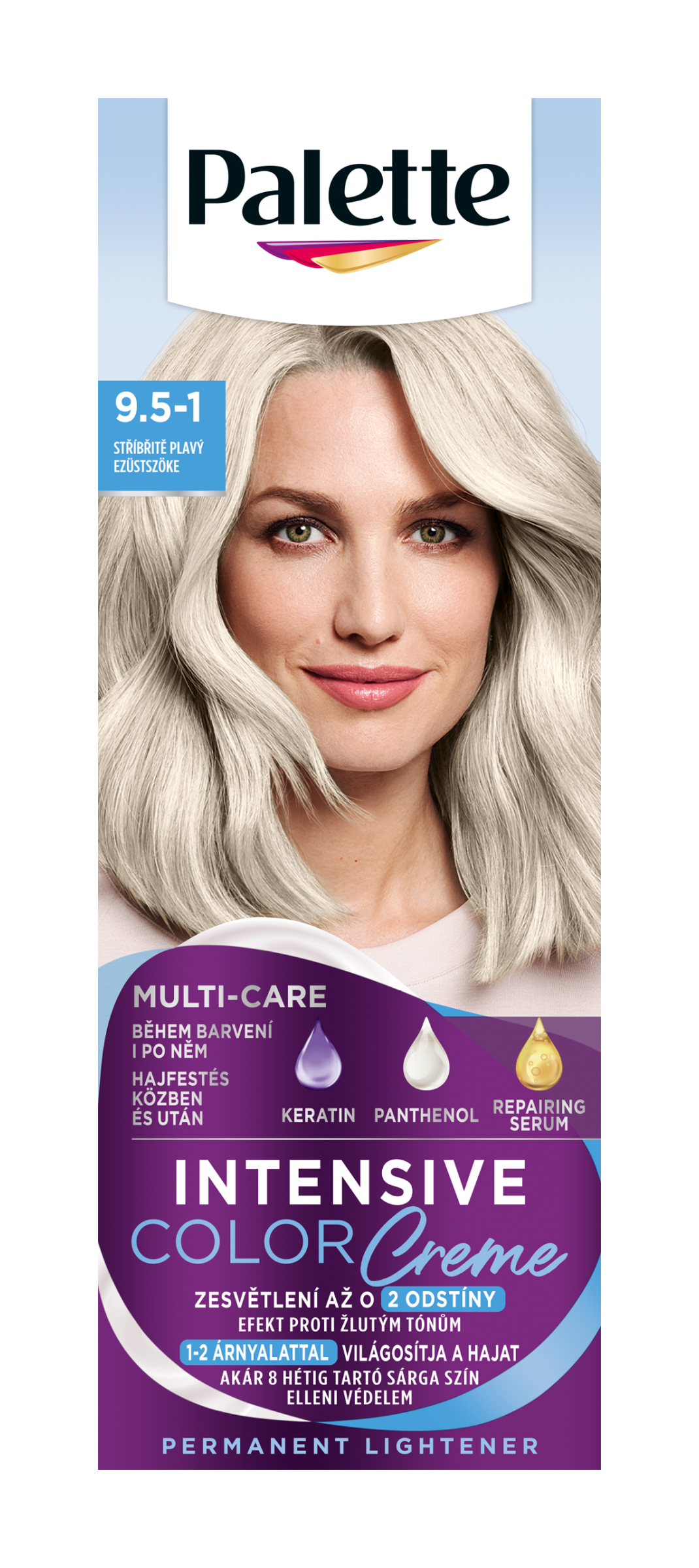 Objevte Palette Intensive Color Creme intenzivní zesvětlovač s MULTI-CARE recepturou pro dlouhotrvající a intenzivní barevný výsledek. Složení obsahuje speciální mix blond pigmentů, které pronikají hluboko do vlasového vlákna pro efekt proti žlutým tónům až po dobu 8 týdnů. Výsledkem je tak dlouhotrvající intenzita barvy a zesvětlení až o 2 odstíny. Nová MULTI-CARE receptura díky keratinu, panthenolu a regeneračnímu séru navíc chrání vaše vlasy a poskytuje jim komplexní péči během barvení a po něm. Keratin slouží jako ochranný štít, který vlasy chrání během barvení i po něm. Panthenol vlasy intenzivně vyživuje a viditelně zlepšuje jejich kvalitu. Regenerační sérum je navrženo k obnovení a zjemnění vlasového vlákna.Tento odstín je vhodný pro předzesvětlené vlasy až světle plavé vlasy. Nedoporučuje se pro šedivé vlasy.
