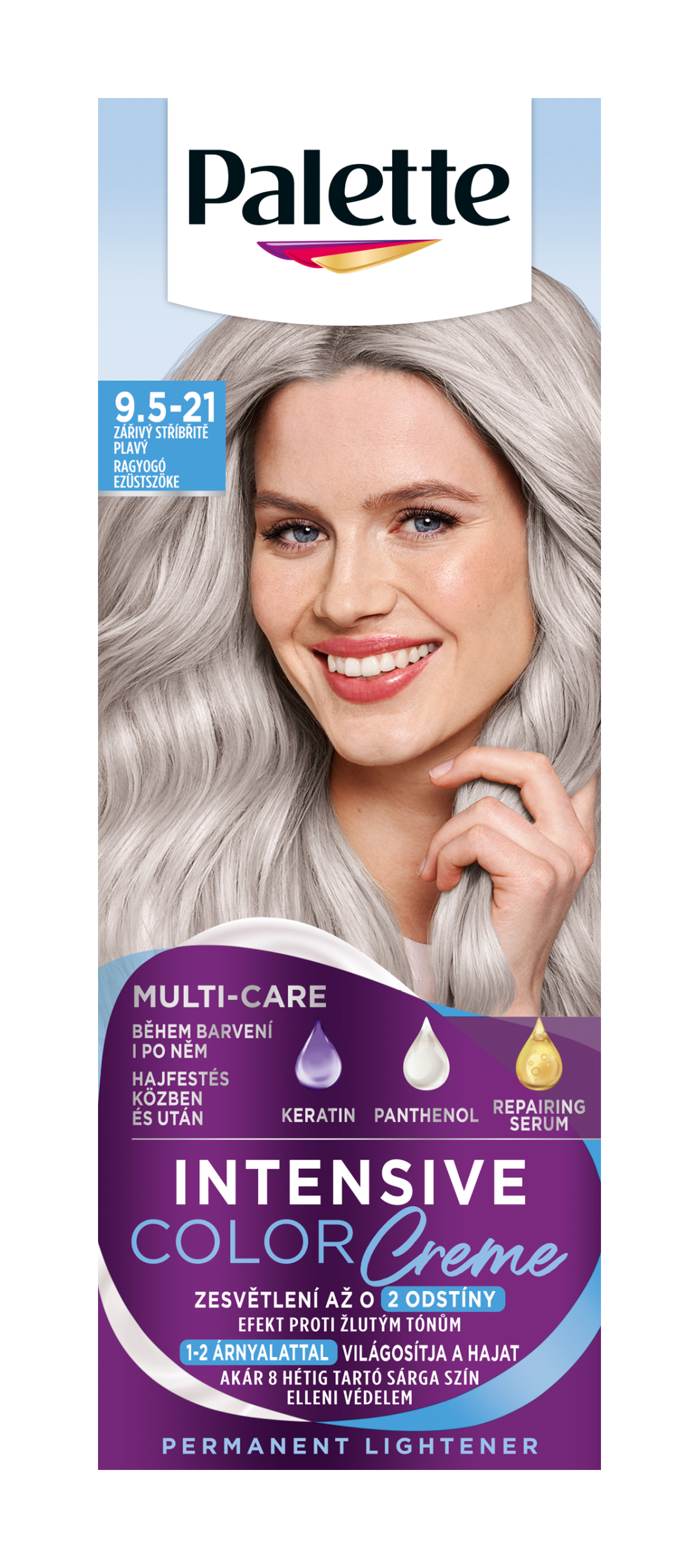 Objevte Palette Intensive Color Creme intenzivní zesvětlovač s MULTI-CARE recepturou pro dlouhotrvající a intenzivní barevný výsledek. Složení obsahuje speciální mix blond pigmentů, které pronikají hluboko do vlasového vlákna pro efekt proti žlutým tónům až po dobu 8 týdnů. Výsledkem je tak dlouhotrvající intenzita barvy a zesvětlení až o 2 odstíny. Nová MULTI-CARE receptura díky keratinu, panthenolu a regeneračnímu séru navíc chrání vaše vlasy a poskytuje jim komplexní péči během barvení a po něm. Keratin slouží jako ochranný štít, který vlasy chrání během barvení i po něm. Panthenol vlasy intenzivně vyživuje a viditelně zlepšuje jejich kvalitu. Regenerační sérum je navrženo k obnovení a zjemnění vlasového vlákna.Tento odstín je vhodný pro předzesvětlené vlasy až světle plavé vlasy. Nedoporučuje se pro šedivé vlasy.