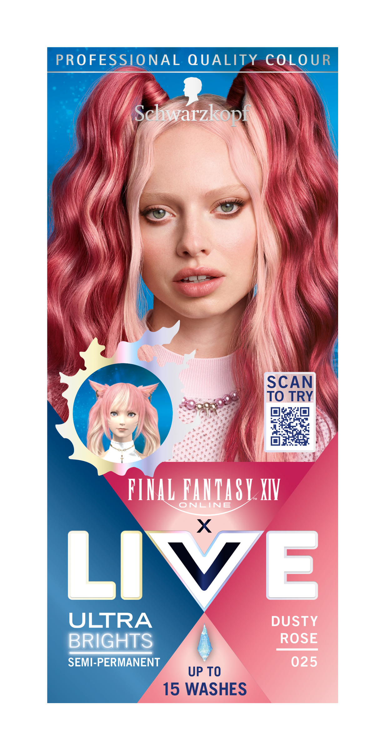 Vyjádřete svoji barevnou kreativitu s barvou na vlasy Schwarzkopf Live Ultra Brights. Tato semi-permanentní barva na vlasy Schwarzkopf Live, která vydrží až 15 umytí, zajistí 2 efekty v 1 produktu. Objevte intenzivní zářivost barev díky obsahu elektrizujících pigmentů, nebo zkuste pastelový tón, který získáte smícháním barvicího krému s přiloženým kondicionérem. Barva byla inspirována hrou Final Fantasy XIV Online. Složení je veganské a vyrobené s 0 % silikonů a alkoholu (ethanolu) a má certifikaci FSC. Tato kouřově růžová barva na vlasy se doporučuje pro odbarvené až světlé blond vlasy. Pokud máte tmavší vlasy, doporučujeme je zesvětlit pomocí Schwarzkopf Live Intense Bleach zesvětlovače pro ještě zářivější barevný výsledek.
