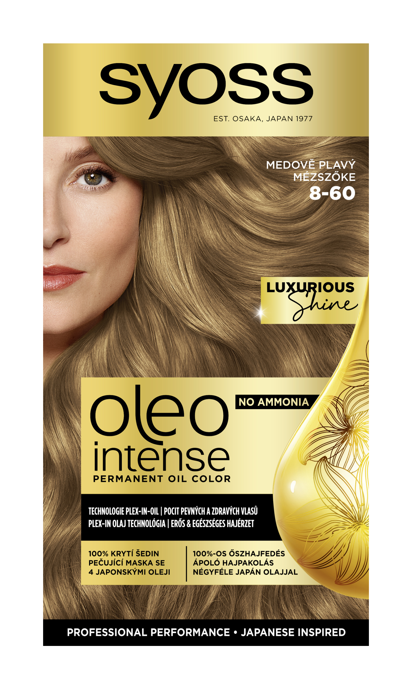 Objevte intenzivní, dlouhotrvající barvu s bohatým medově plavým odstínem díky permanentní barvě na vlasy Syoss Oleo Intense 8-60. Olejem posílená receptura bez amoniaku je navržená pro šetrné a efektivní barvení, které zajistí 100% krytí šedin a zároveň zanechá vlasy hebké, lesklé a zdravě vypadající. Maska s technologií plex-in-oil po procesu barvení obaluje vlasová vlákna jako štít, pro obnovu síly vlasů a zlepšení textury vlasů. Bohatá maska obsahuje kombinaci 4 japonských olejů. Dodává vašim vlasům závěrečnou výživu, zanechává je sametově hebké a plné luxusního lesku. Pečující receptura pomáhá barevným pigmentům proniknout hluboko do vlasových vláken pro sytou a dlouhotrvající barvu.