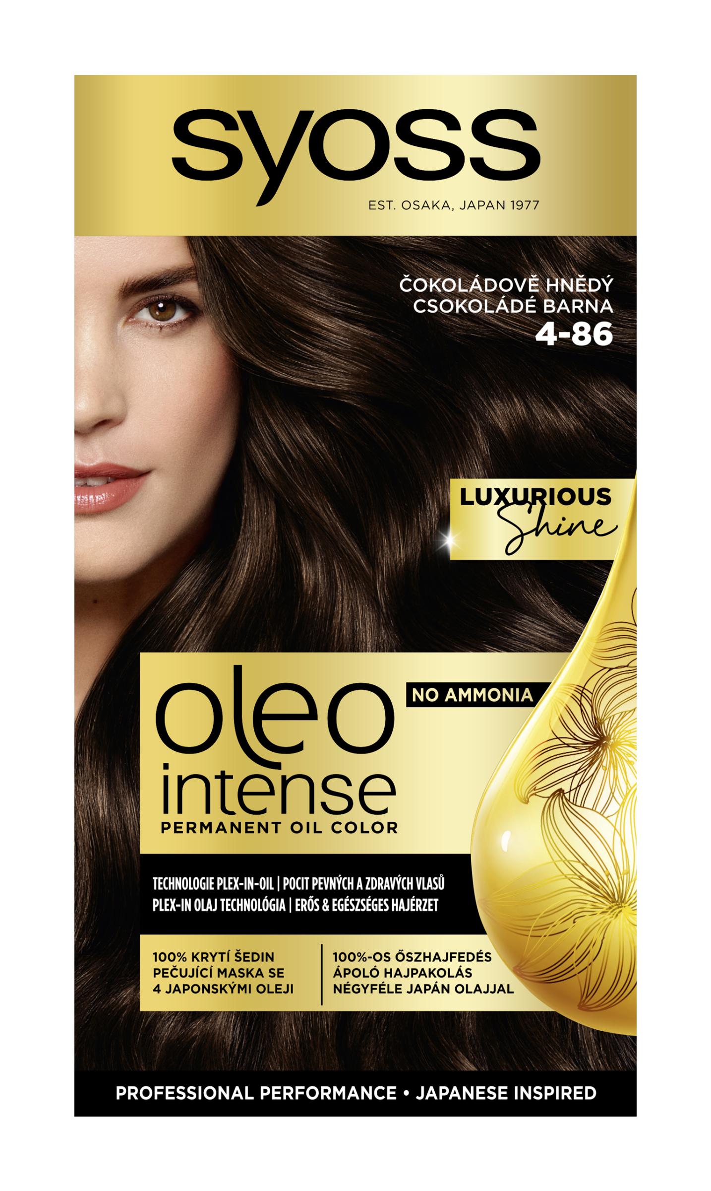 Objevte intenzivní, dlouhotrvající barvu s bohatým čokoládově hnědým odstínem díky permanentní barvě na vlasy Syoss Oleo Intense 4-86. Olejem posílená receptura bez amoniaku je navržená pro šetrné a efektivní barvení, které zajistí 100% krytí šedin a zároveň zanechá vlasy hebké, lesklé a zdravě vypadající. Maska s technologií plex-in-oil po procesu barvení obaluje vlasová vlákna jako štít, pro obnovu síly vlasů a zlepšení textury vlasů. Bohatá maska obsahuje kombinaci 4 japonských olejů. Dodává vašim vlasům závěrečnou výživu, zanechává je sametově hebké a plné luxusního lesku. Pečující receptura pomáhá barevným pigmentům proniknout hluboko do vlasových vláken pro sytou a dlouhotrvající barvu.