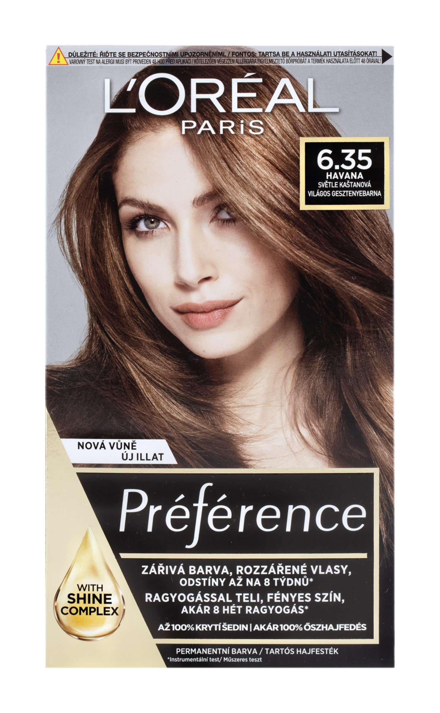 Luxusní permanentní barva na vlasy L’Oréal Paris Préférence dodává vlasům intenzivní barvu a oslnivý lesk. Zářivě lesklé vlasy vydrží až po dobu osmi týdnů. Složení je obohacené o Hi-Shine Complex a obsahuje odolné barvící složky. Až 100% kryje šediny. Balení obsahuje i závěrečnou vyživující ochrannou péči s vitaminem E.