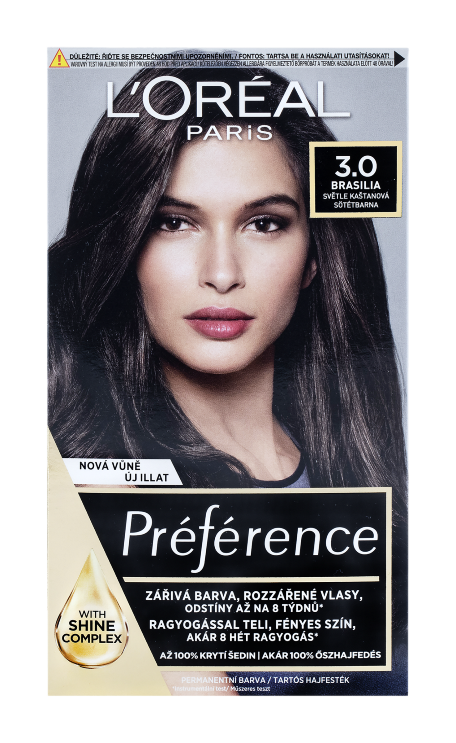 Luxusní barva na vlasy L’Oréal Paris Préférence dodá vašim vlasům oslnivý lesk. Zářivě lesklé vlasy si můžete užívat až po dobu osmi týdnů. Složení je obohacené o Hi-Shine Complex a obsahuje vysoko odolné barvící složky. Balení obsahuje i závěrečnou péči, která je obohacená UV filtrem a vitaminem E. Vaše vlasy tak zůstanou lesklé a hedvábně jemné. S ultra intenzivní dlouhotrvající barvou Préférence si dopřejete luxus, který si vaše vlasy zaslouží. Vysoká odolnost barvy po dobu 8 týdnů.