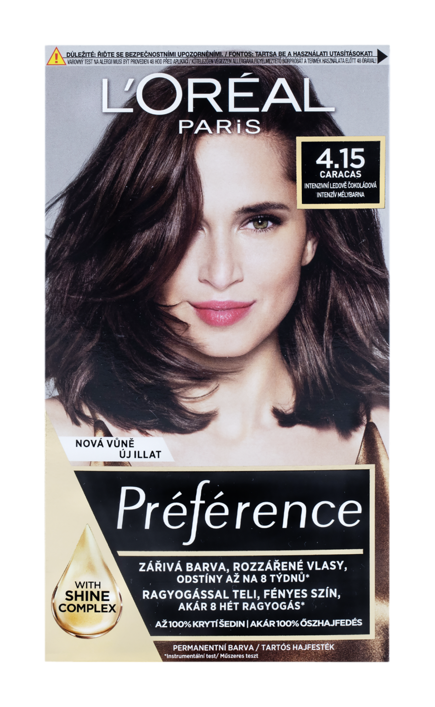 Luxusní barva na vlasy L’Oréal Paris Préférence 4.15 Caracas-Intenzivní ledová čokoládová dodá vašim vlasům oslnivý lesk. Zářivě lesklé vlasy si můžete užívat až po dobu osmi týdnů. Složení je obohacené o Hi-Shine Complex a obsahuje vysoko odolné barvící složky. Balení obsahuje i závěrečnou péči, která je obohacená UV filtrem a vitaminem E. Vaše vlasy tak zůstanou lesklé a hedvábně jemné. S ultra intenzivní dlouhotrvající barvou Préférence si dopřejete luxus, který si vaše vlasy zaslouží.