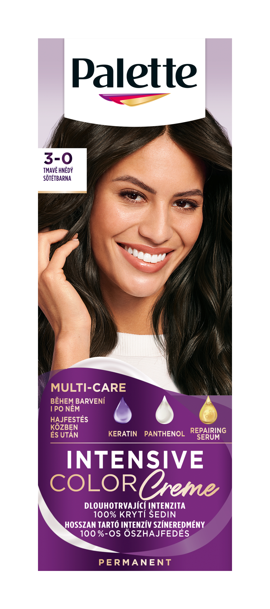Objevte Palette Intensive Color Creme s MULTI-CARE recepturou pro dlouhotrvající a intenzivní barevný výsledek. Složení s vysoce intenzivními pigmenty proniká hluboko do vlasů a ukotvuje v nich barvu pro ochranu proti vyblednutí. Výsledkem je tak dlouhotrvající intenzita barvy po několik týdnů a 100% krytí šedin. Nová MULTI-CARE receptura díky keratinu, panthenolu a regeneračnímu séru navíc chrání vaše vlasy a poskytuje jim komplexní péči během barvení a po něm. Keratin slouží jako ochranný štít, který vlasy chrání během barvení i po něm. Panthenol vlasy intenzivně vyživuje a viditelně zlepšuje jejich kvalitu. Regenerační sérum je navrženo k obnovení a zjemnění vlasového vlákna. Tento odstín je vhodný pro světle plavé až černohnědé vlasy. Vhodný i na úplně šedivé vlasy.