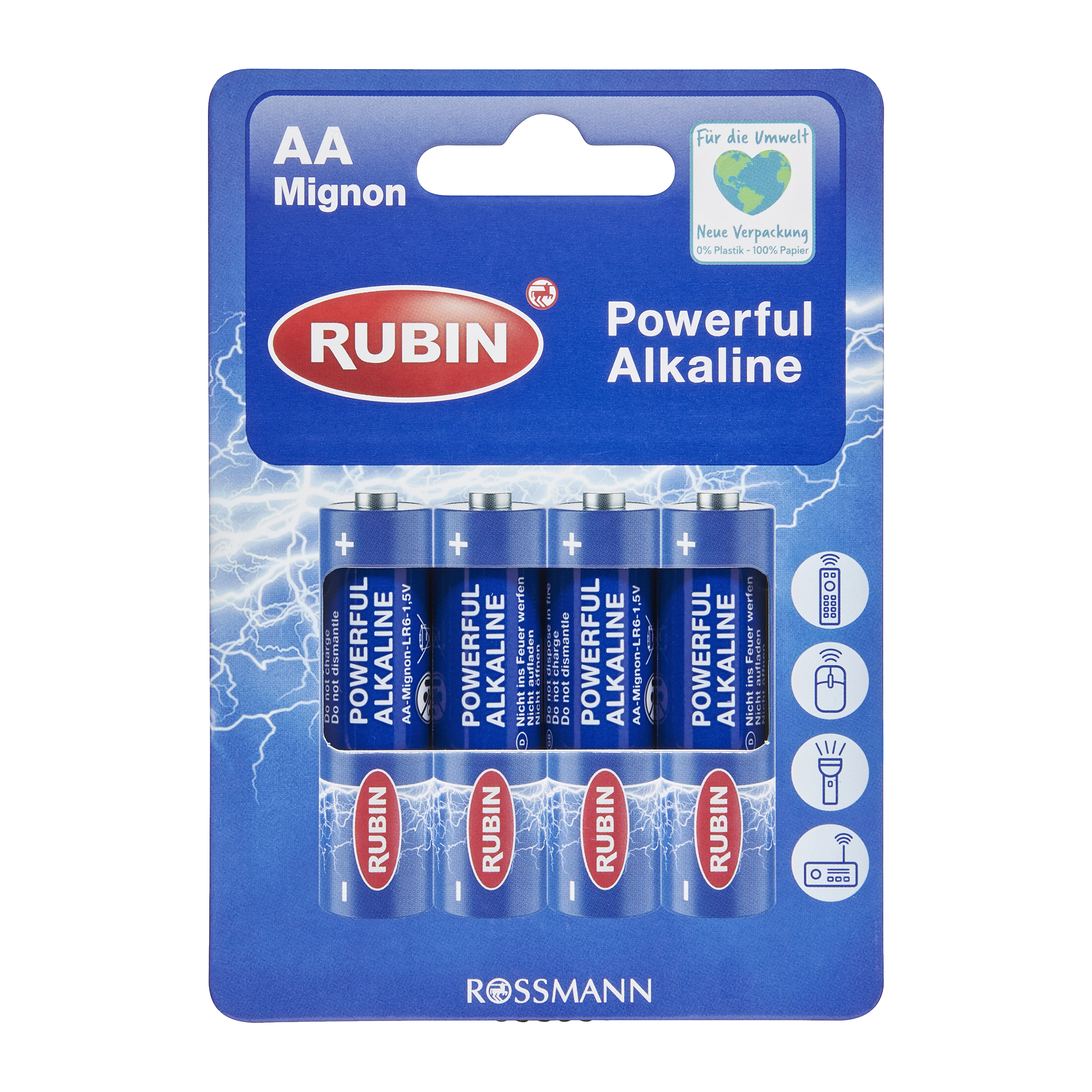 Při správném používání vám RUBIN baterie nabízí výkonný zdroj energie s dlouhou životností. Jsou odolné proti úniku a zaručeně bez kadmia a rtuti. Doporučují se pro běžná standardní zařízení používaná v každodenním životě, jako jsou digitální fotoaparáty, dálková ovládání, rádia a další hudební přehrávače, jako jsou přehrávače MP3 atd.